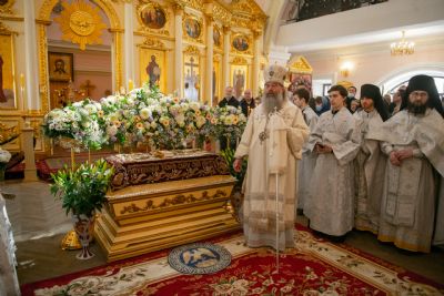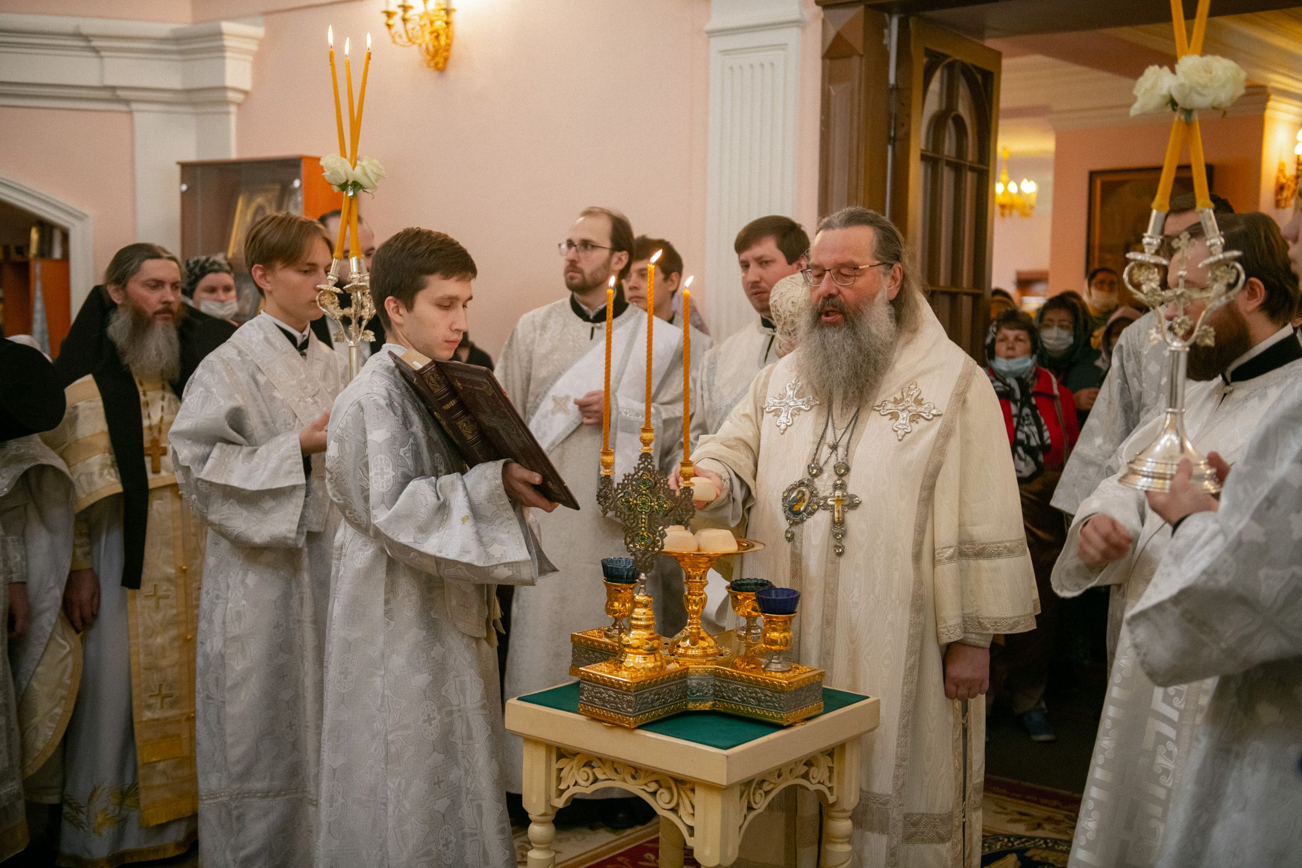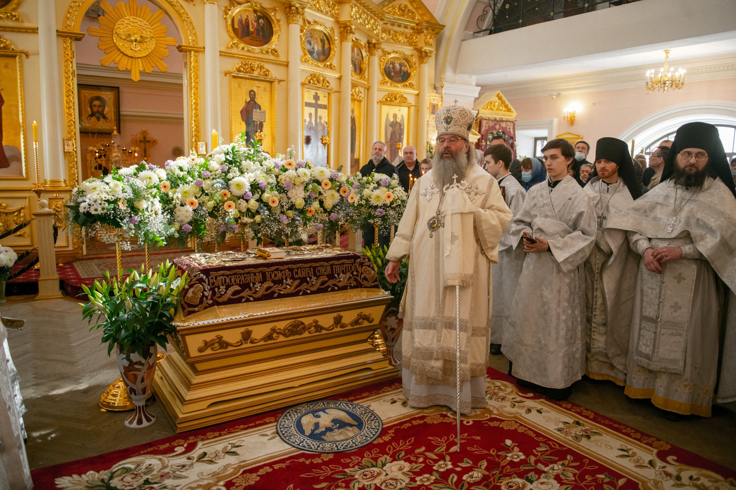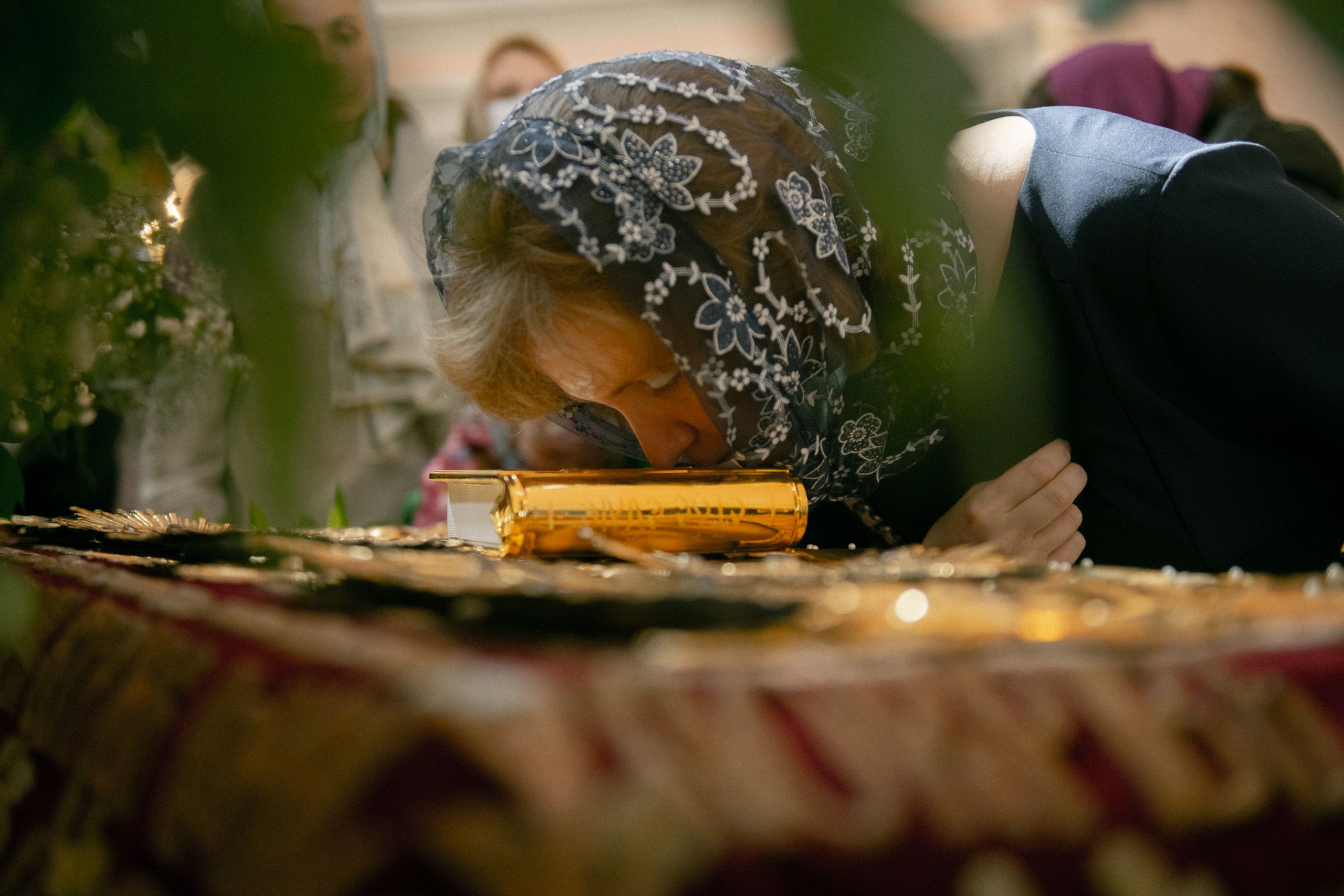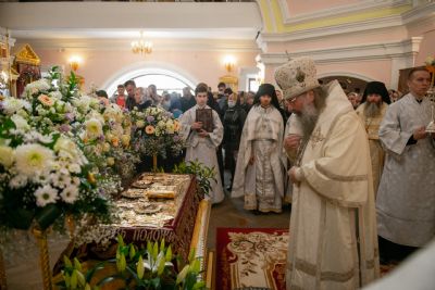 После отпуста архипастырь совершил благословение хлебов и вина. Затем духовенство и верующие поклонились перед Святой Плащаницей Спасителя.