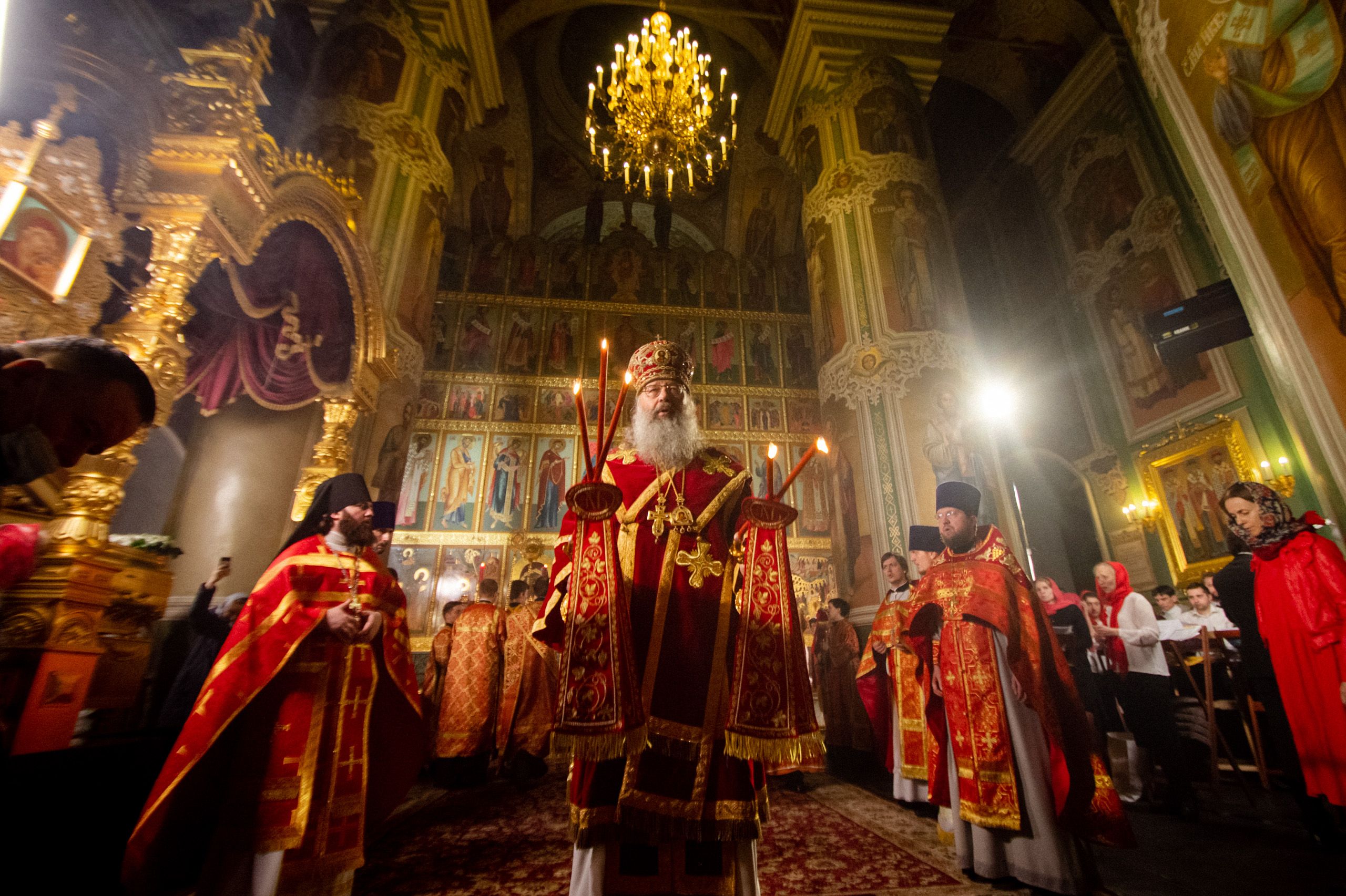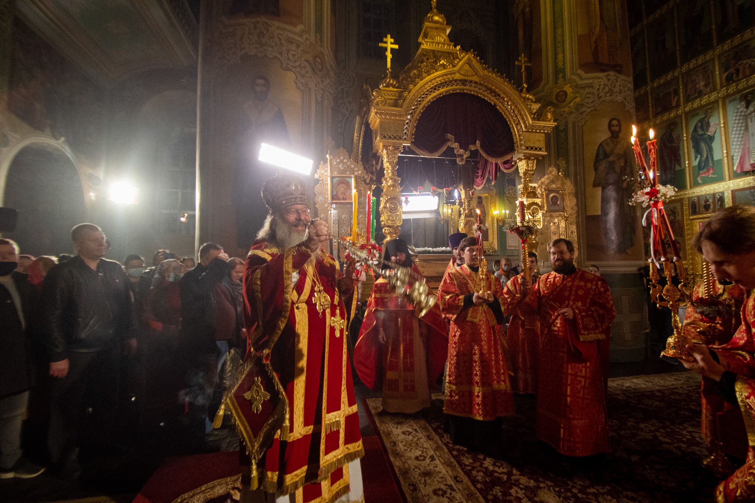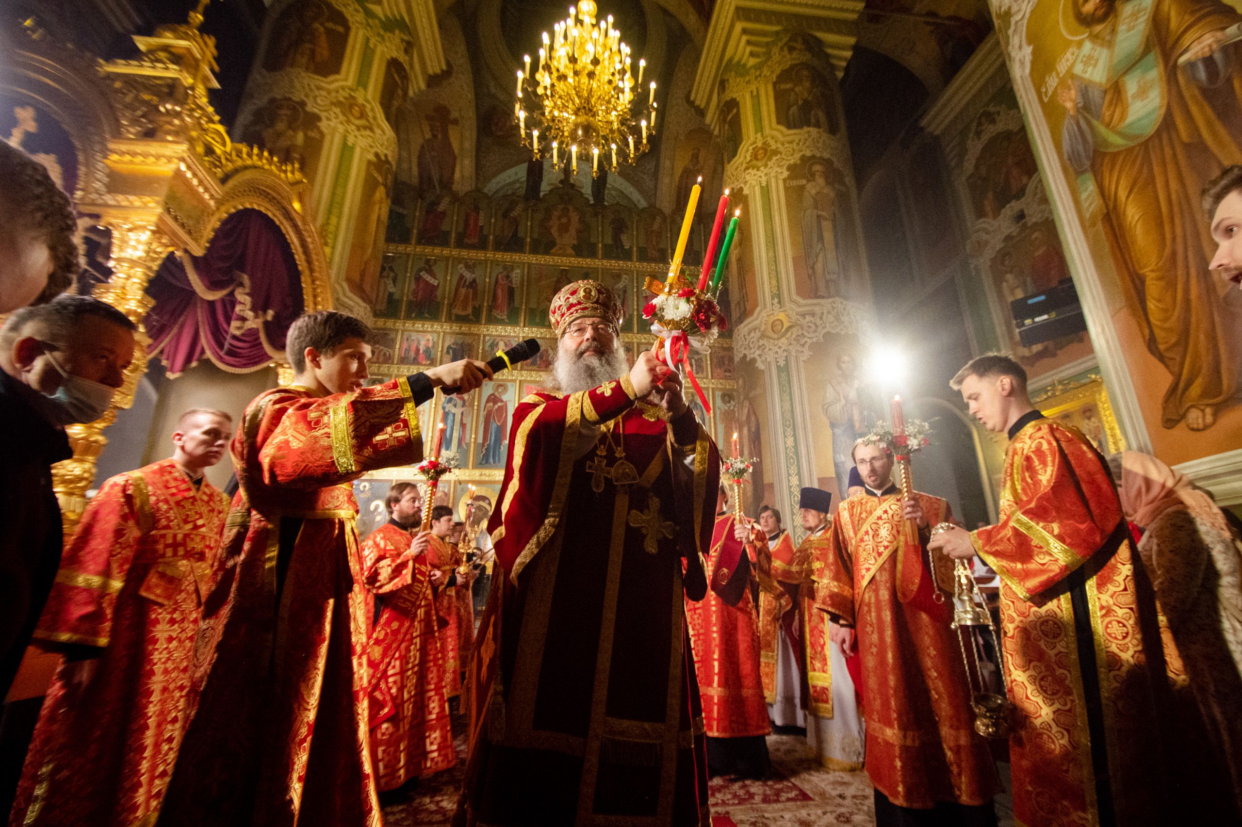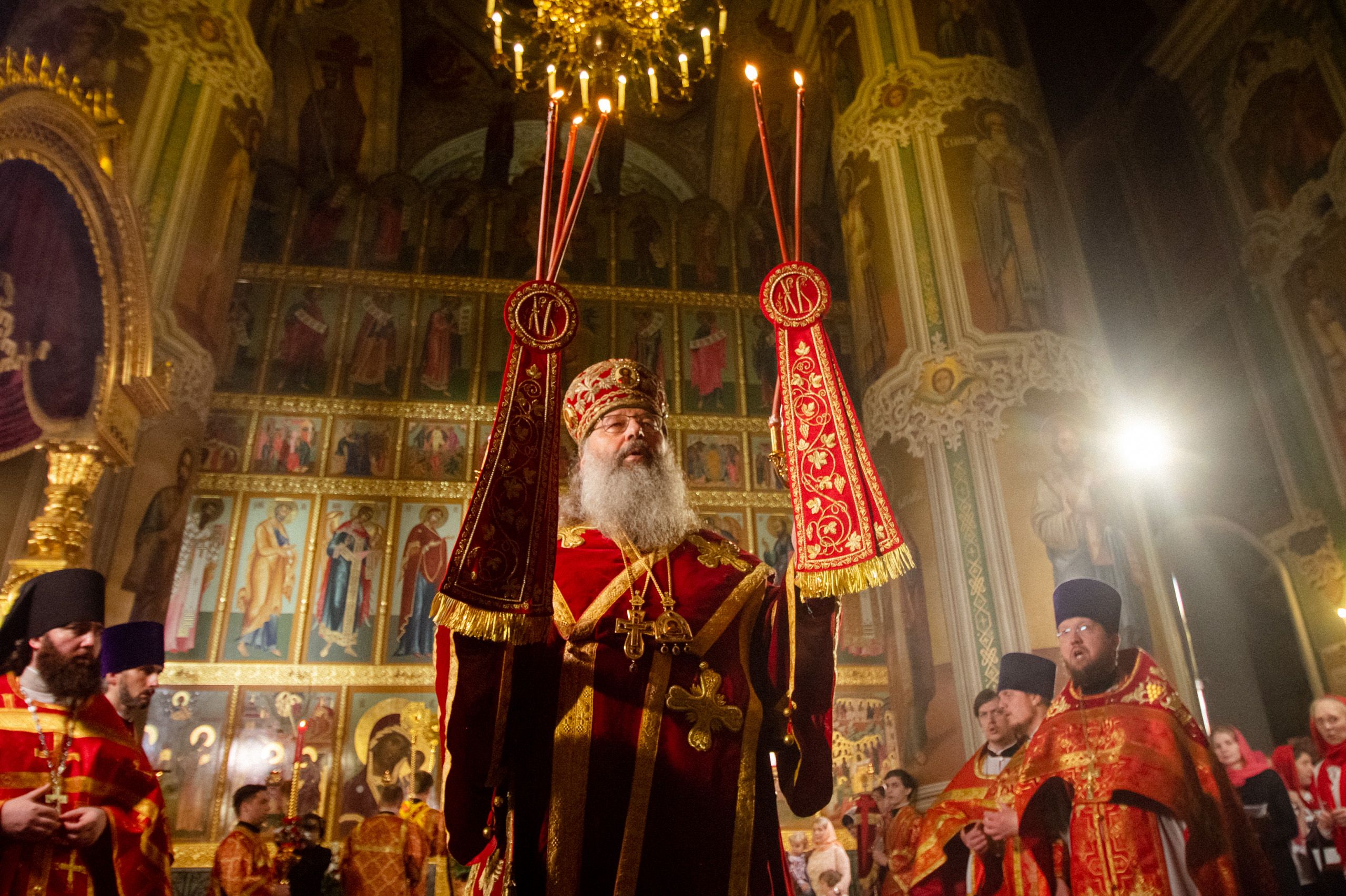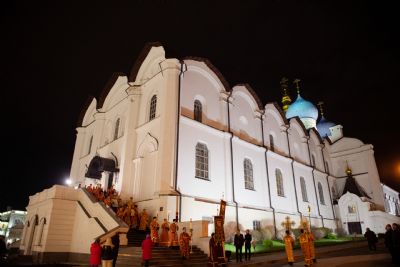 Я очень рад, что в святую пасхальную ночь мы с вами собрались в этом замечательном храме. Здесь молились святитель Гурий, святитель Герман, святитель Ермоген, священномученик Кирилл, митрополит Ефрем и другие светочи веры. В 461 раз в этом соборе совершается празднование Пасхи.