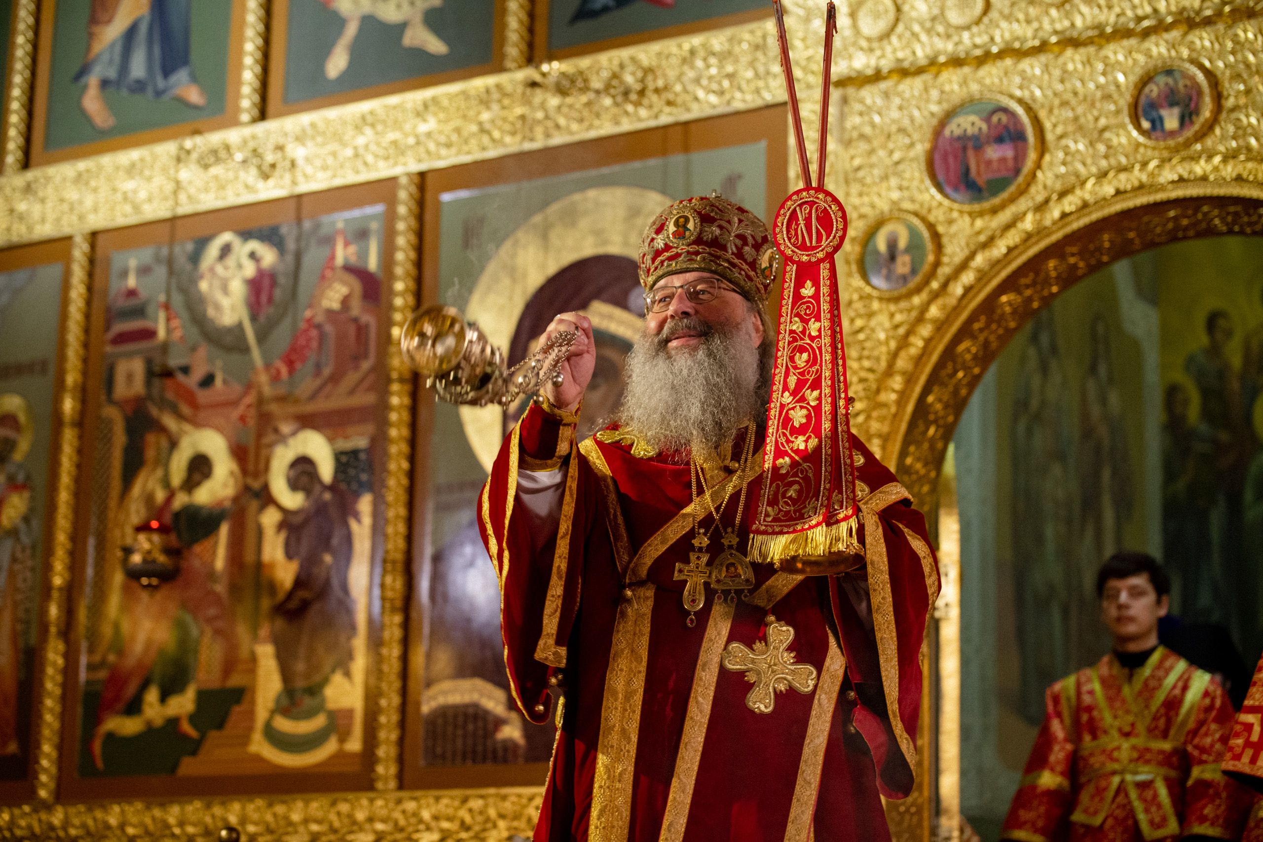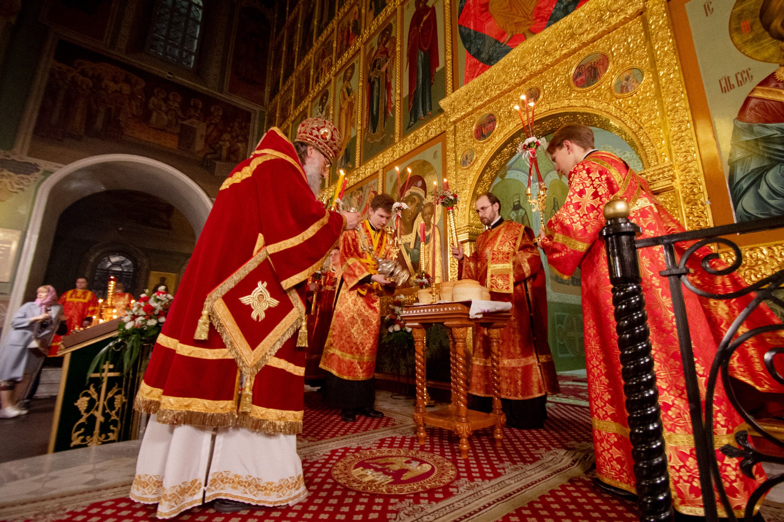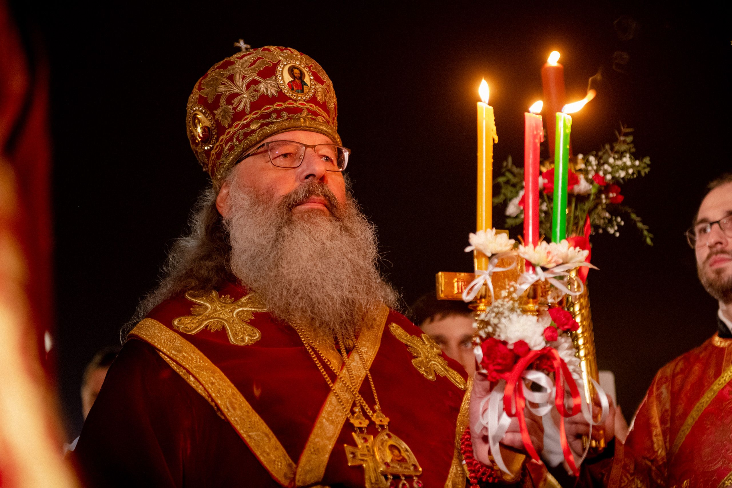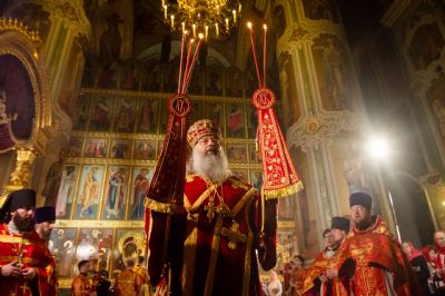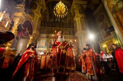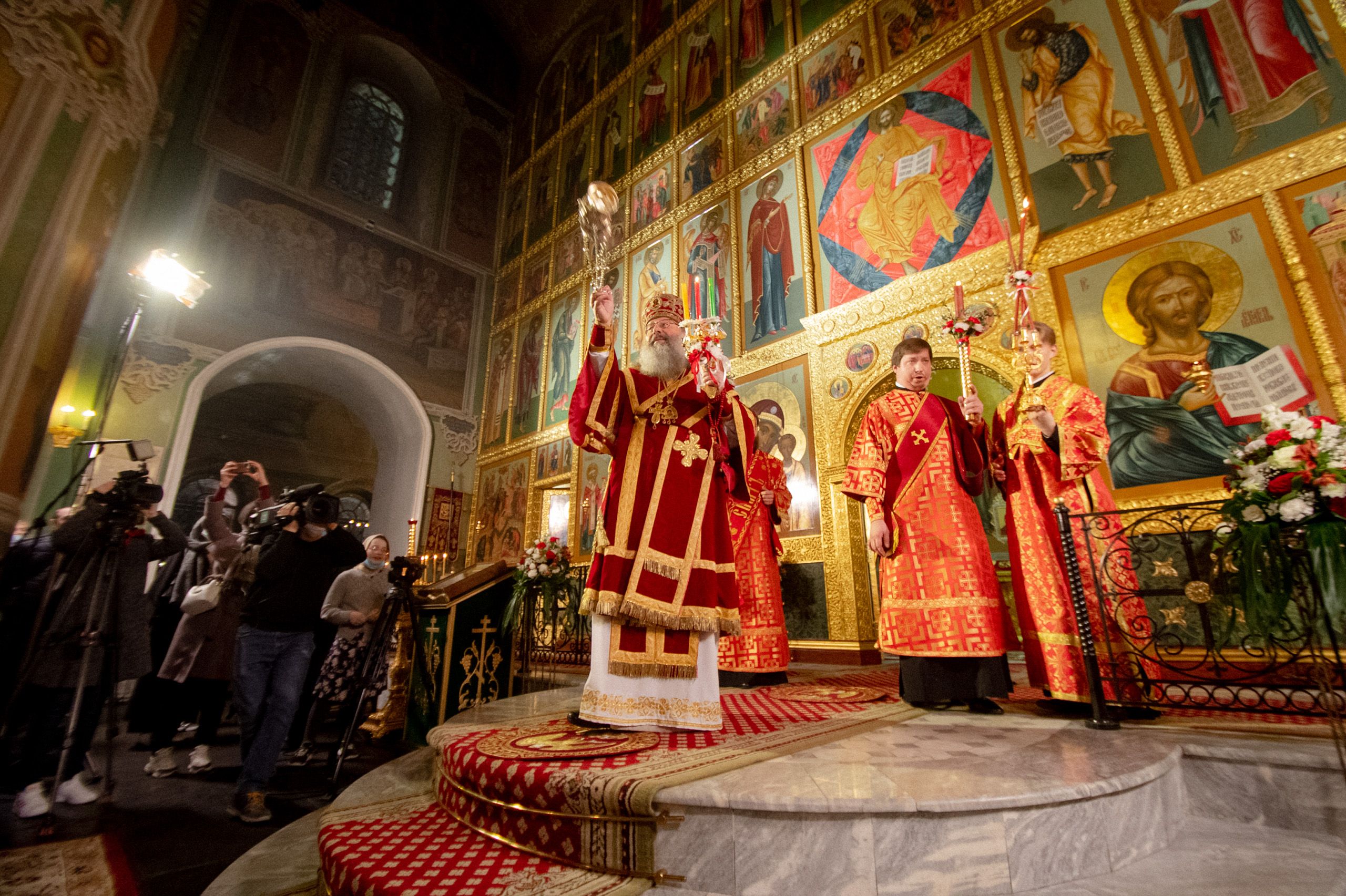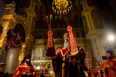Я очень рад, что в святую пасхальную ночь мы с вами собрались в этом замечательном храме. Здесь молились святитель Гурий, святитель Герман, святитель Ермоген, священномученик Кирилл, митрополит Ефрем и другие светочи веры. В 461 раз в этом соборе совершается празднование Пасхи.