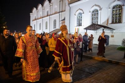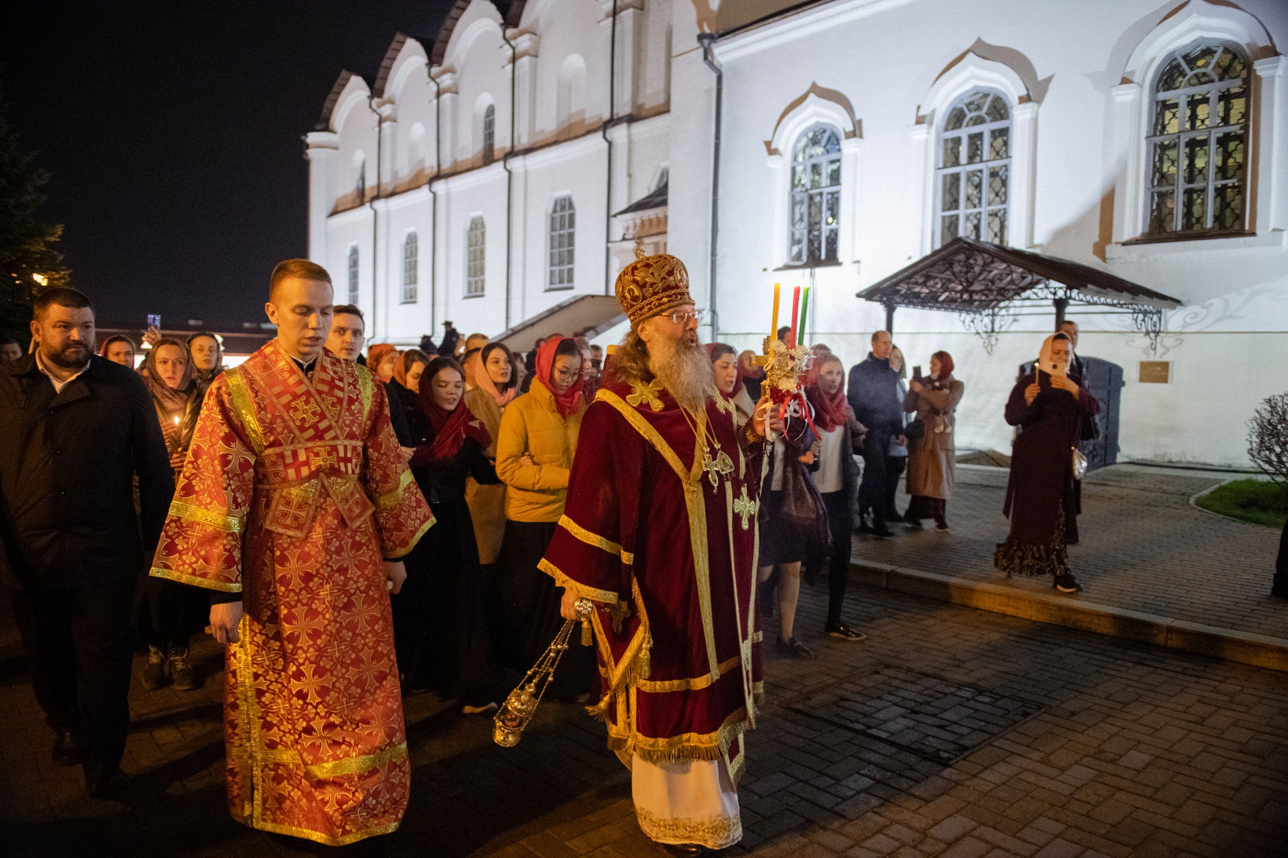 В полночь при пении стихиры «Воскресение Твое, Христе Спасе…» духовенство и верующие совершили крестный ход вокруг Благовещенского собора.