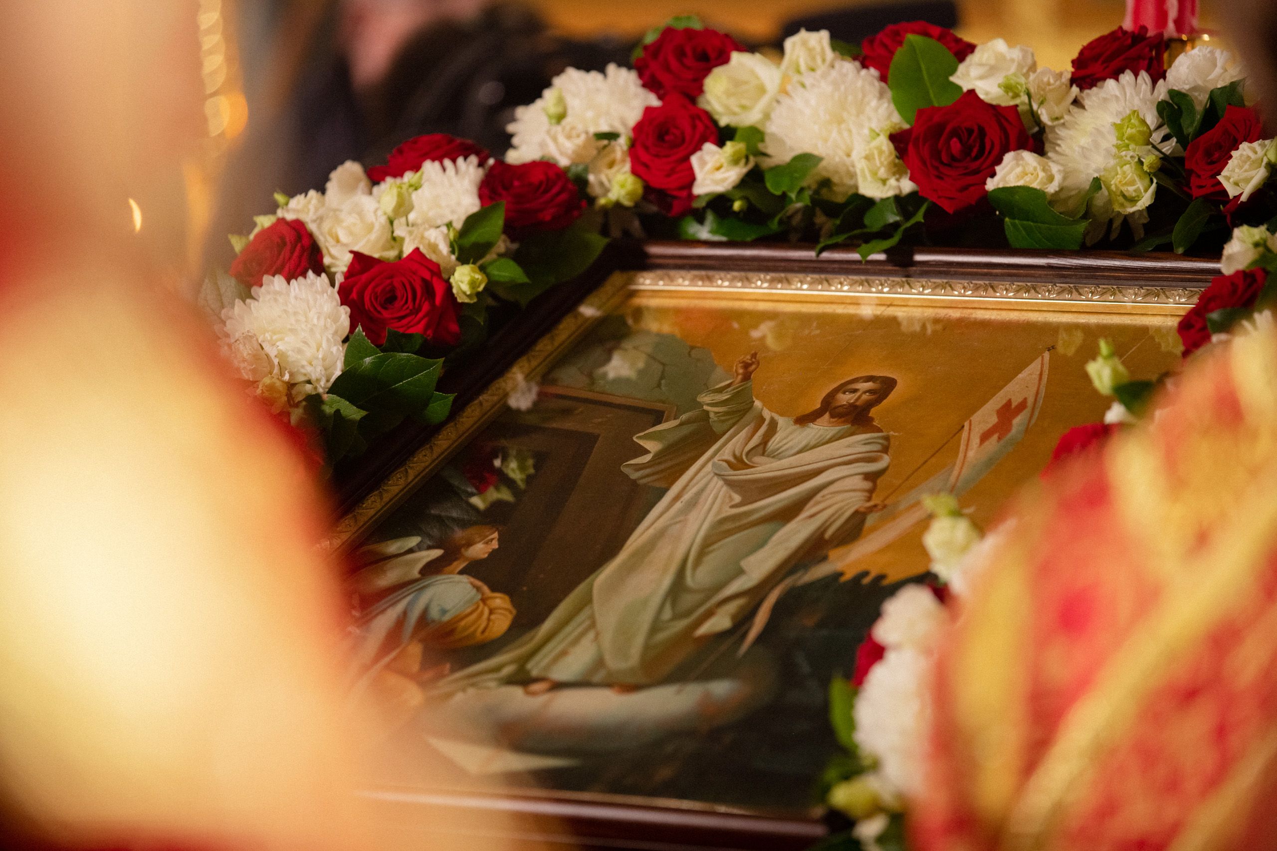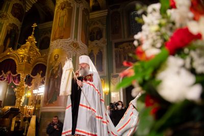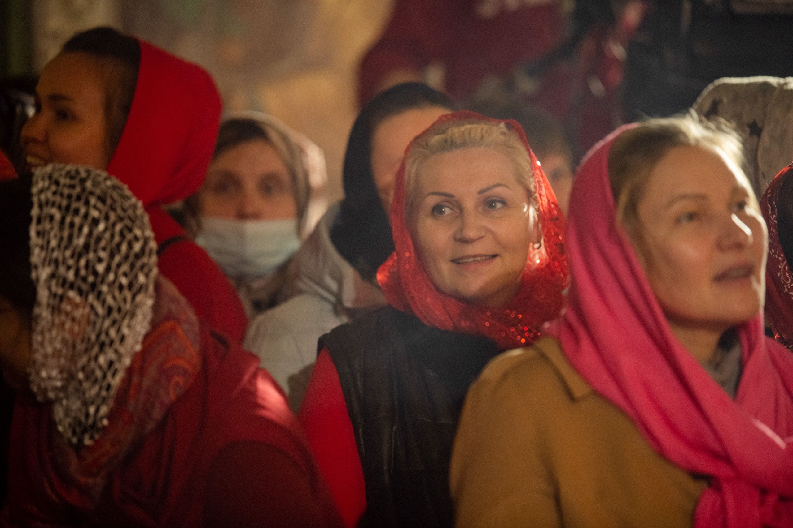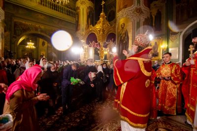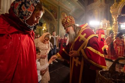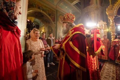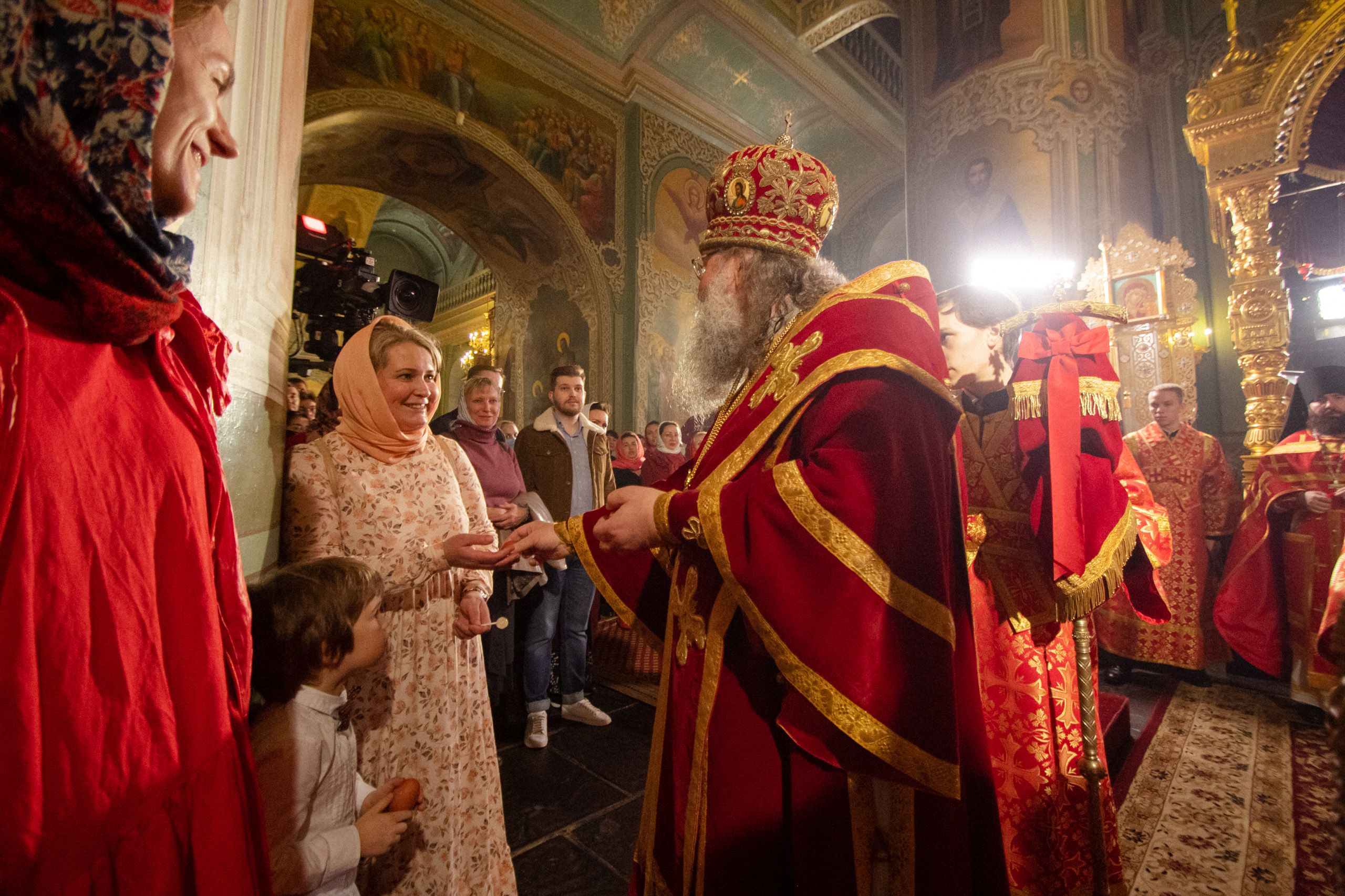 В конце утрени после чтения огласительного слова святителя Иоанна Златоуста архипастырь и священнослужители раздали верующим пасхальные яйца.