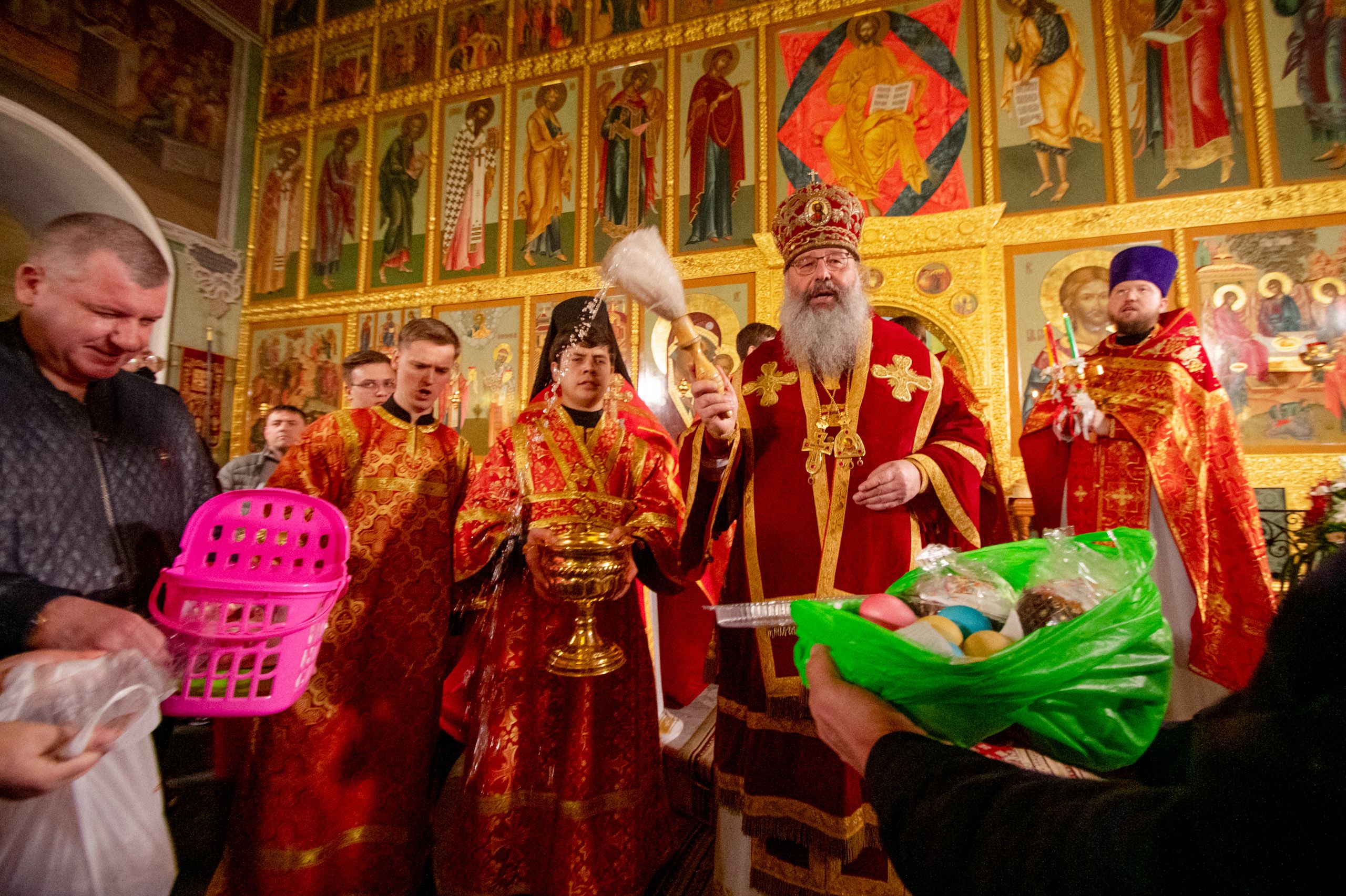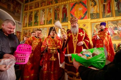 По заамвонной молитве правящий архиерей совершил освящение артоса и пасхальной снеди.