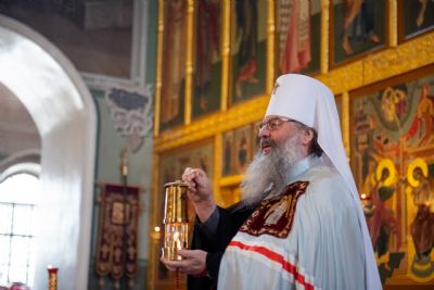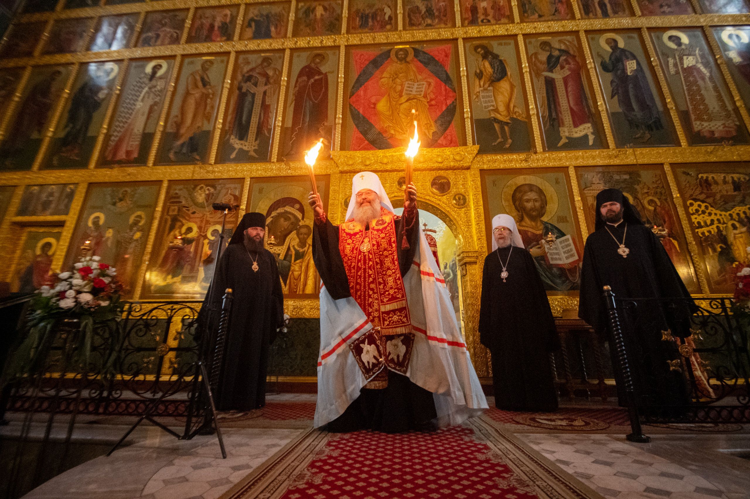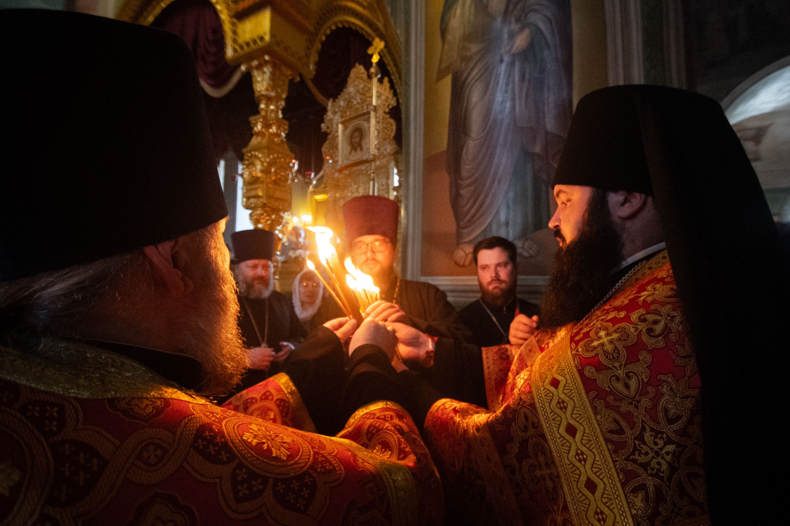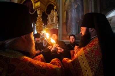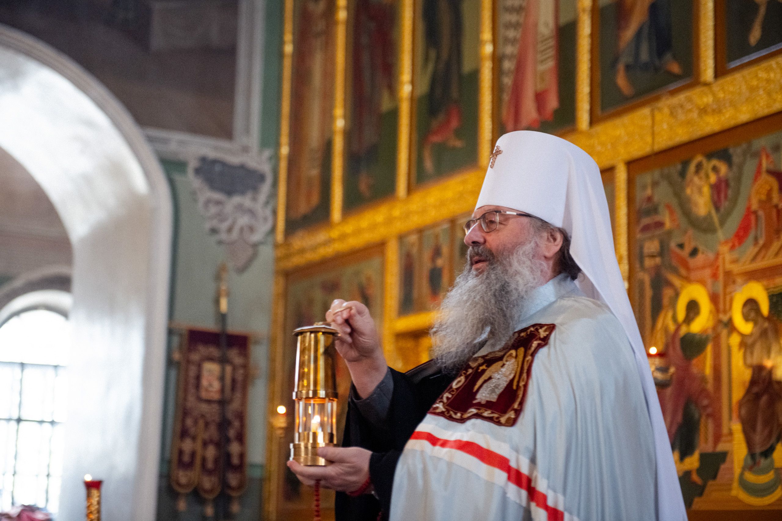 К началу праздничного богослужения владыка Кирилл доставил в собор Благодатный огонь, сошедший накануне в Храме Гроба Господня в Иерусалиме.