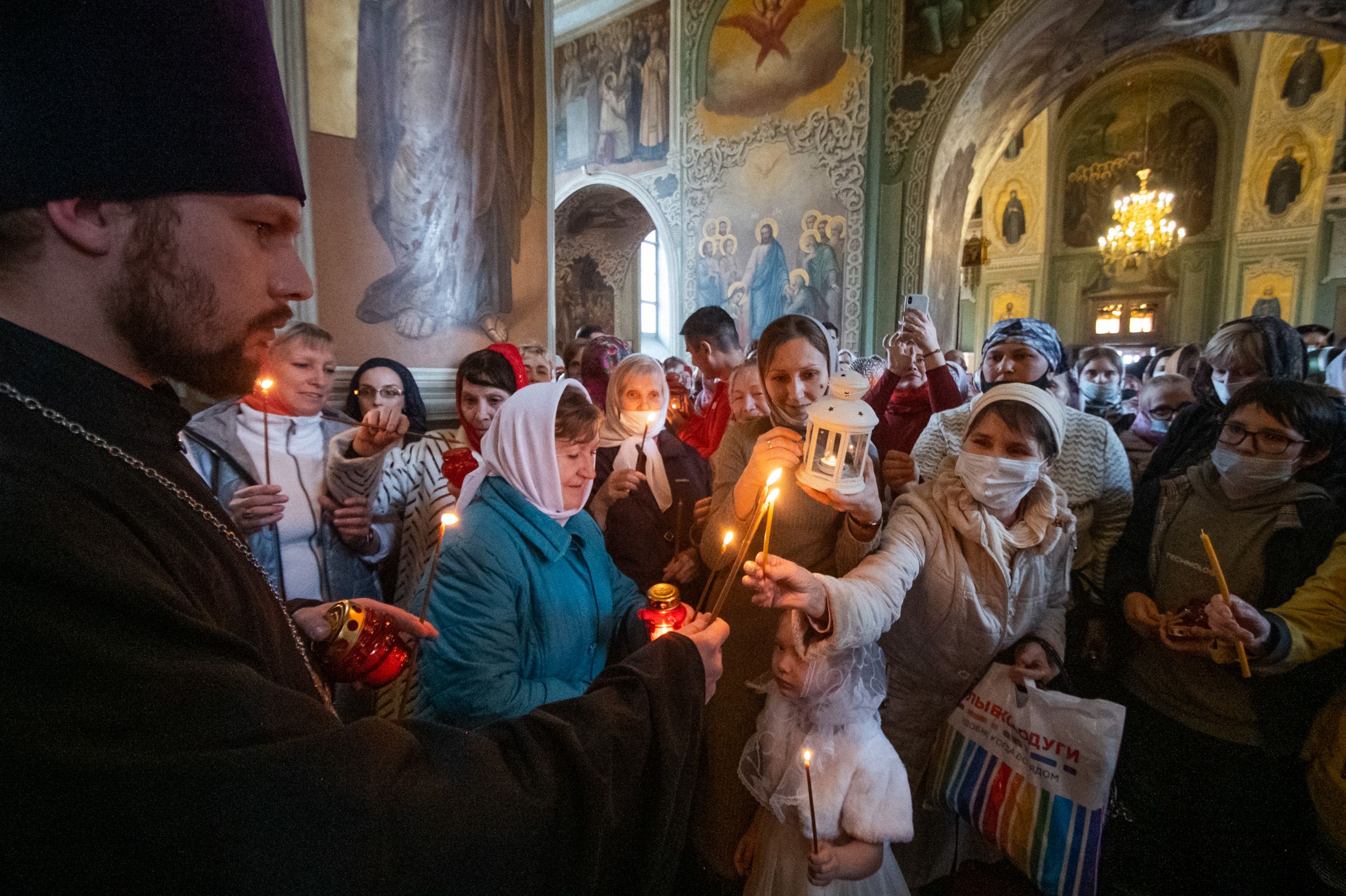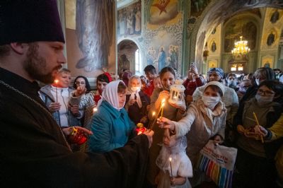 После службы духовенству и верующим раздали Благодатный огонь. Прибывшие на праздничное богослужение священнослужители доставят святыню на приходы.