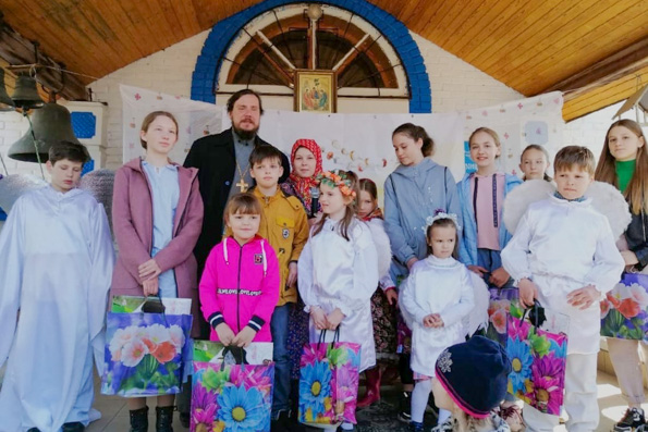 После этого состоялось подготовленное учащимися воскресной школы театрализованное представление. Затем приходской ансамбль «Загудница» исполнил народные песнопения, посвященные Пасхе.