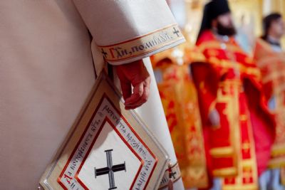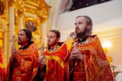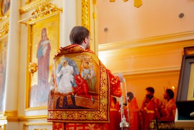 По заамвонной молитве духовенство на середине храма пропело тропарь, кондак и величание апостолу и евангелисту Иоанну Богослову.