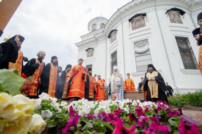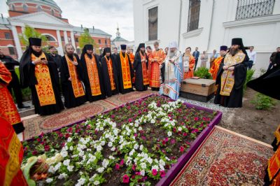 Затем архипастыри и сослужащее духовенство прошли на место упокоения митрополита Феофана и совершили на могиле панихиду пасхальным чином.