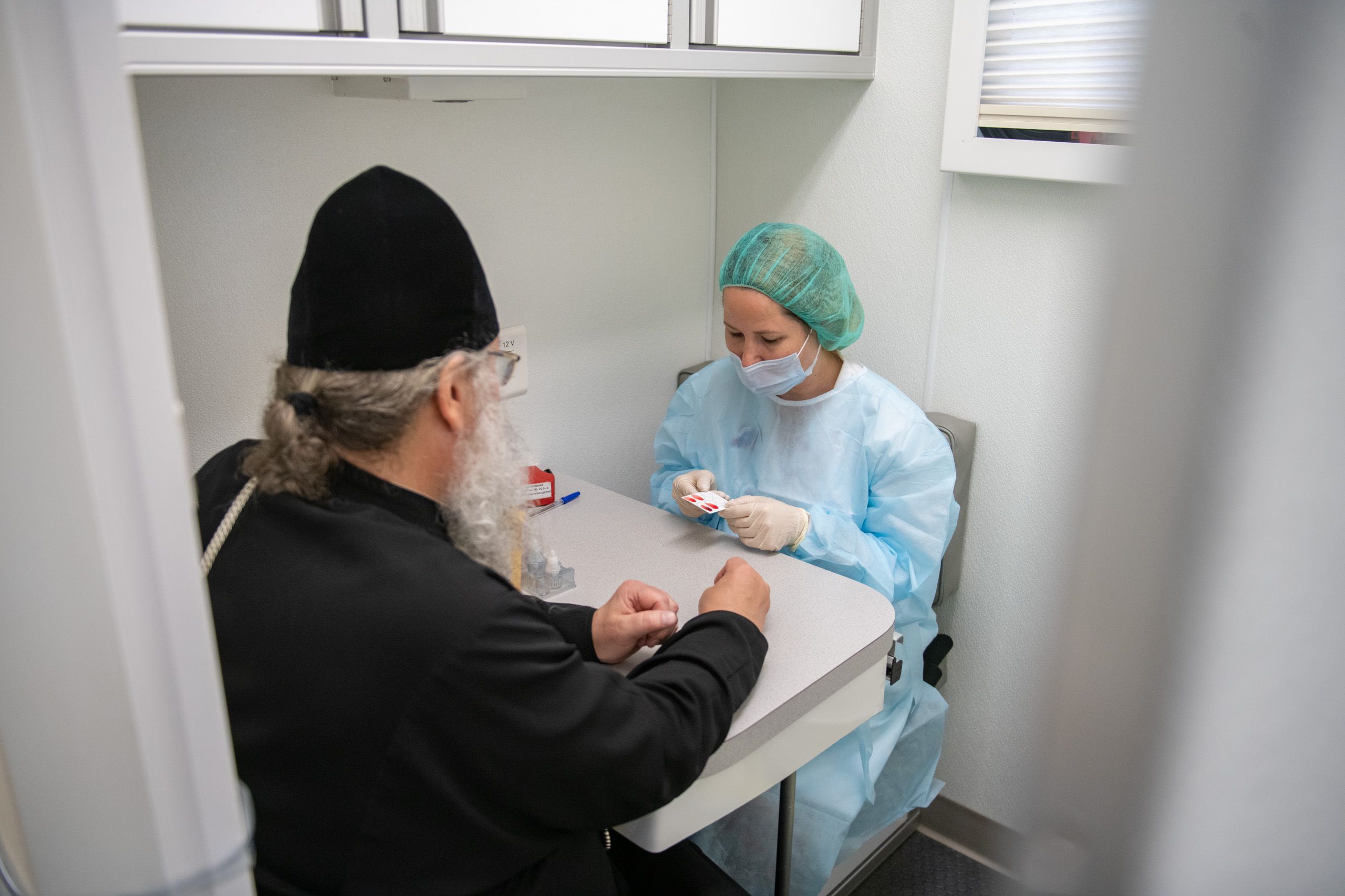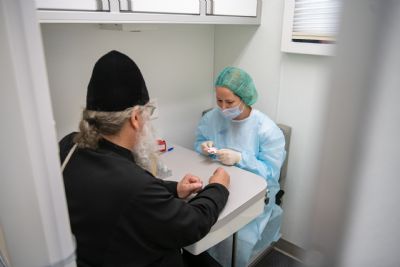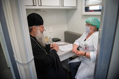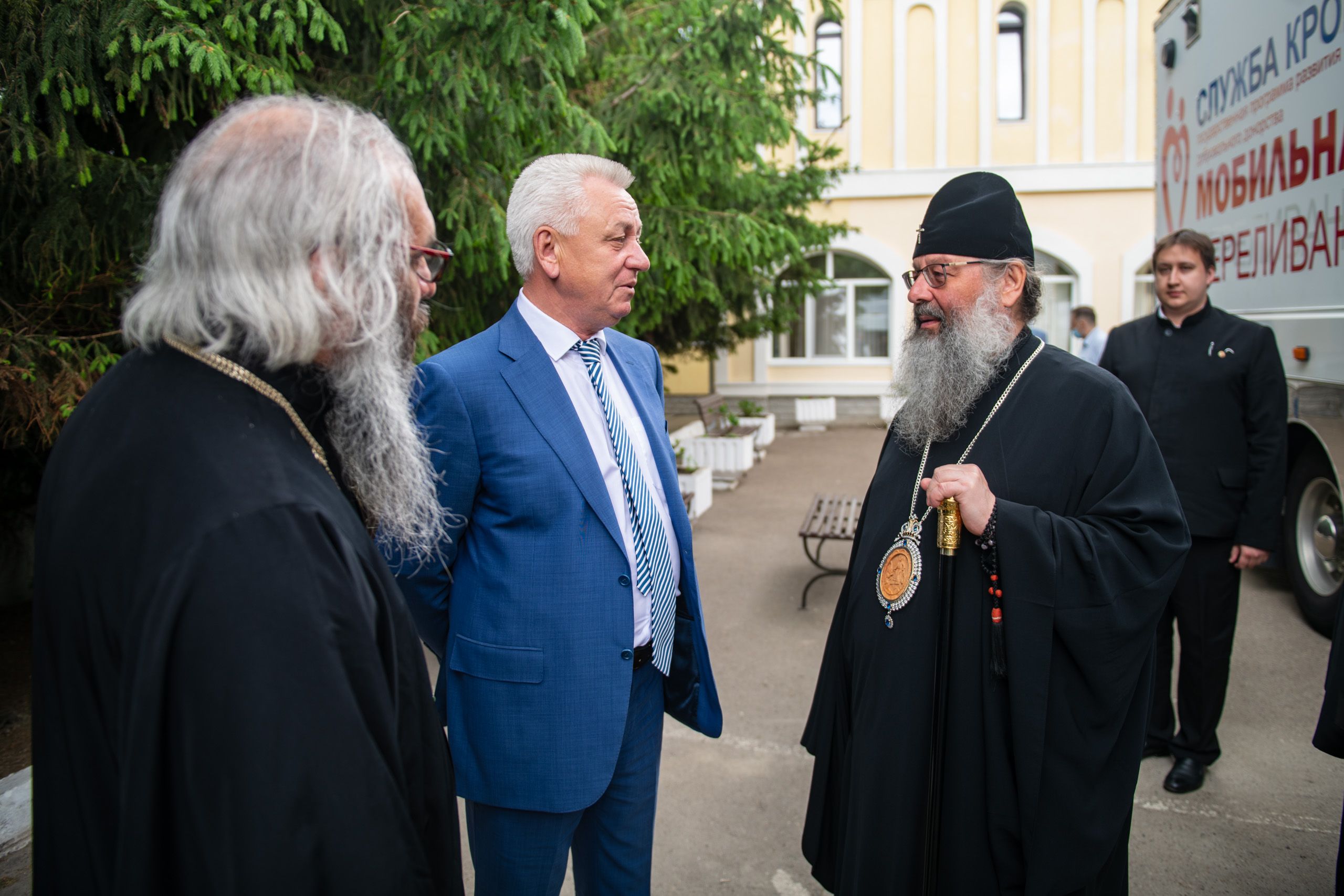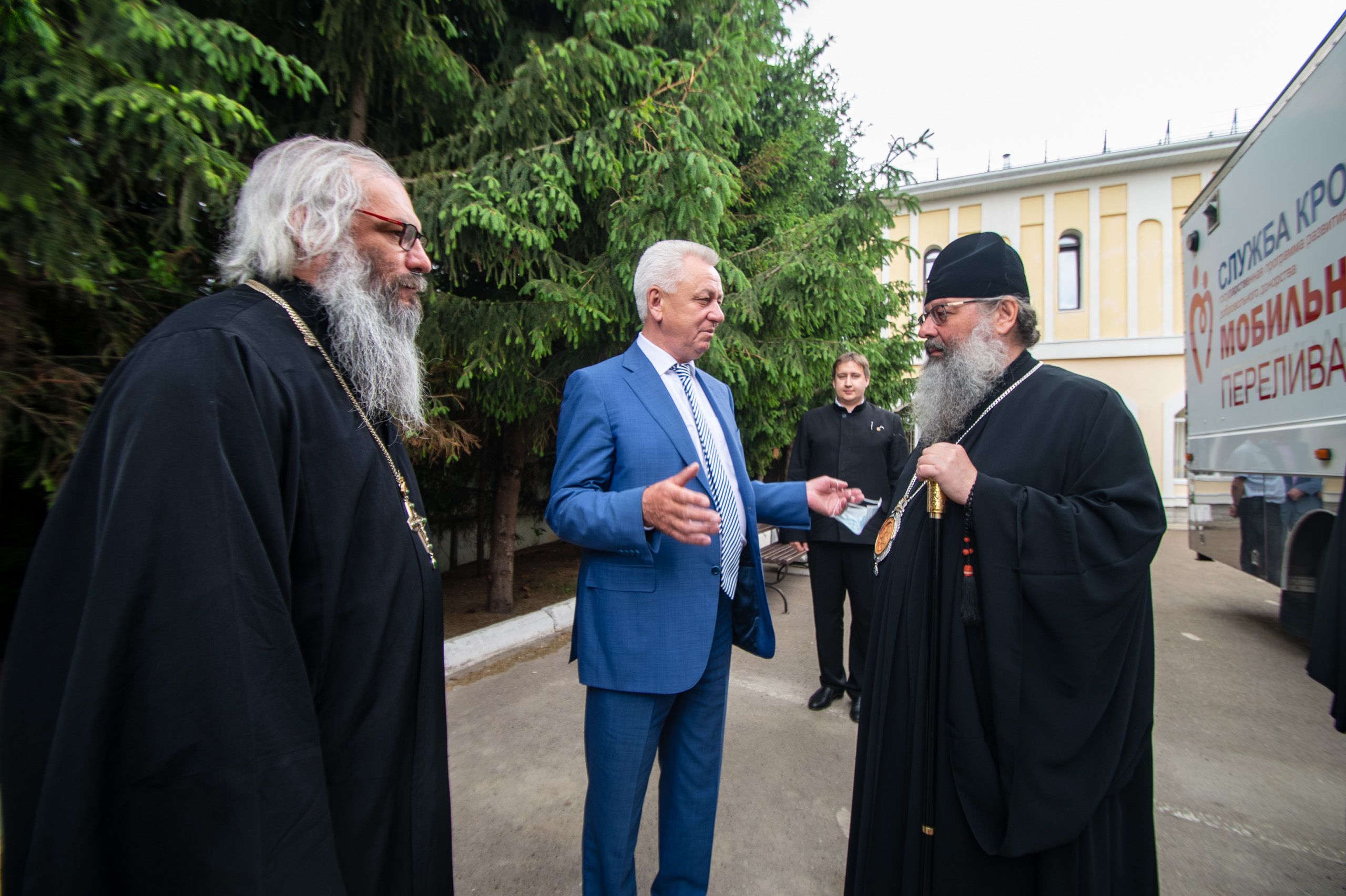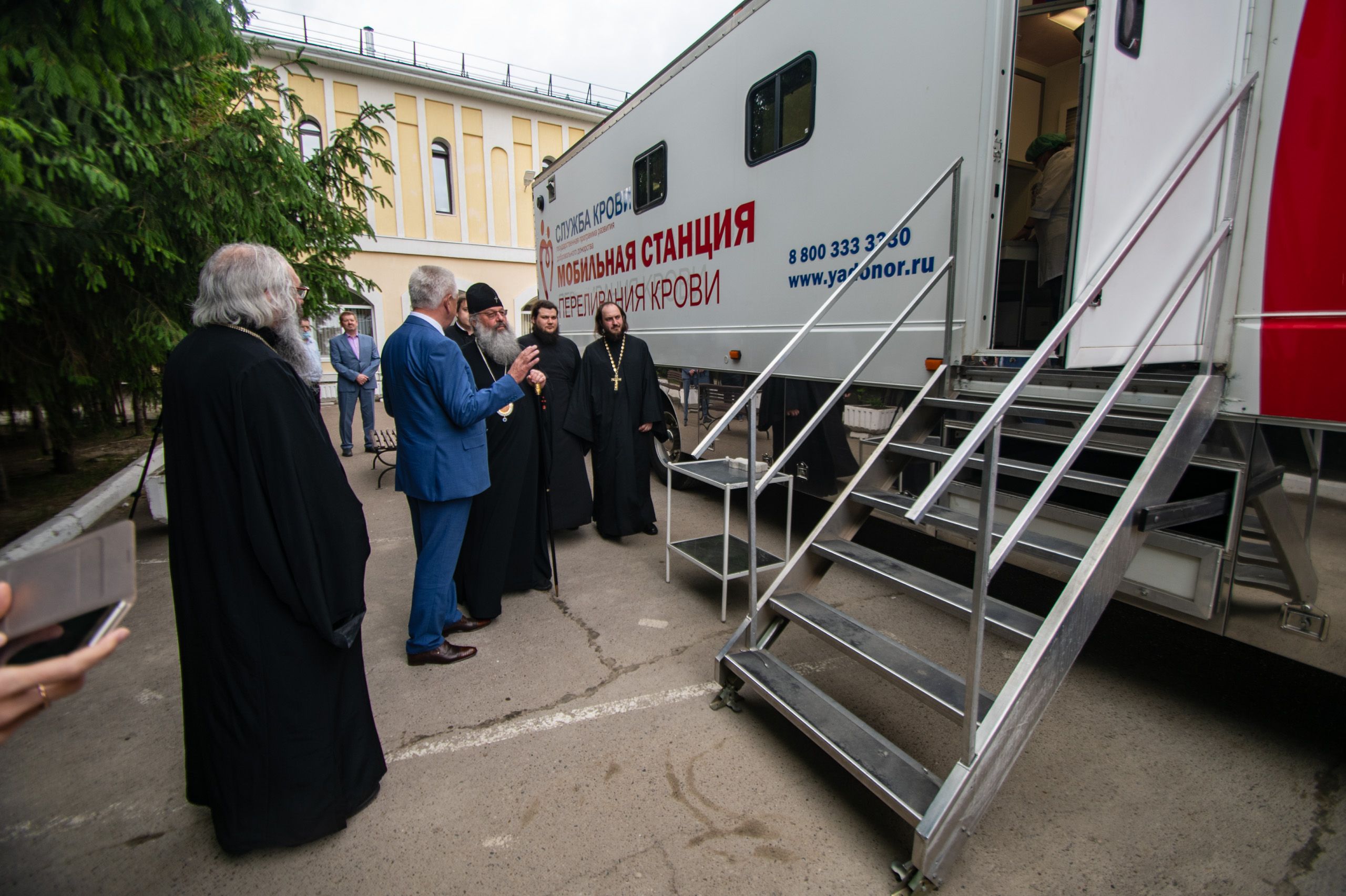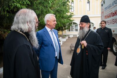 Владыка Кирилл осмотрел мобильный комплекс Центра крови. Он оснащён современной техникой, которая позволяет произвести одновременный забор крови у пятерых доноров. После консультации врача архипастырь направился в донорский зал, где сдал кровь.