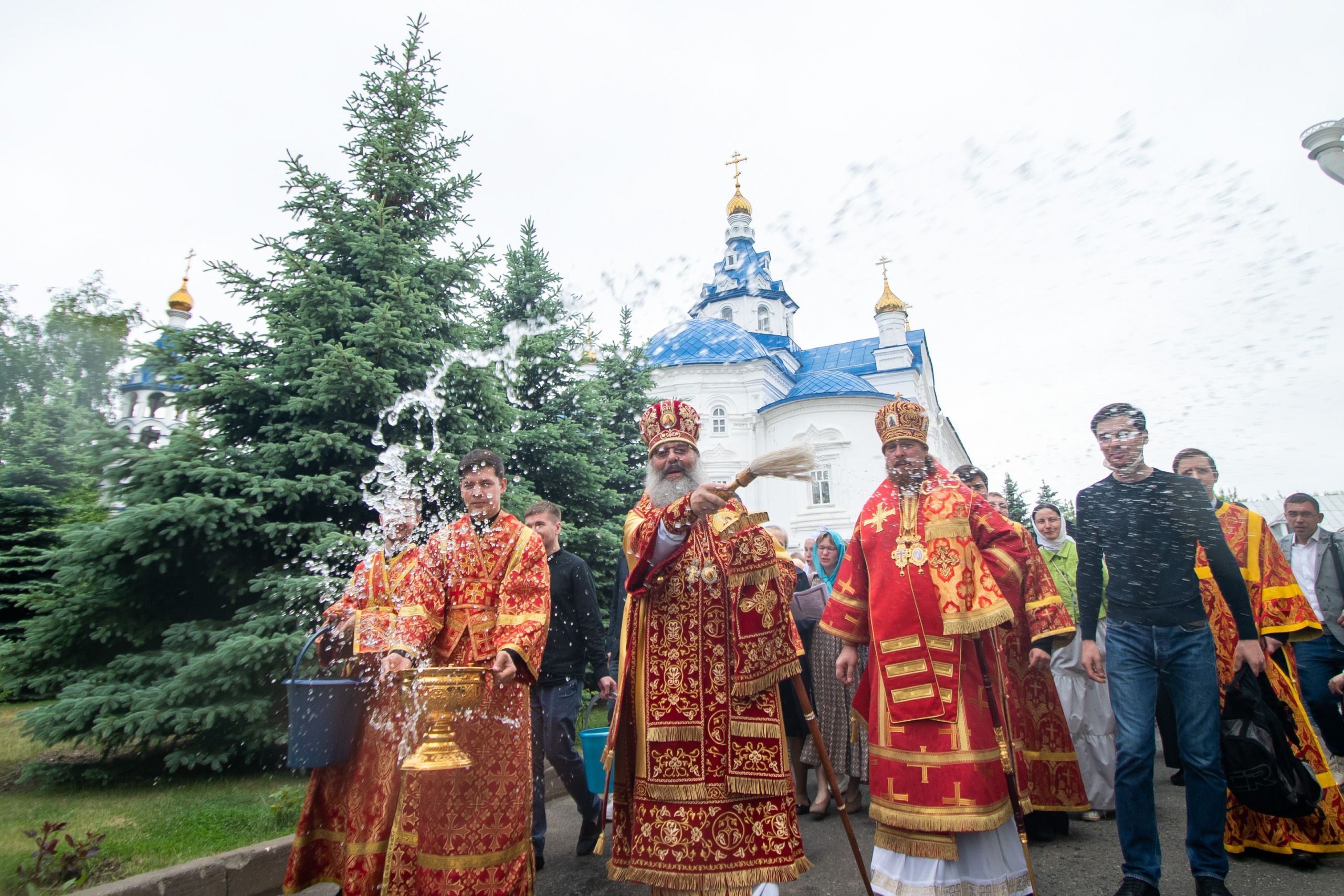 Архипастырям сослужили секретарь Татарстанской митрополии иеромонах Кирилл (Корытко), секретарь Казанской епархии протоиерей Владимир Самойленко, старший звонарь Троице-Сергиевой лавры игумен Антоний (Зинин), благочинный Алексеевского округа Казанской епархии протоиерей Павел Чурашов, руководитель епархиального отдела по культуре протоиерей Святослав Мирганиев, другие клирики Казанской, а также Чистопольской и Челябинской епархий.