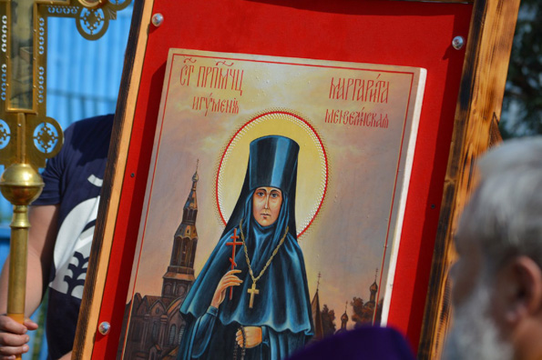 Затем состоялся крестный ход от Никольского собора по улицам Мензелинска до места утраченного Мензелинского Пророко-Ильинского женского монастыря, где приняла мученическую кончину игумения Маргарита (Гунаронуло). В стенах монастыря было совершено молебное пение преподобномученице и пропето величание святой.