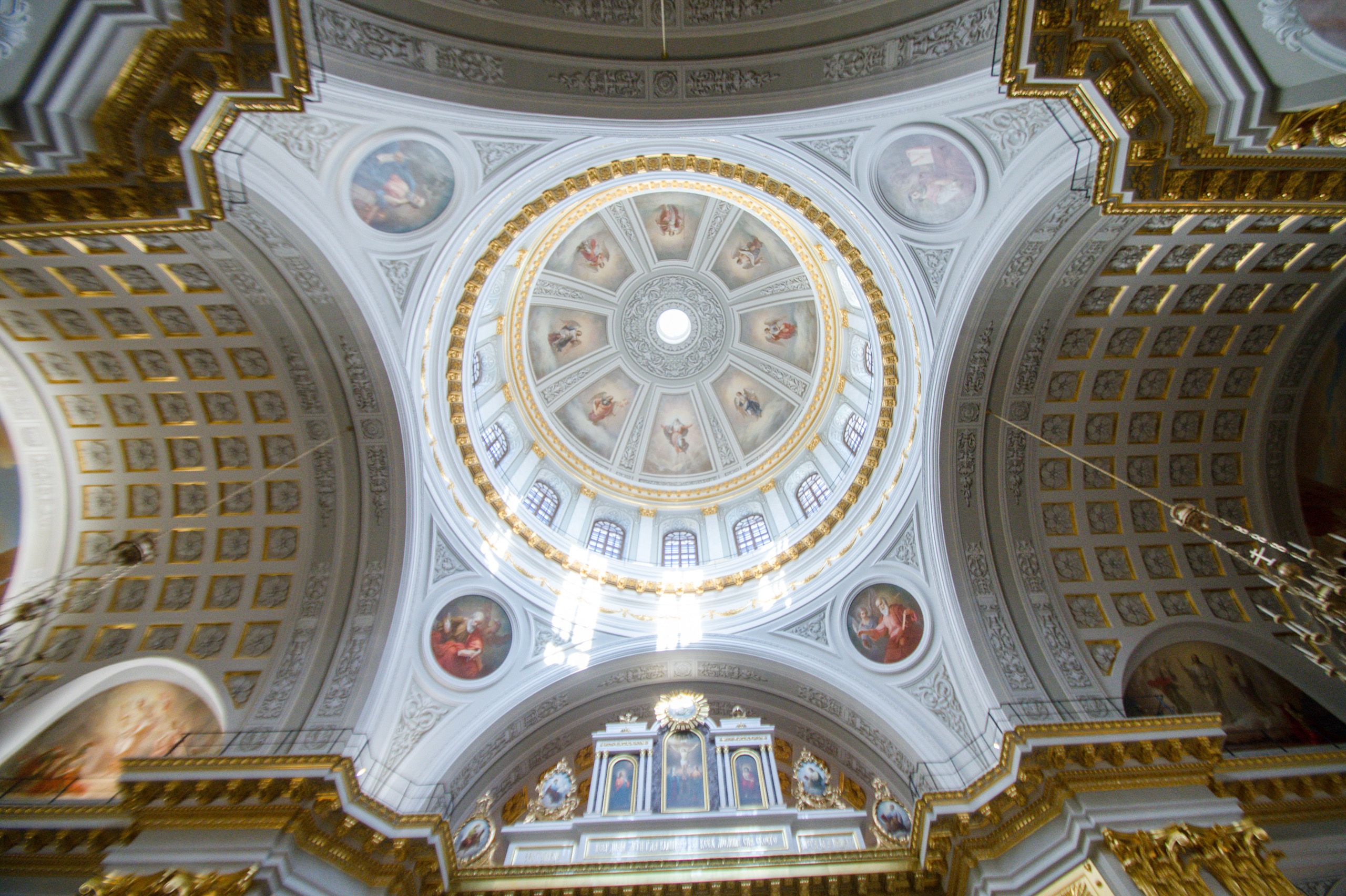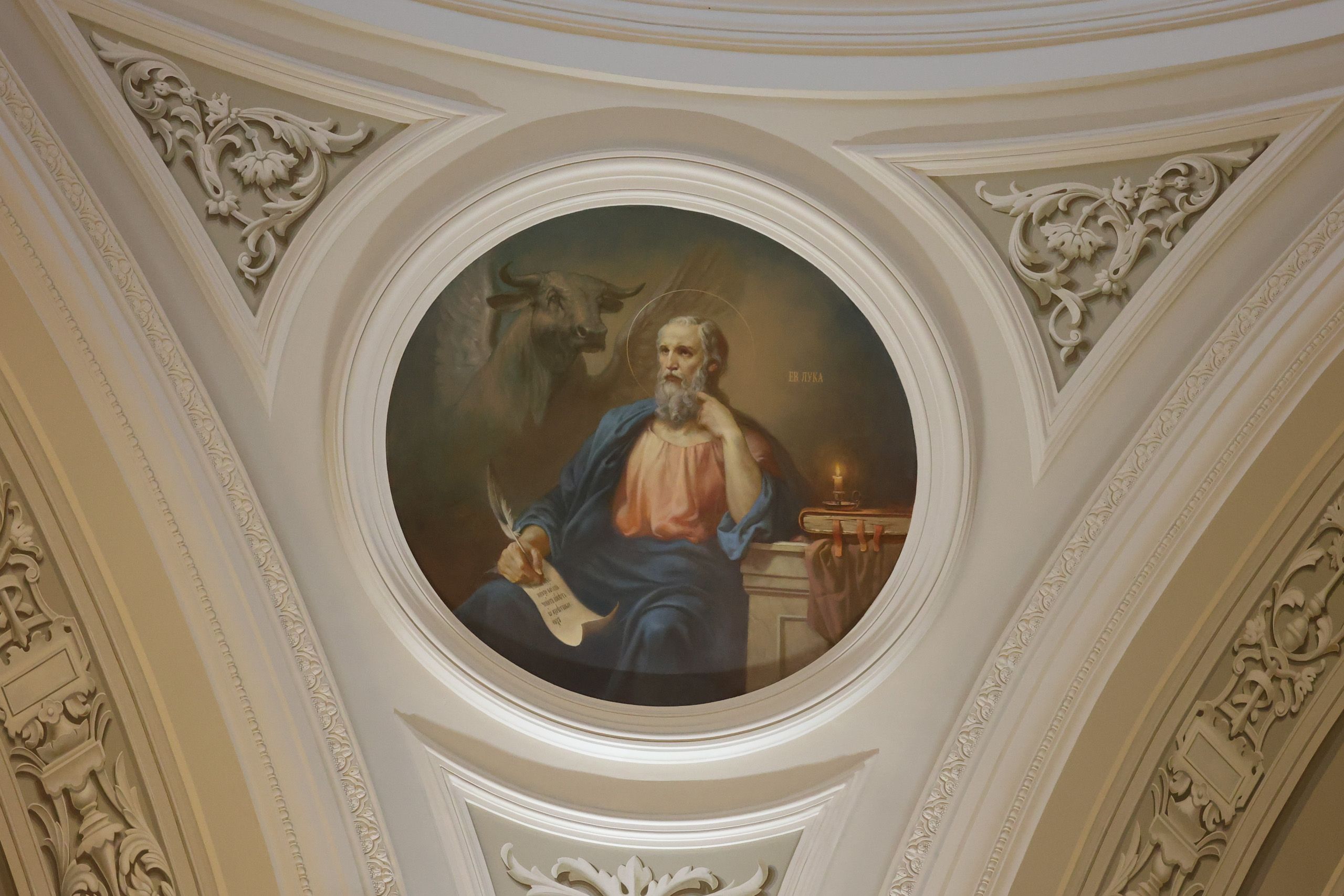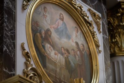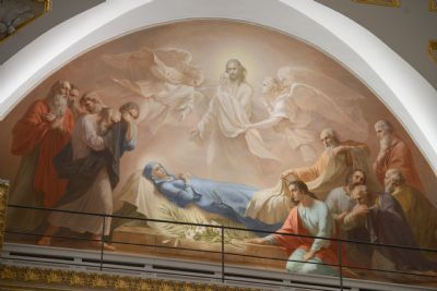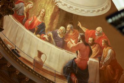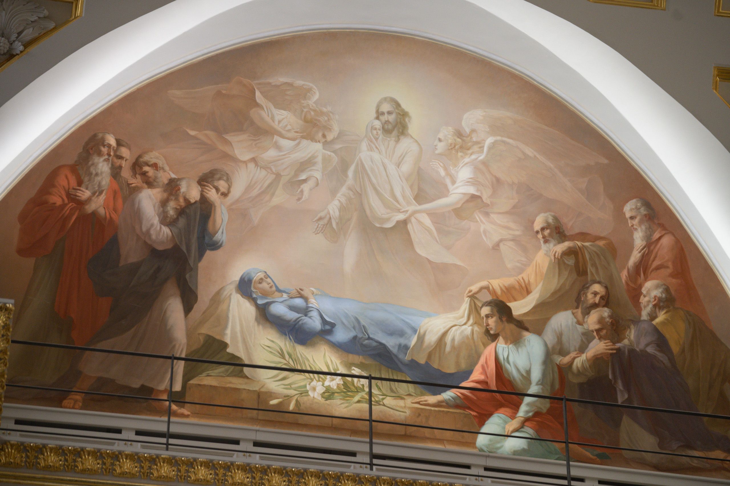У гроба Пресвятой Богородицы собрались почти все апостолы, не было только апостола Фомы, и когда Фома пришёл поклониться Божией Матери, то увидел, что пещера, где покоилось Её тело, была пуста. С телом Пресвятая Дева была вознесена на небо. Вечером того же дня апостолы собрались вместе на трапезу, как мы с вами сейчас собираемся на Литургию. И Сама Матерь Божия явилась ученикам Спасителя, сказав: радуйтесь — Я с вами во все дни до скончания века.