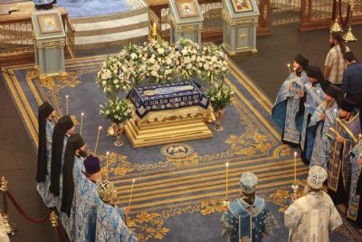 Во время утрени из алтаря была вынесена Плащаница Божией Матери и положена посреди храма. Здесь она пробудет до богослужения с чином Погребения Пресвятой Богородицы.