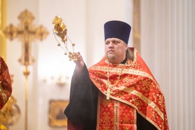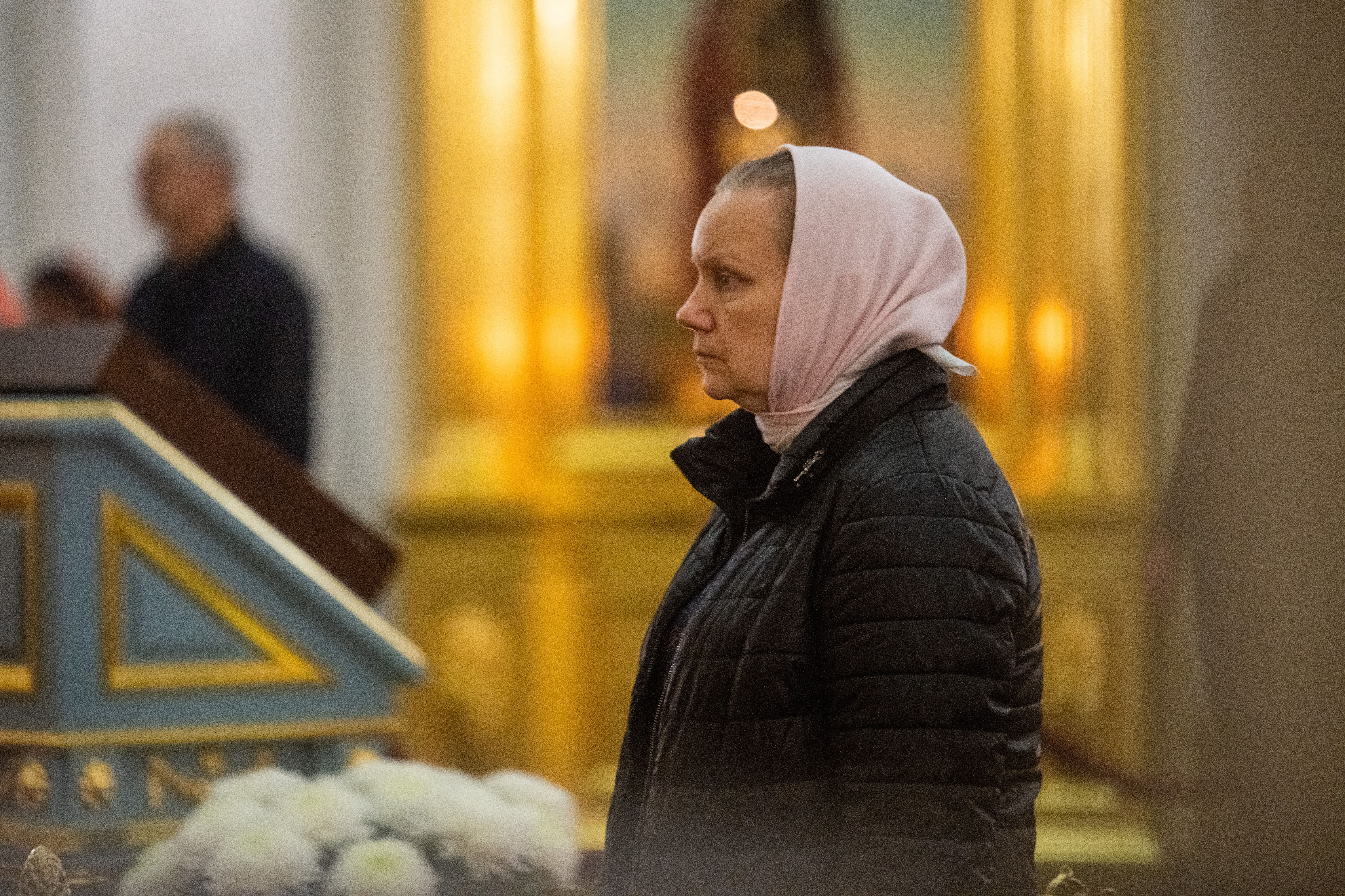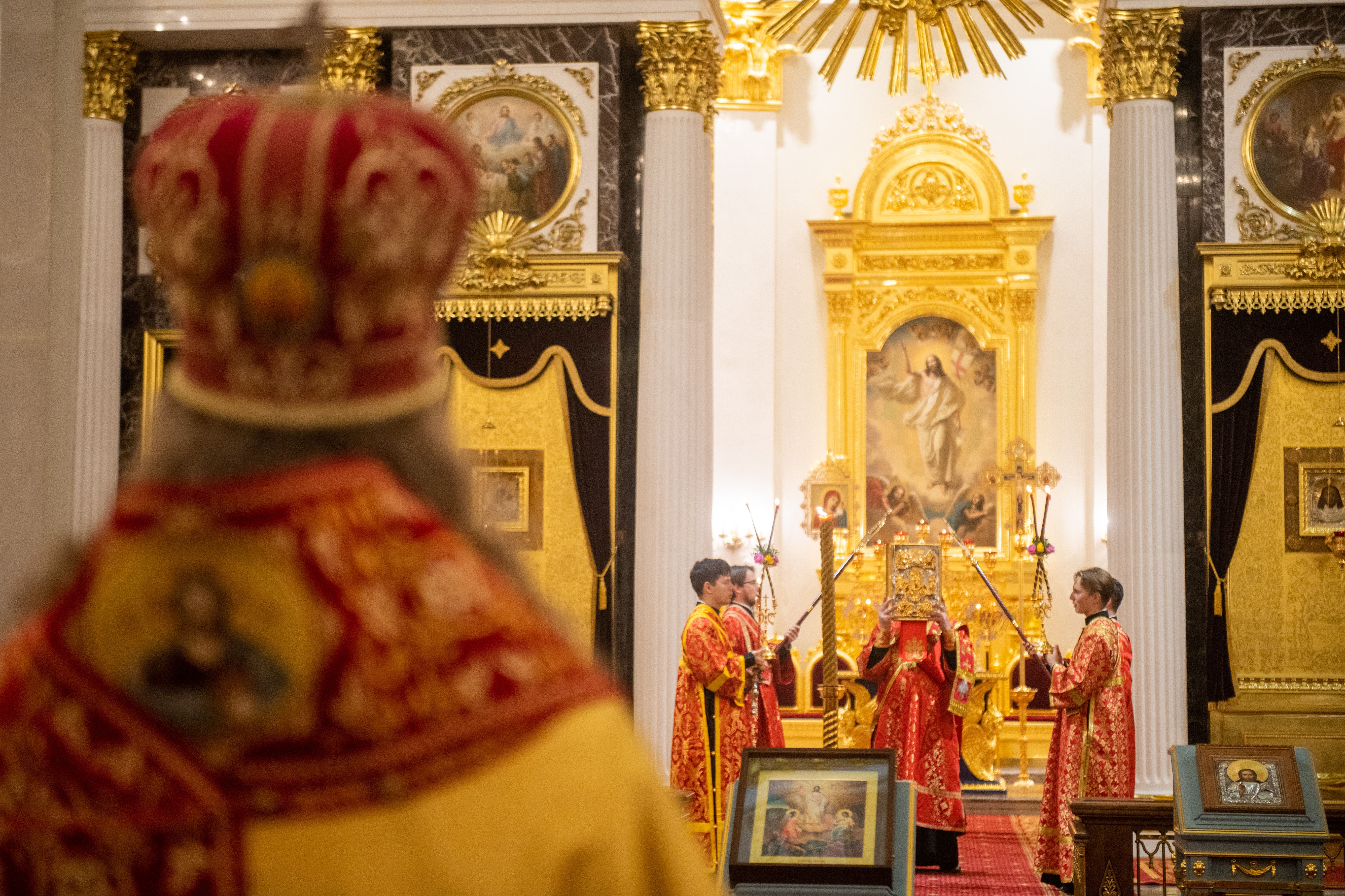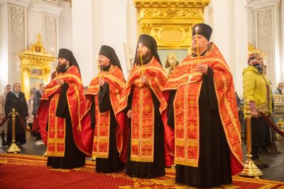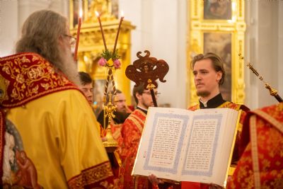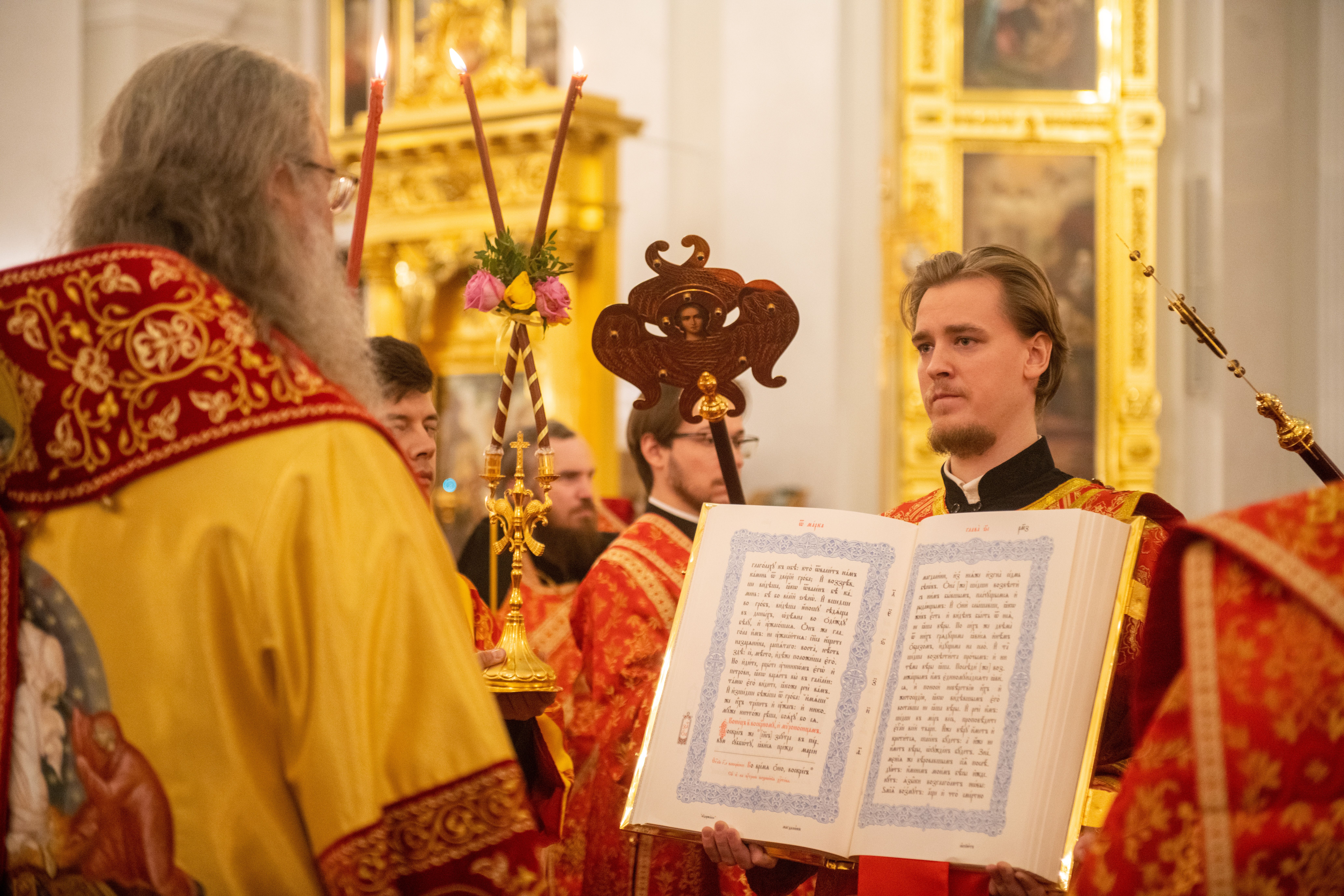 Богослужебные песнопения исполнили два архиерейских хора — мужской под управлением Дениса Рогова и смешанный под управлением Марины Литвиненко.