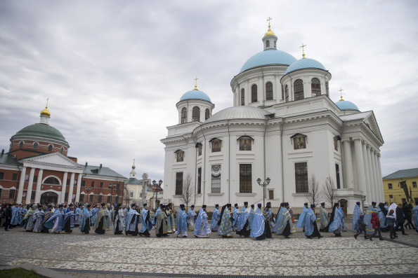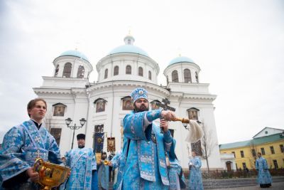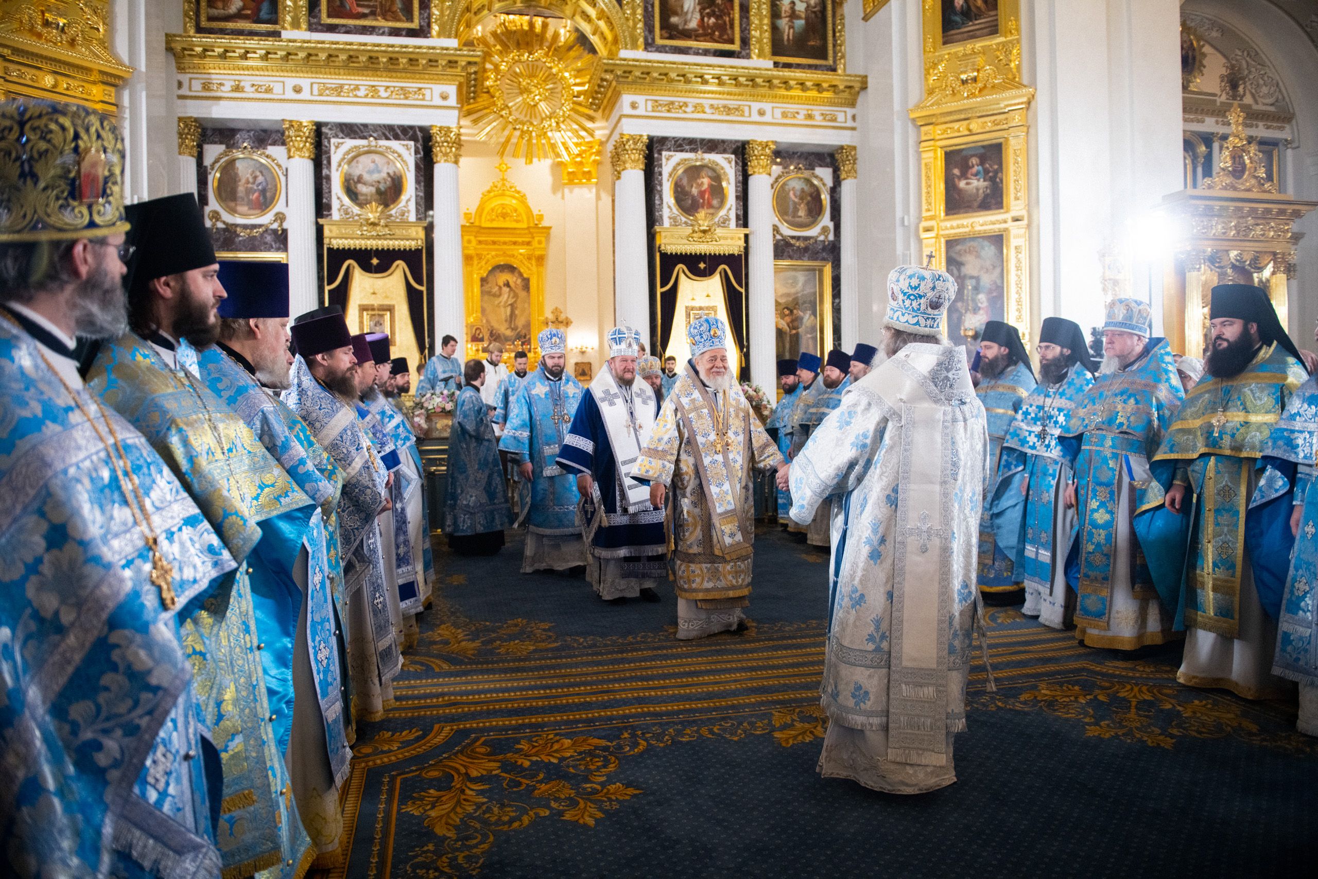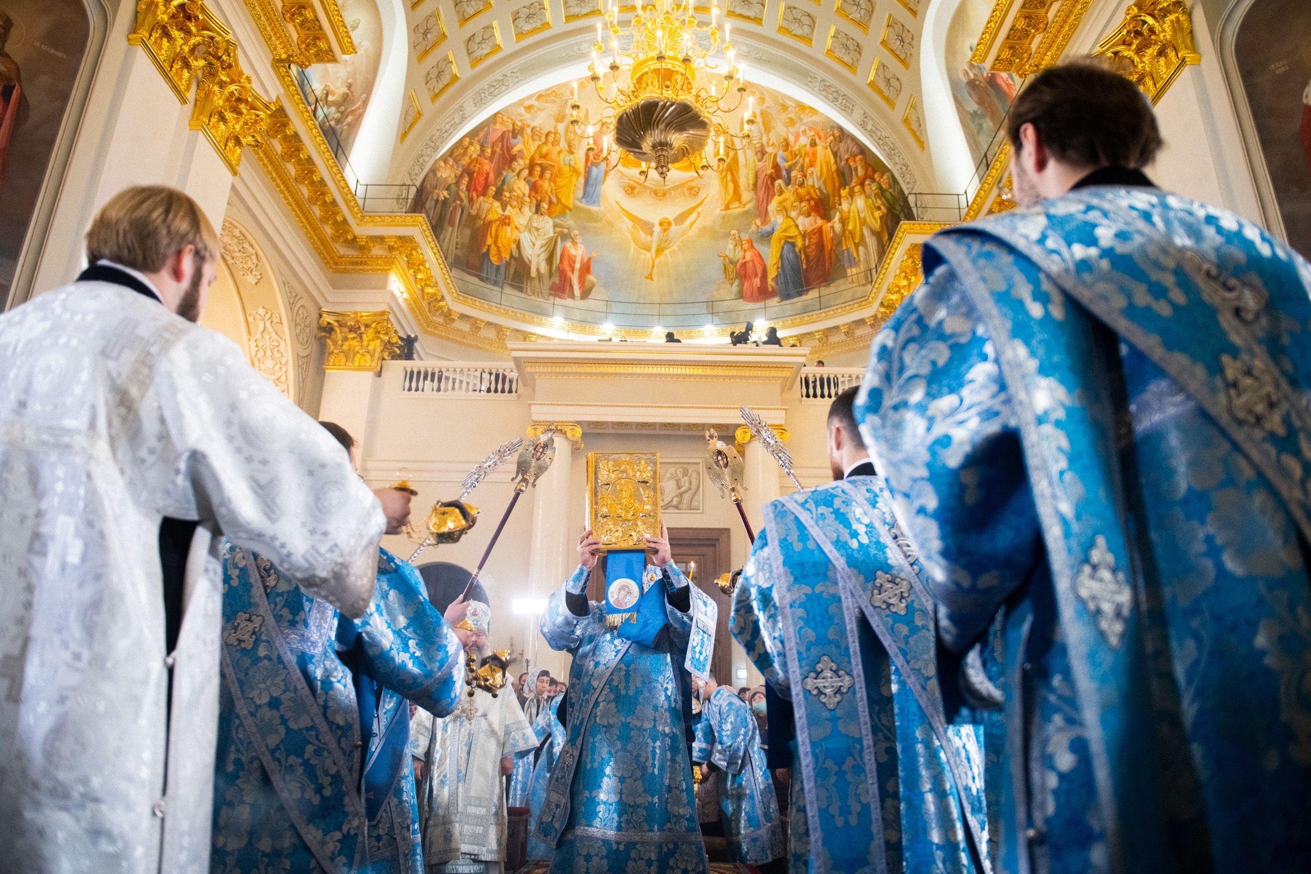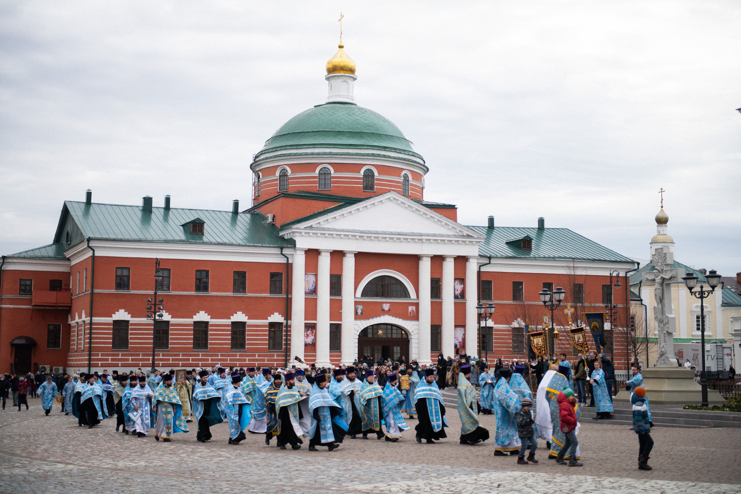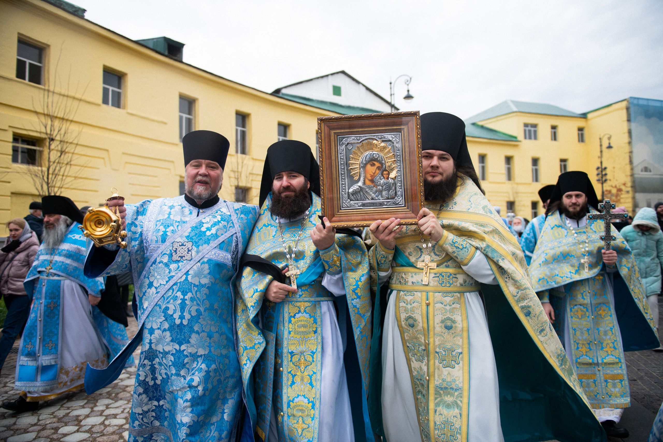 После отпуста архипастыри, духовенство и миряне прошли с Казанской иконой Богородицы и пением молитв Царице Небесной крестным ходом вокруг храма.