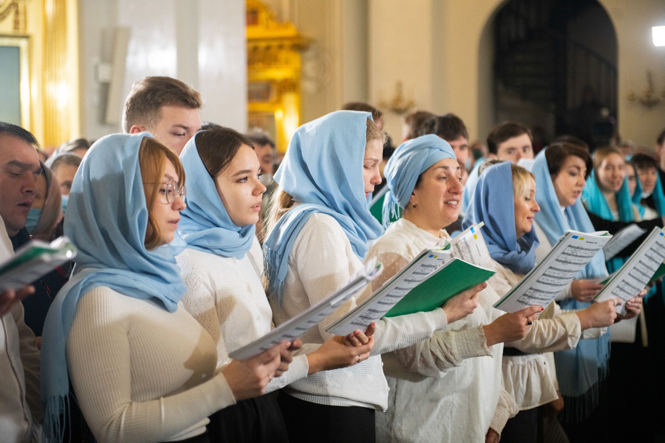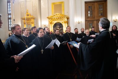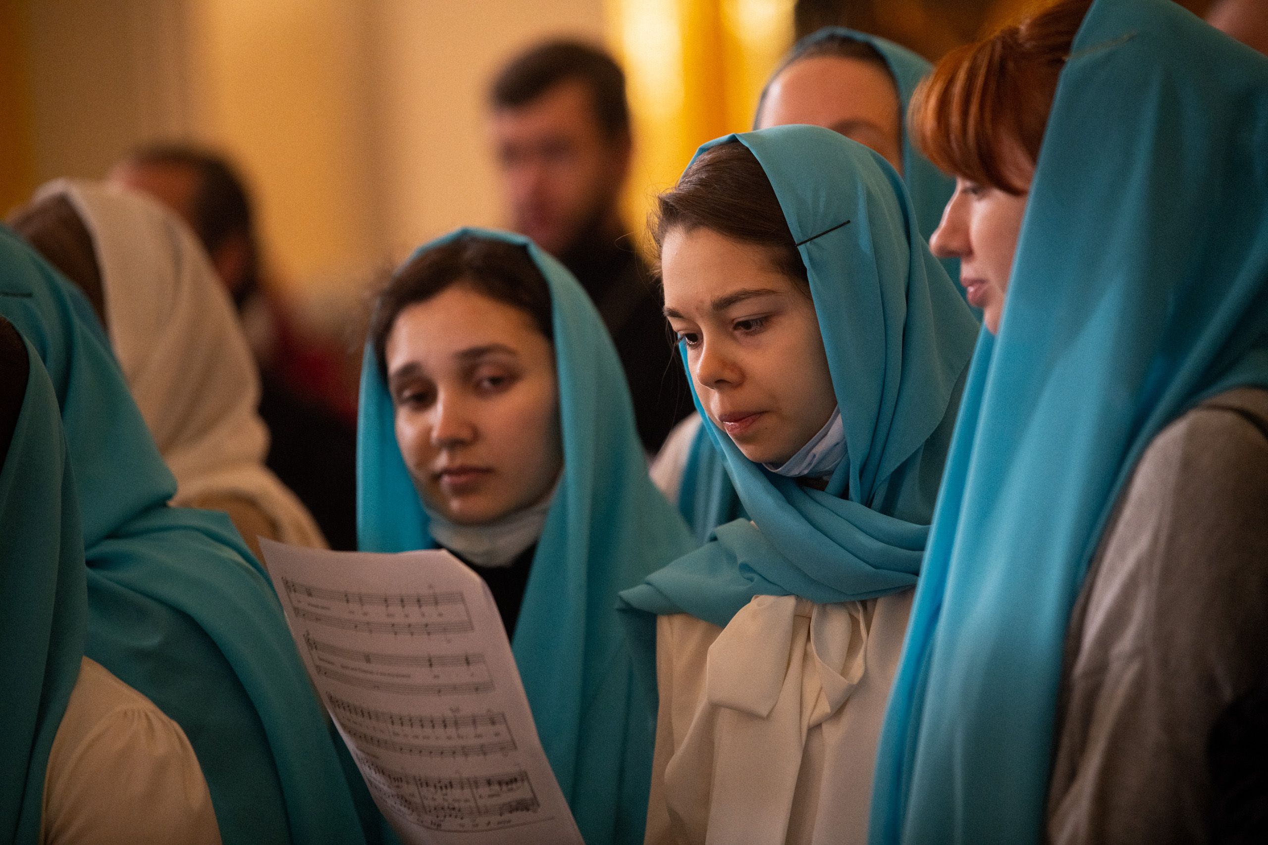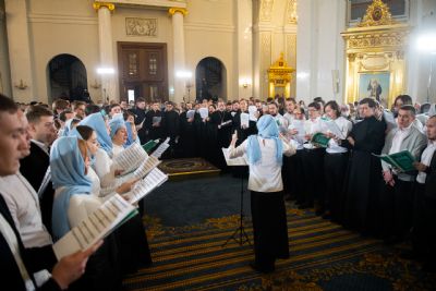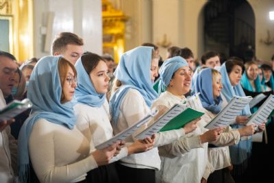 Богослужебные песнопения исполнялись мужским архиерейским хором под управлением Дениса Рогова, смешанным архиерейским хором под управлением Марины Литвиненко, мужским хором духовенства Казанской епархии, смешанным хором Казанской духовной семинарии.