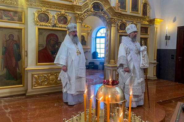 Архипастырям сослужили клирик Казанской епархии иеромонах Алексий (Яцейко) и клирики Тульской епархии.