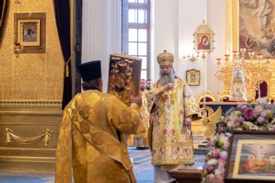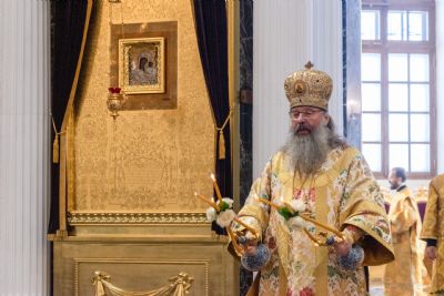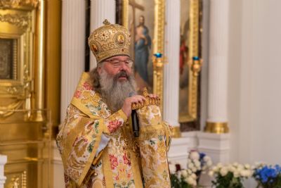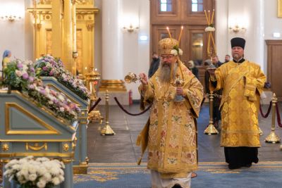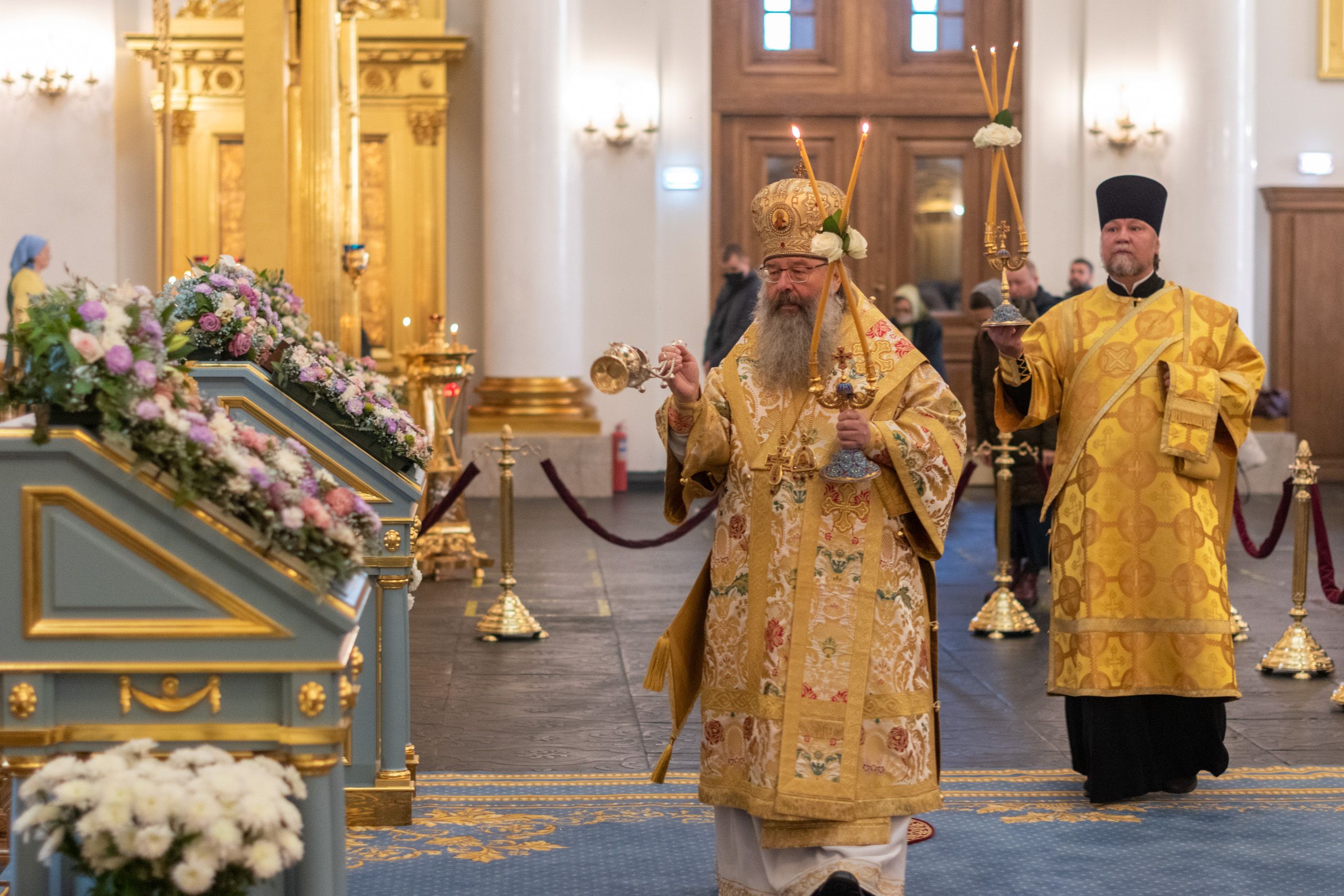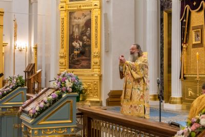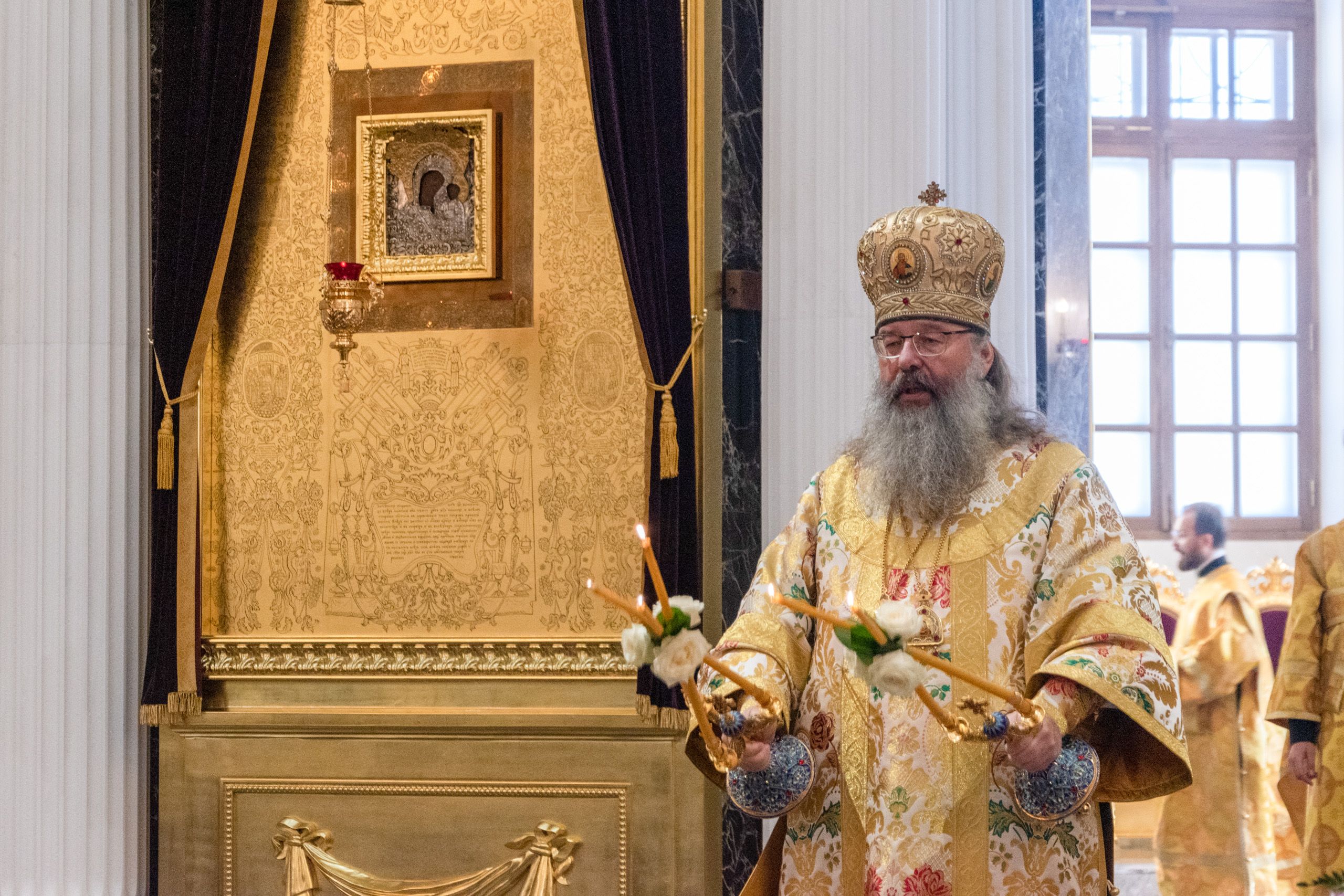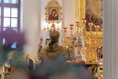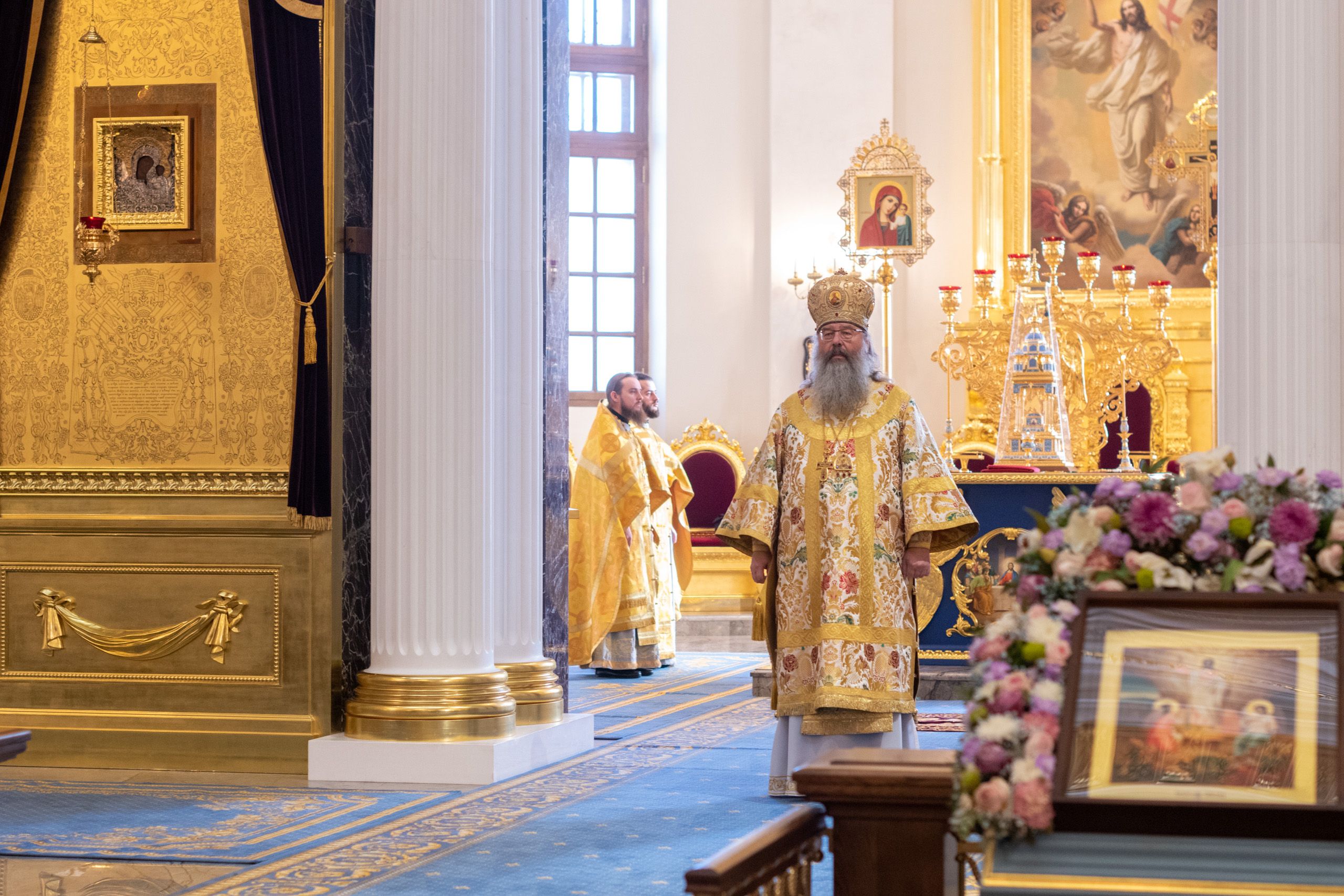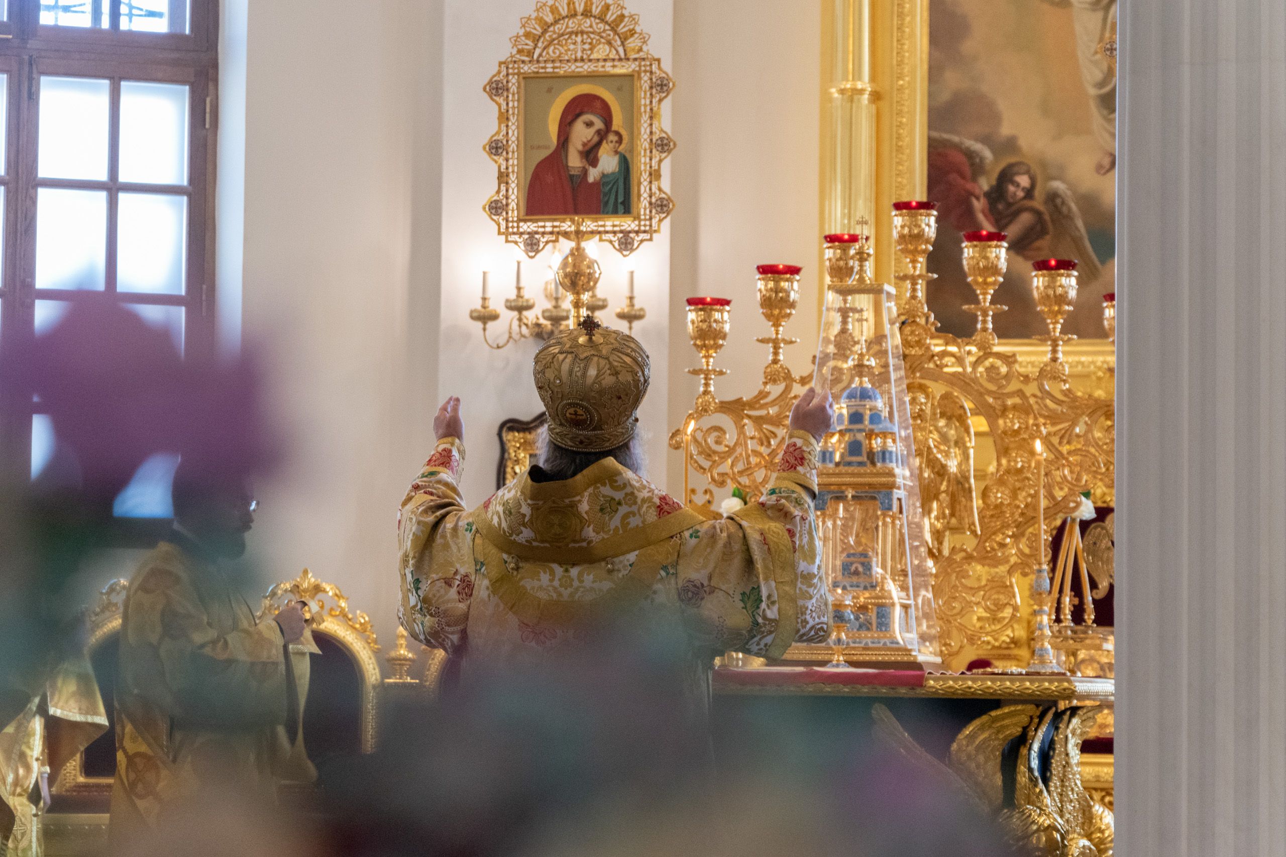 Богослужебные песнопения исполнил архиерейский смешанный хор под управлением Марины Литвиненко. По запричастном стихе проповедь произнёс иерей Кирилл Поморцев. В завершение богослужения архипастырь и священнослужители совершили славление перед Казанским образом Божией Матери.