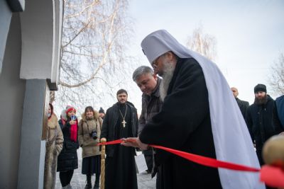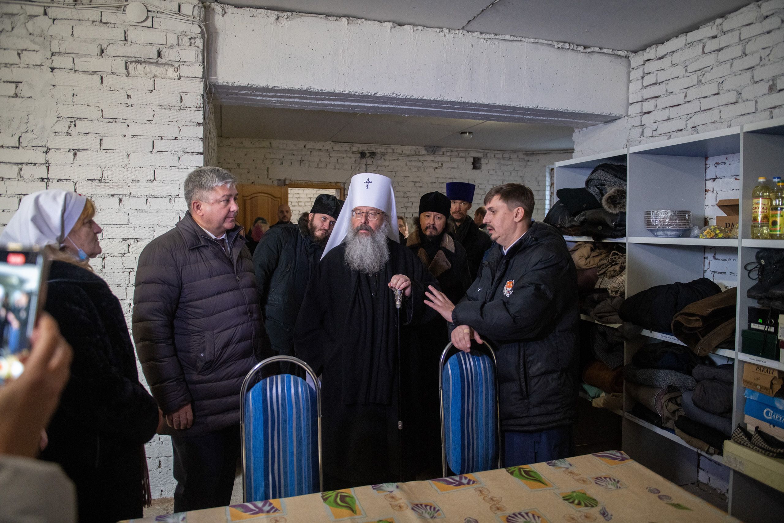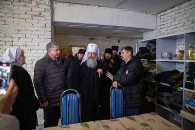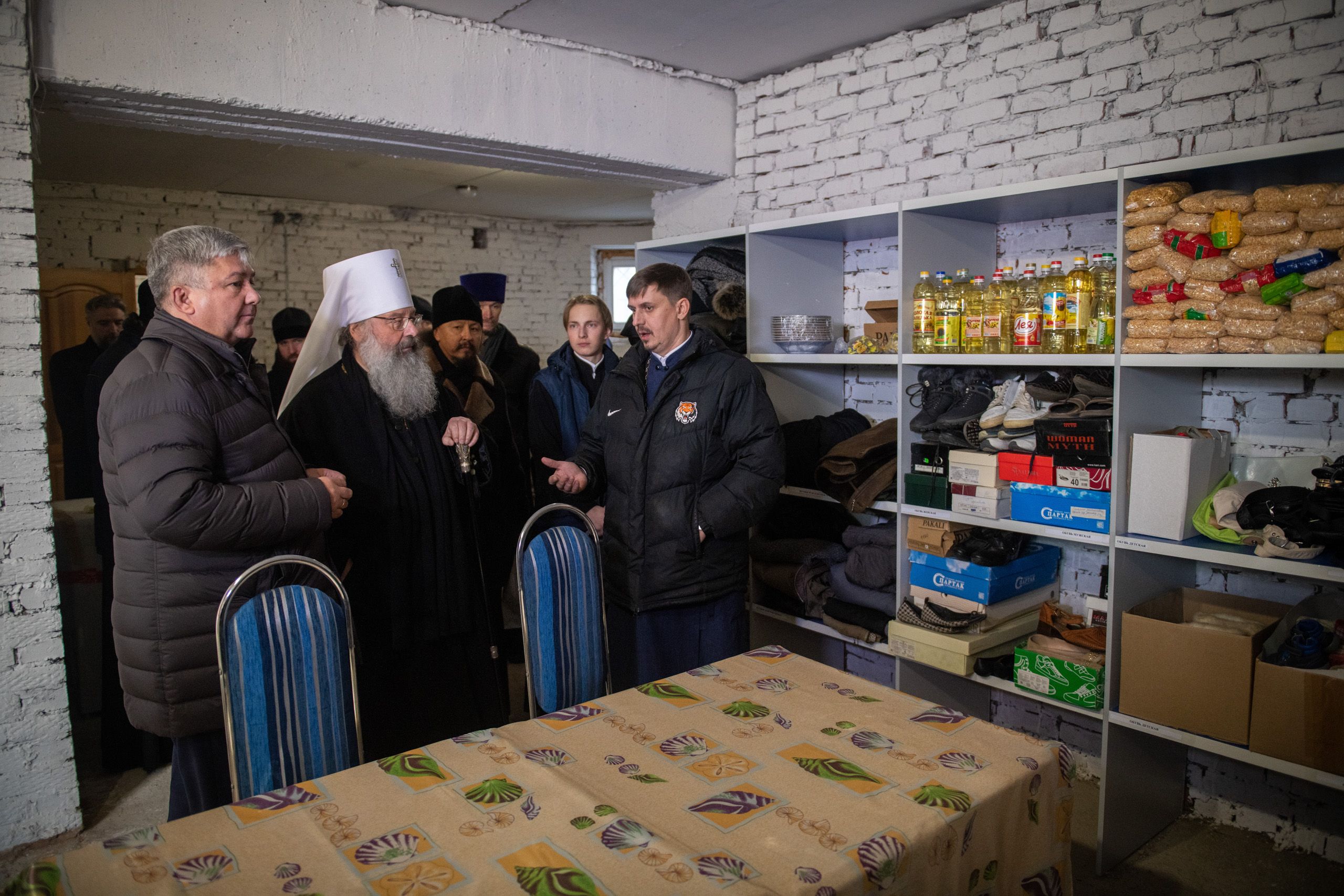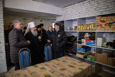 Глава Татарстанской митрополии и Глава Зеленодольского муниципального района осмотрели помещение гуманитарного центра, оборудованного на цокольном этаже храма, побеседовали с добровольцами, которые трудятся на ниве социального служения в Зеленодольске.