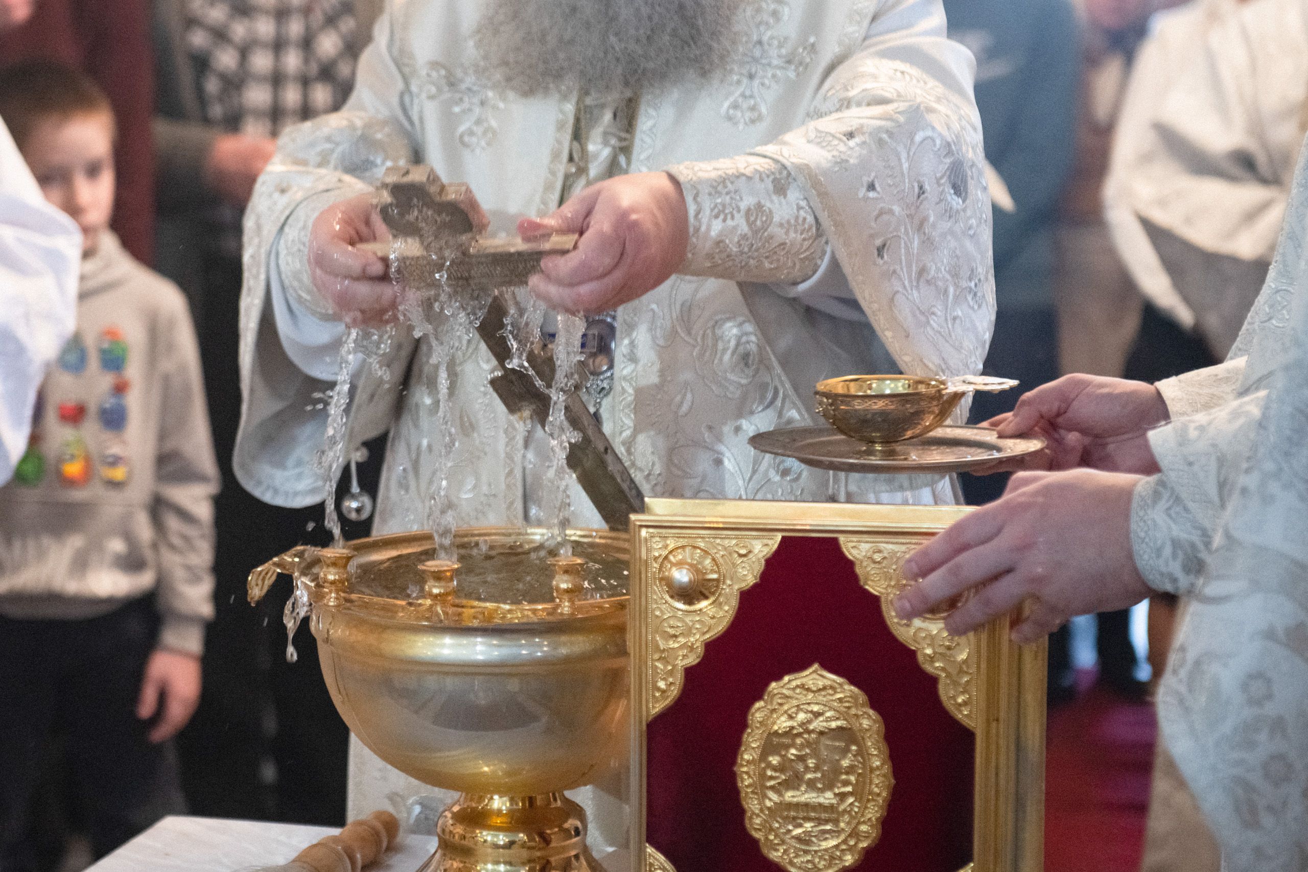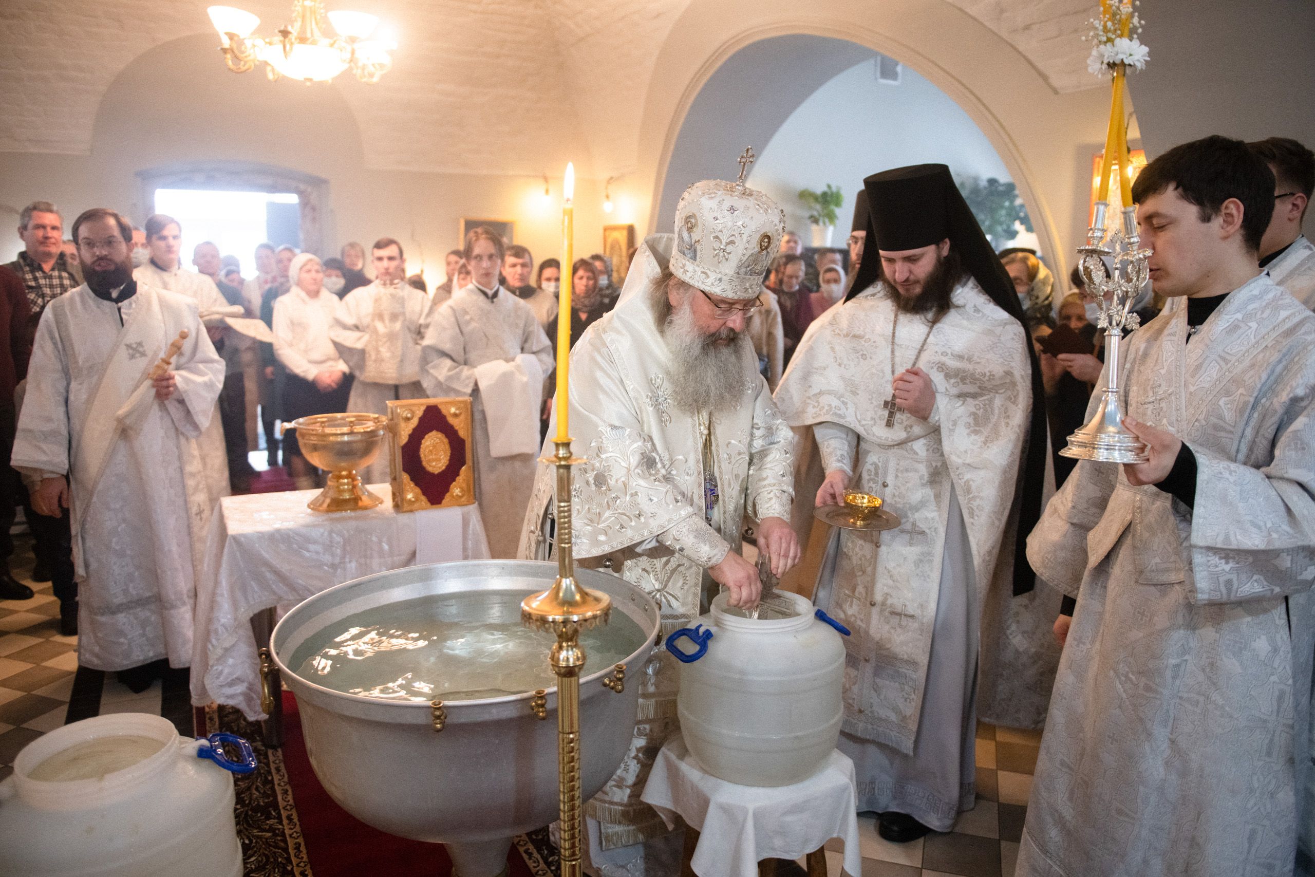 Затем под пение тропаря «Глас Господень на водах...» архипастырь изнёс из алтаря на середину храма крест и состоялось великое освящение воды. Владыка Кирилл окропил всех молящихся агиасмой.