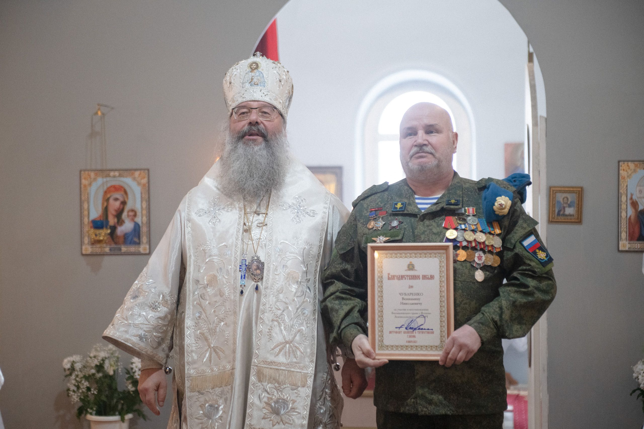 Радостно увидеть пришедших на молитву воинов — людей, которые своей кровью засвидетельствовали верность Родине и вере. Сегодня мы совершили Божественную литургию и великое освящение воды. Надеемся, что благодать Божия вместе с этой водой придёт в наши семьи, в наши дома, на нашу землю. Сегодня и завтра каждый уголок будет окропляться святой водой.