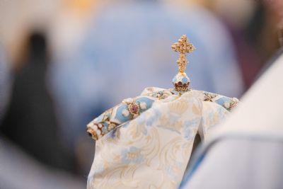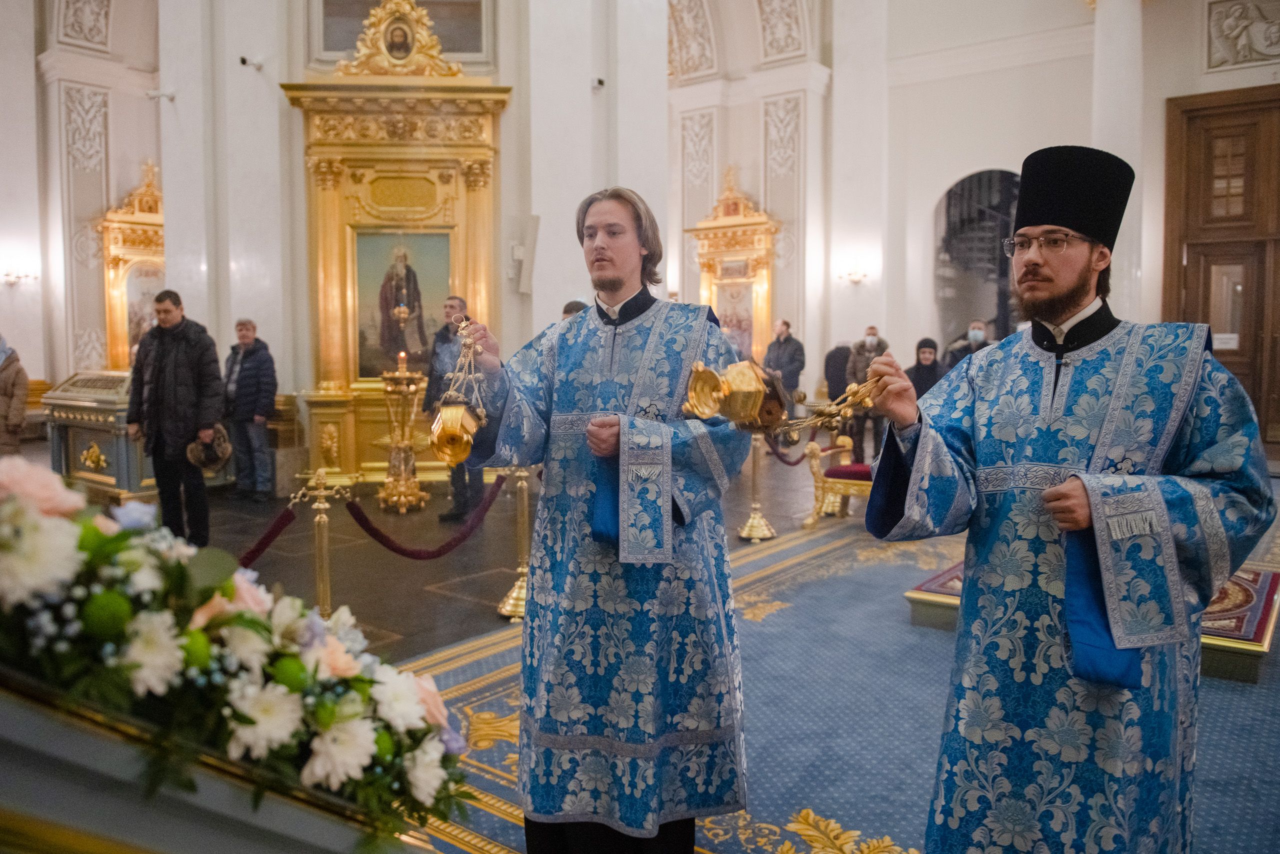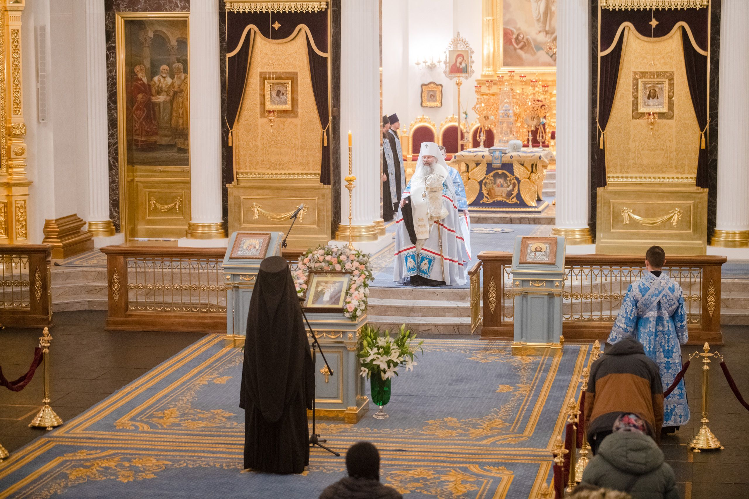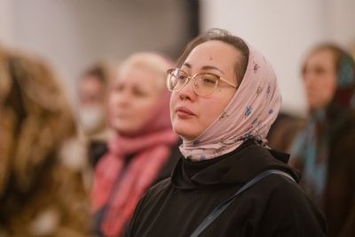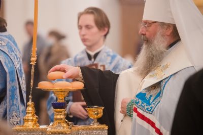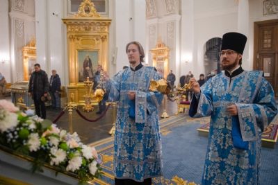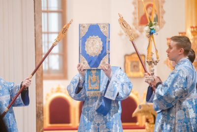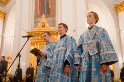 Богослужебные песнопения исполнялись двумя архиерейскими хорами: мужским под управлением Дениса Рогова и смешанным под управлением Марины Литвиненко.