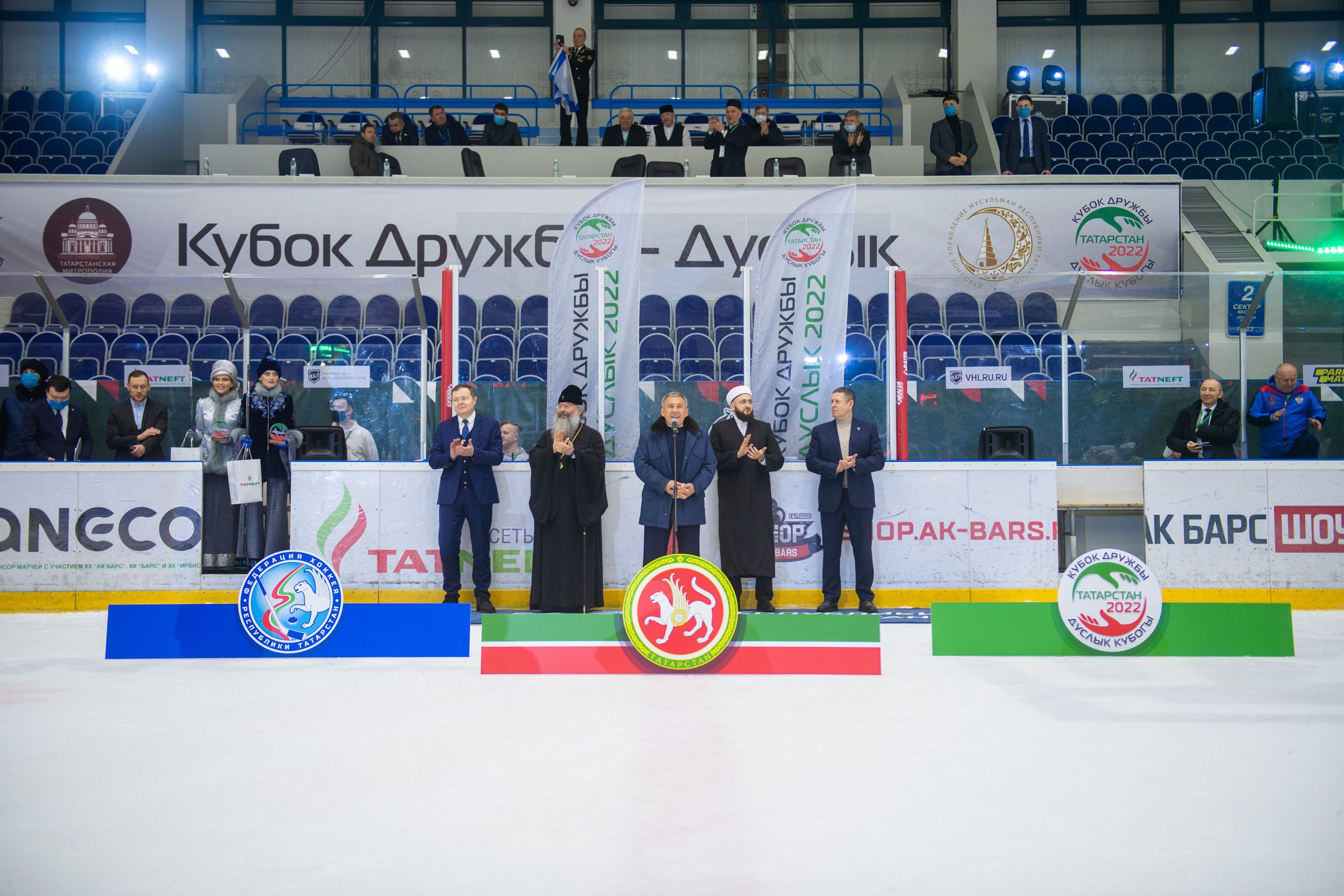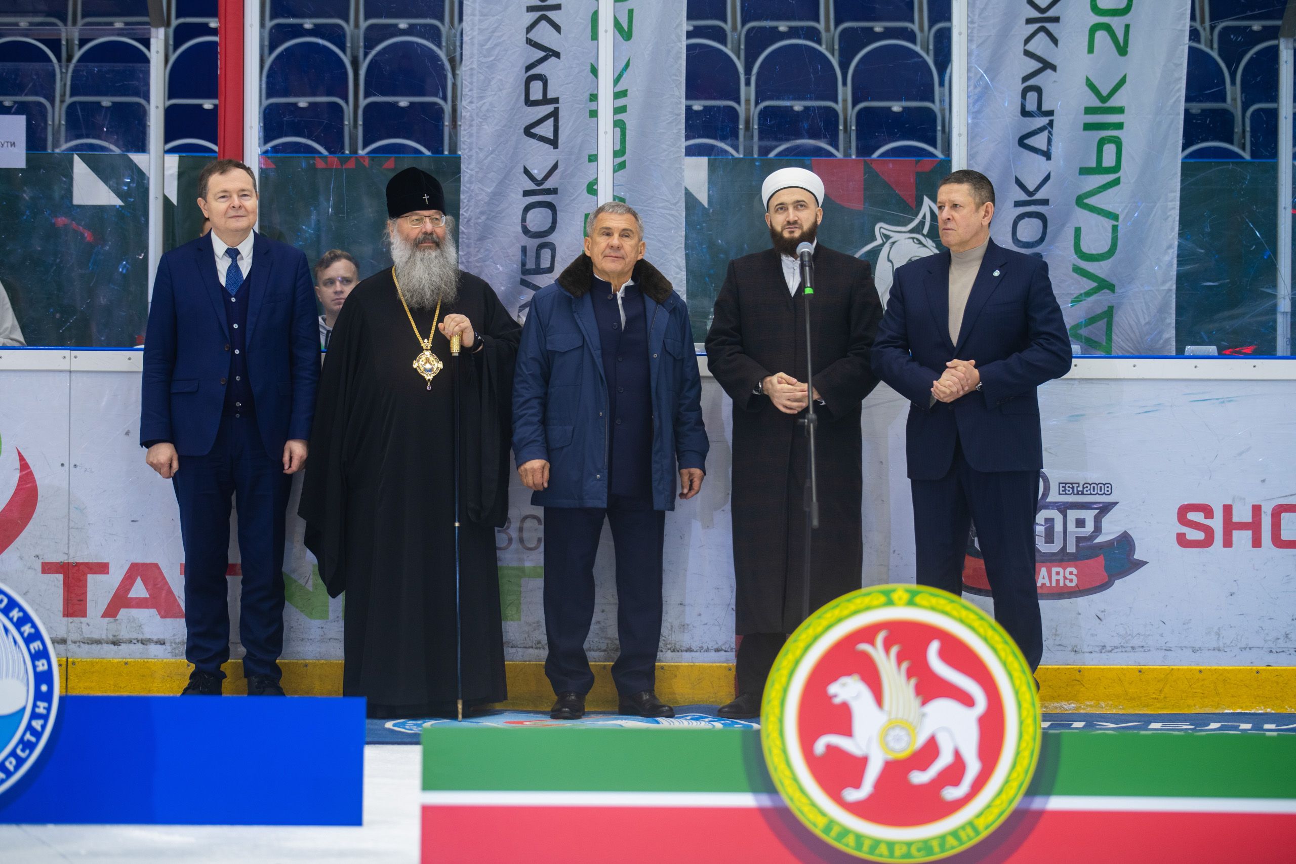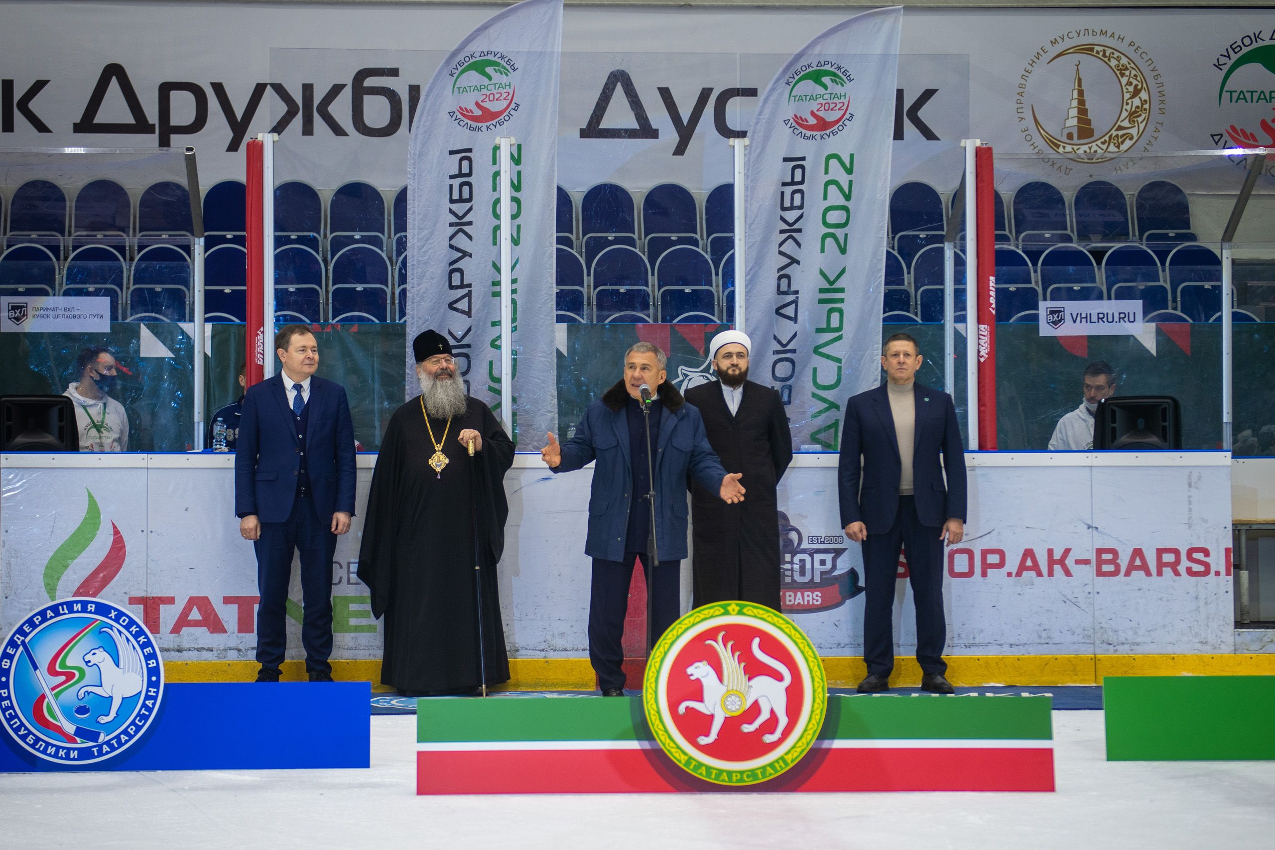 Добрый день, уважаемые спортсмены и зрители! Я очень рад, что в нашей Республике проходит такой прекрасный турнир. Команды демонстрируют хоккей высокого уровня. Очень красивая игра, прекрасные болельщики, кругом царит атмосфера дружбы. Православные и мусульмане выходят на лёд вместе, и наши военные с нами! Так и должно быть. Уверен, что проведение Кубка дружбы станет доброй традицией. Желаю всем вам хорошей зрелищной игры! Хоккей — любимый вид спорта татарстанцев. Спасибо вам, что вы участвуете в его развитии!