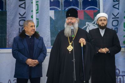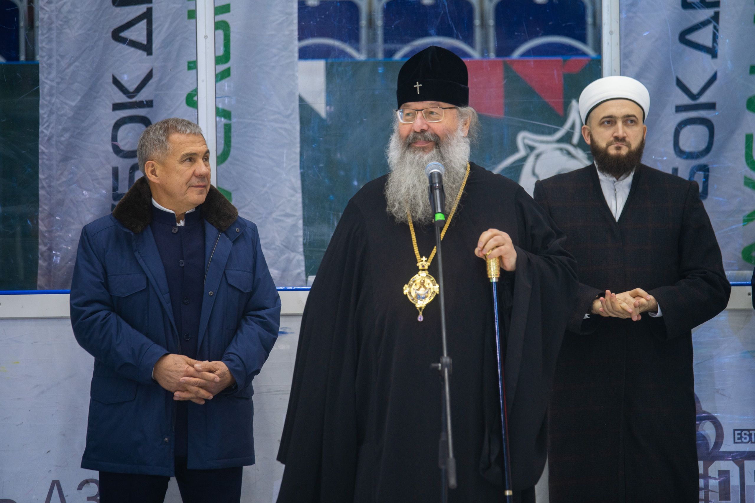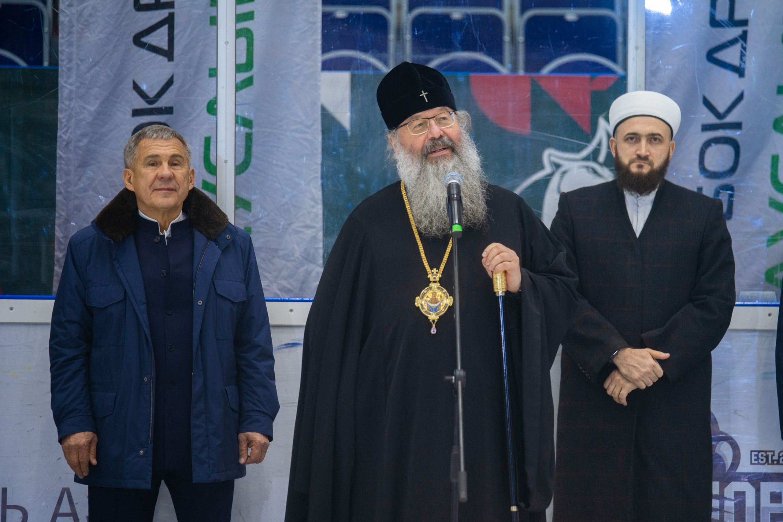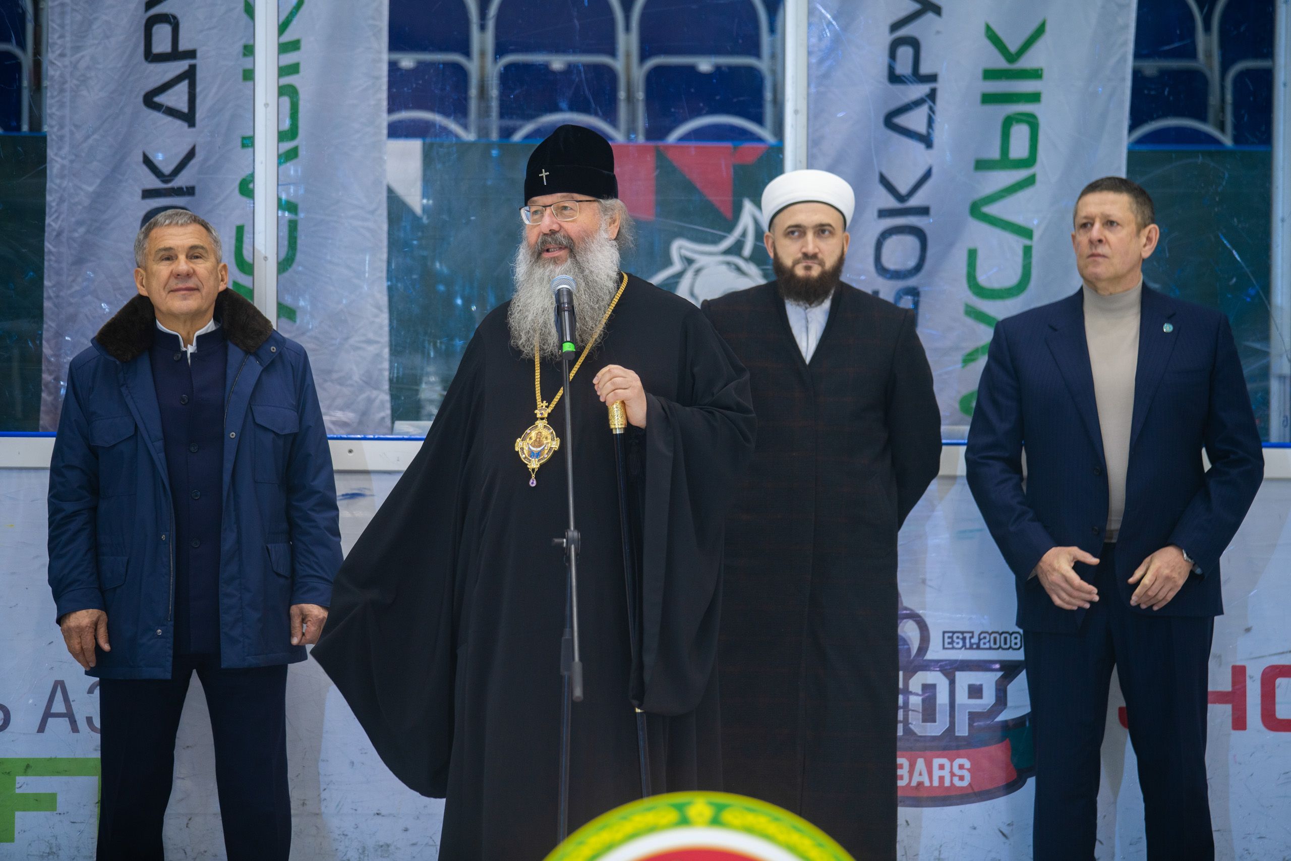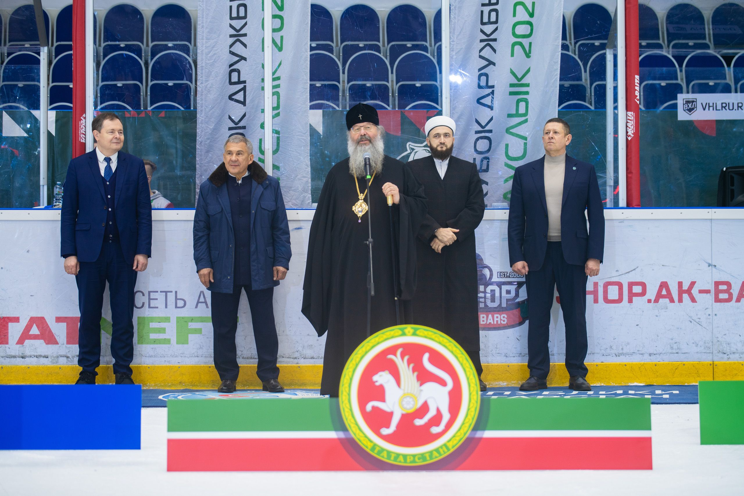 Такое ощущение, словно мы сегодня находимся на Кубке Гагарина. Прекрасная игра! Спасибо большое командам! Дай Вам Бог здоровья, Божией помощи. Мы с Камилем хазратом стоим сегодня рядом с нашим Президентом, а по-другому и не может быть. Наш народ не должен разделяться. Мы все едины перед лицом Божиим. Важно, чтобы мы были вместе и в спорте, и в жизни. Дружба — Божий дар, который нужно всегда ценить, согревать в своем сердцем, утверждать в своей жизни. Нужно делать все возможное, чтобы хрупкий мир, который у нас сегодня существует, был скован настоящей мужской дружбой, чтобы мы жили в мире и благополучии по благословению Божиему.