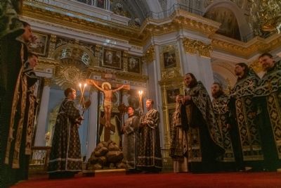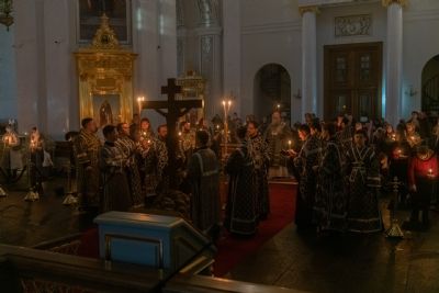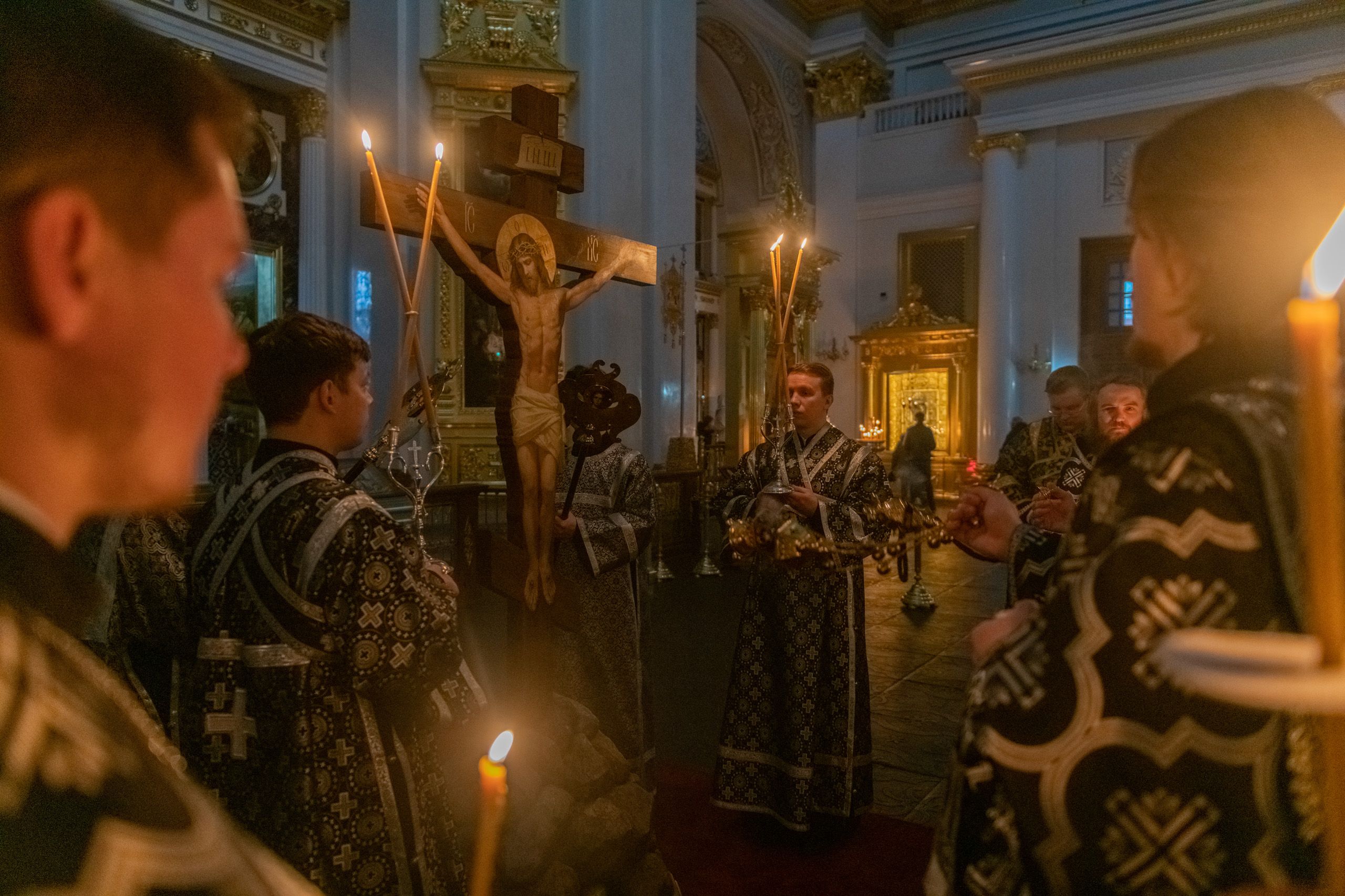 Сегодня мы совершили последование Пассии. Мы вновь пережили вместе со Христом Гефсиманскую молитву о чаше; мы были вместе со Христом во дворе первосвященников у Понтийского Пилата и вместе с немногими из учеников последовали за Господом на Голгофу. И что мы видим на Голгофе? Три Креста: один разбойник распят одесную, а другой ошуюю. А вокруг шумная толпа, которая кричит «распни» и радуется распинанию Спасителя. Отовсюду раздавался шум, и только на Кресте была тишина. Святая Церковь призывает нас в сегодняшний вечер побыть в тишине.