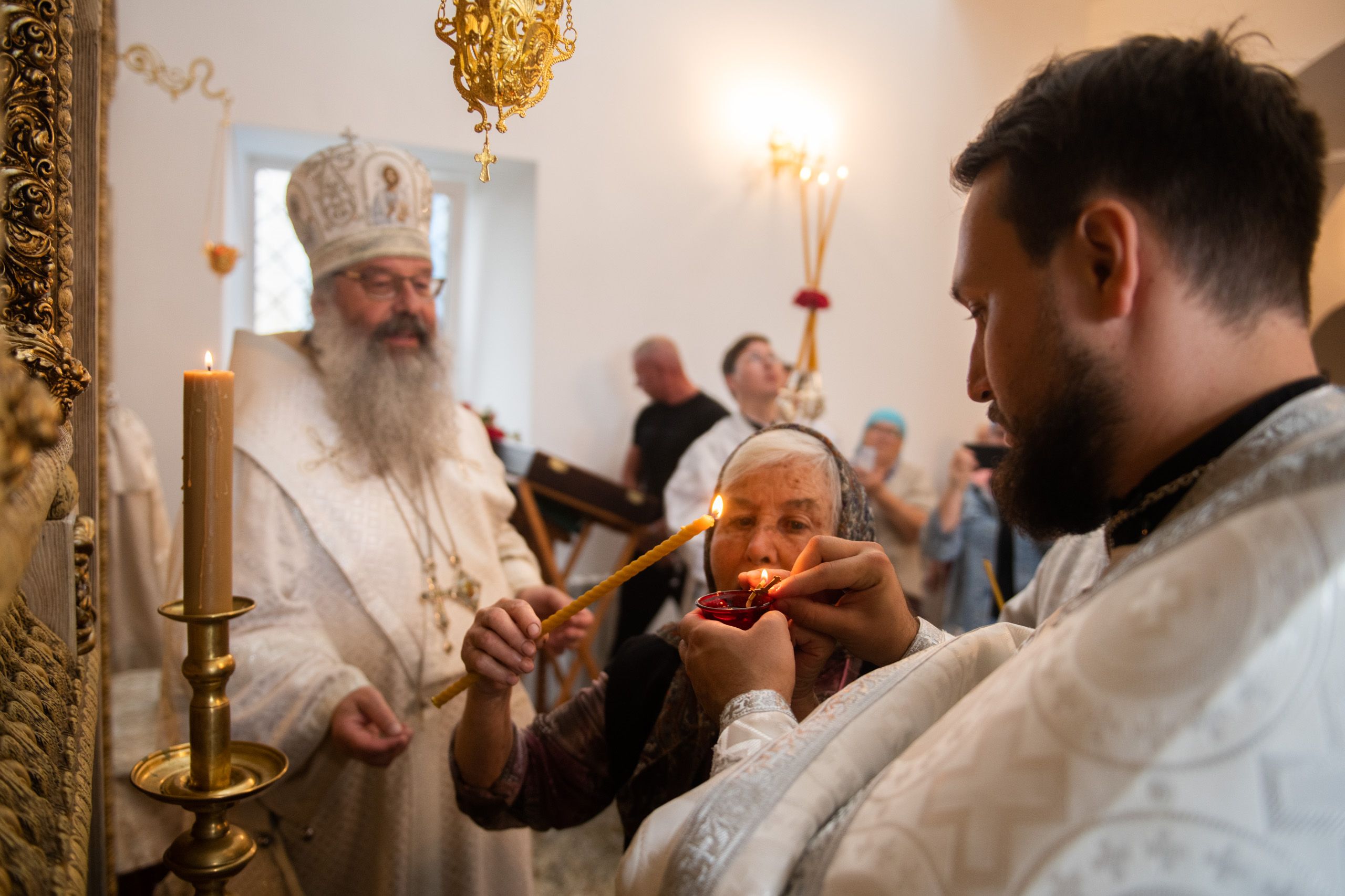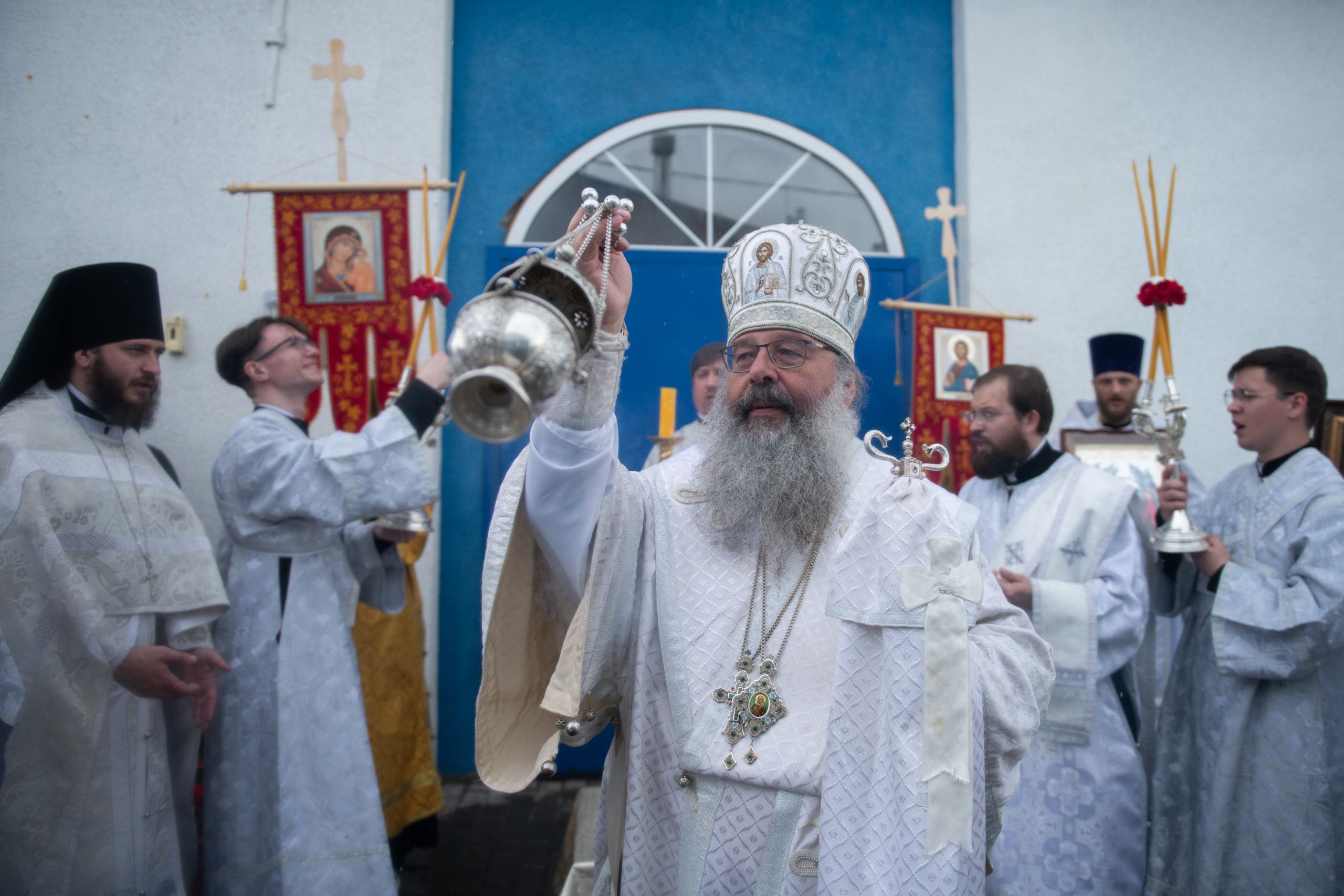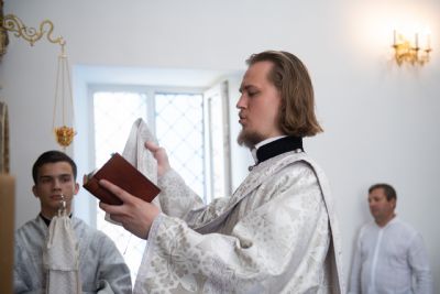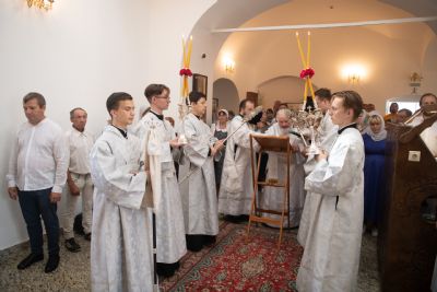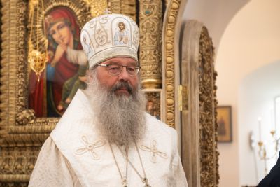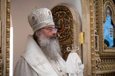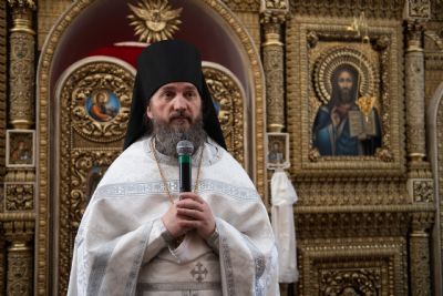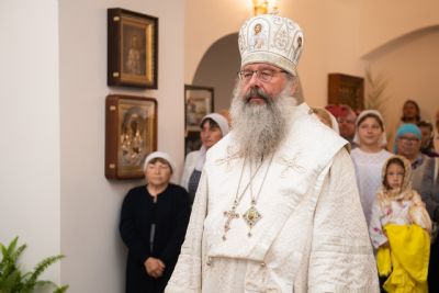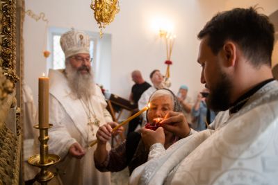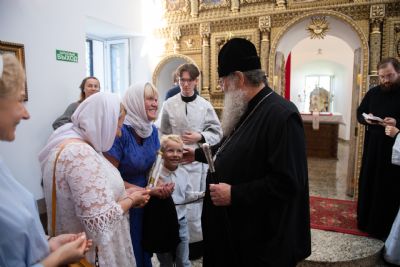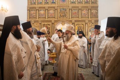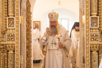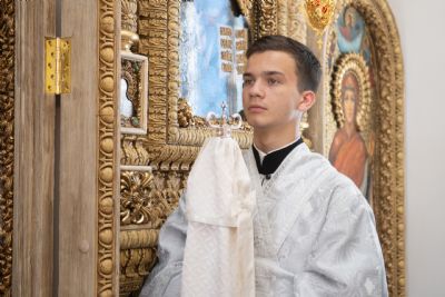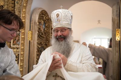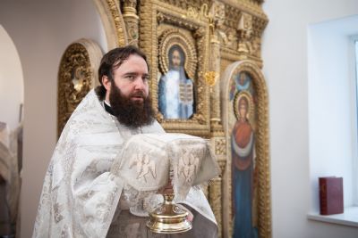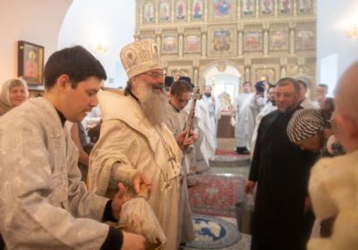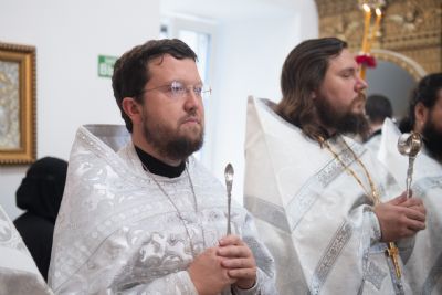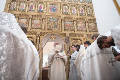 Затем глава митрополии в сослужении духовенства совершил в новоосвящённом храме Божественную литургию. На сугубой ектении владыка вознёс молитву о восстановлении мира. По запричастном стихе проповедь произнёс иеромонах Аркадий (Логинов).