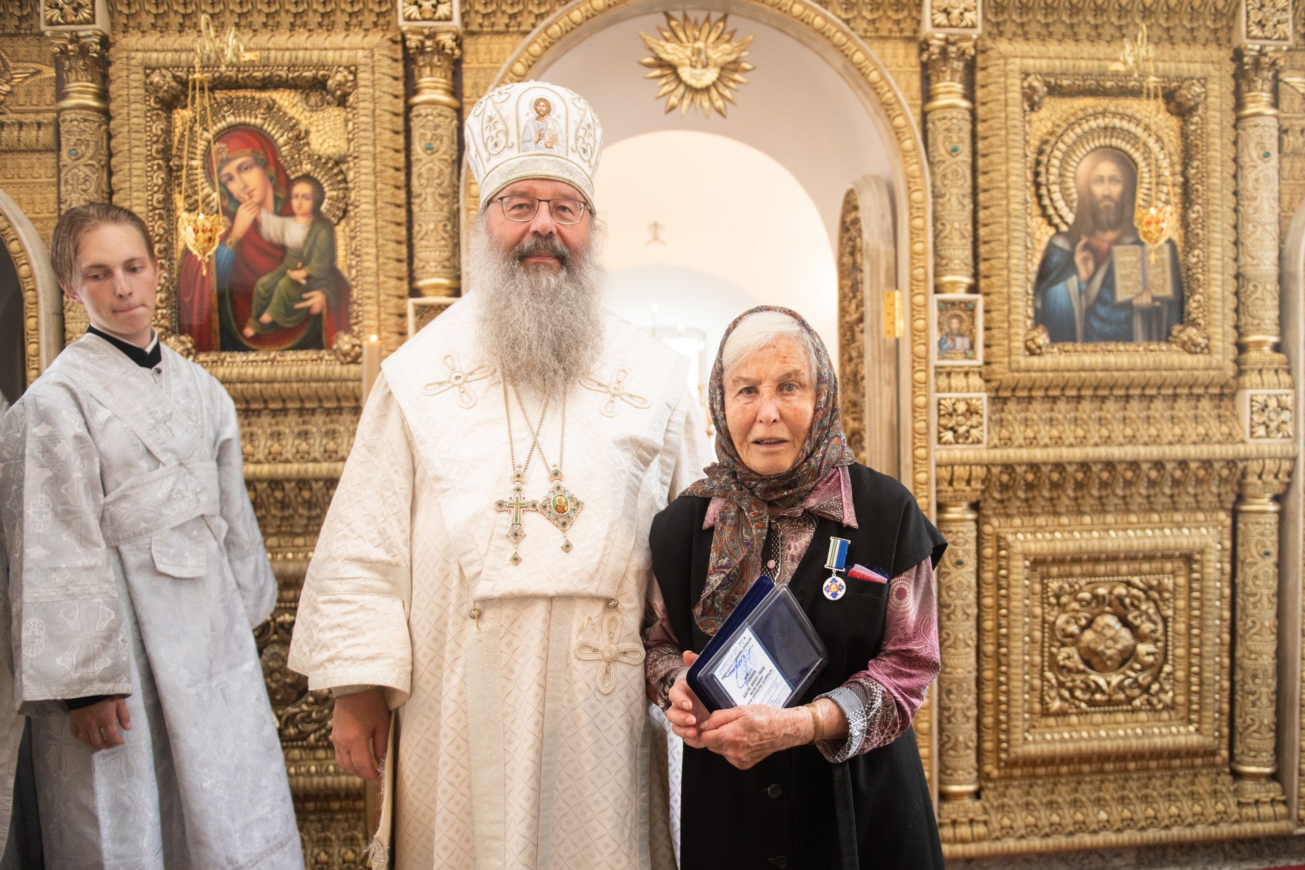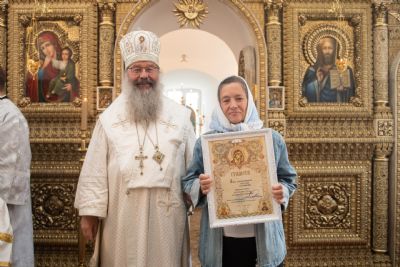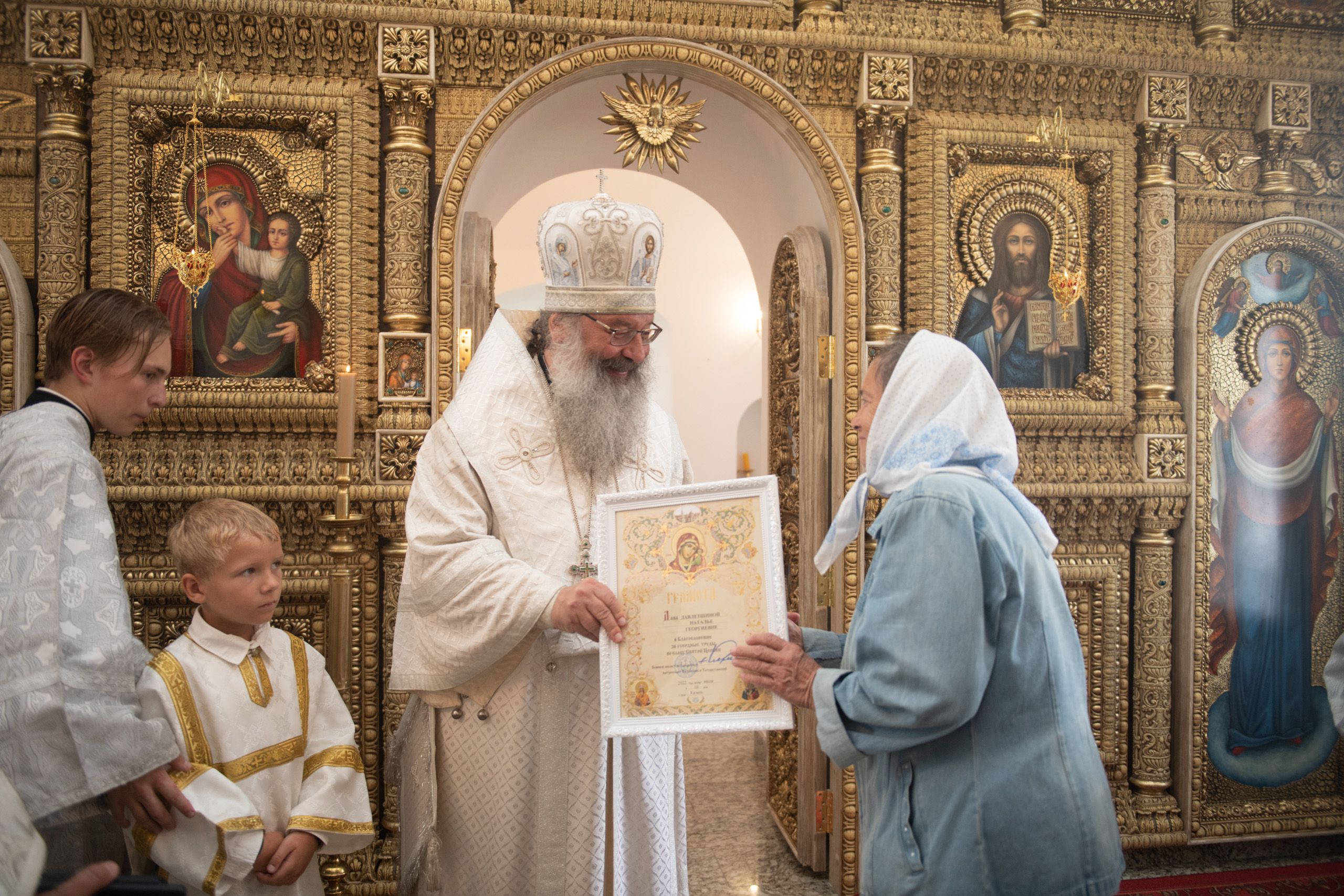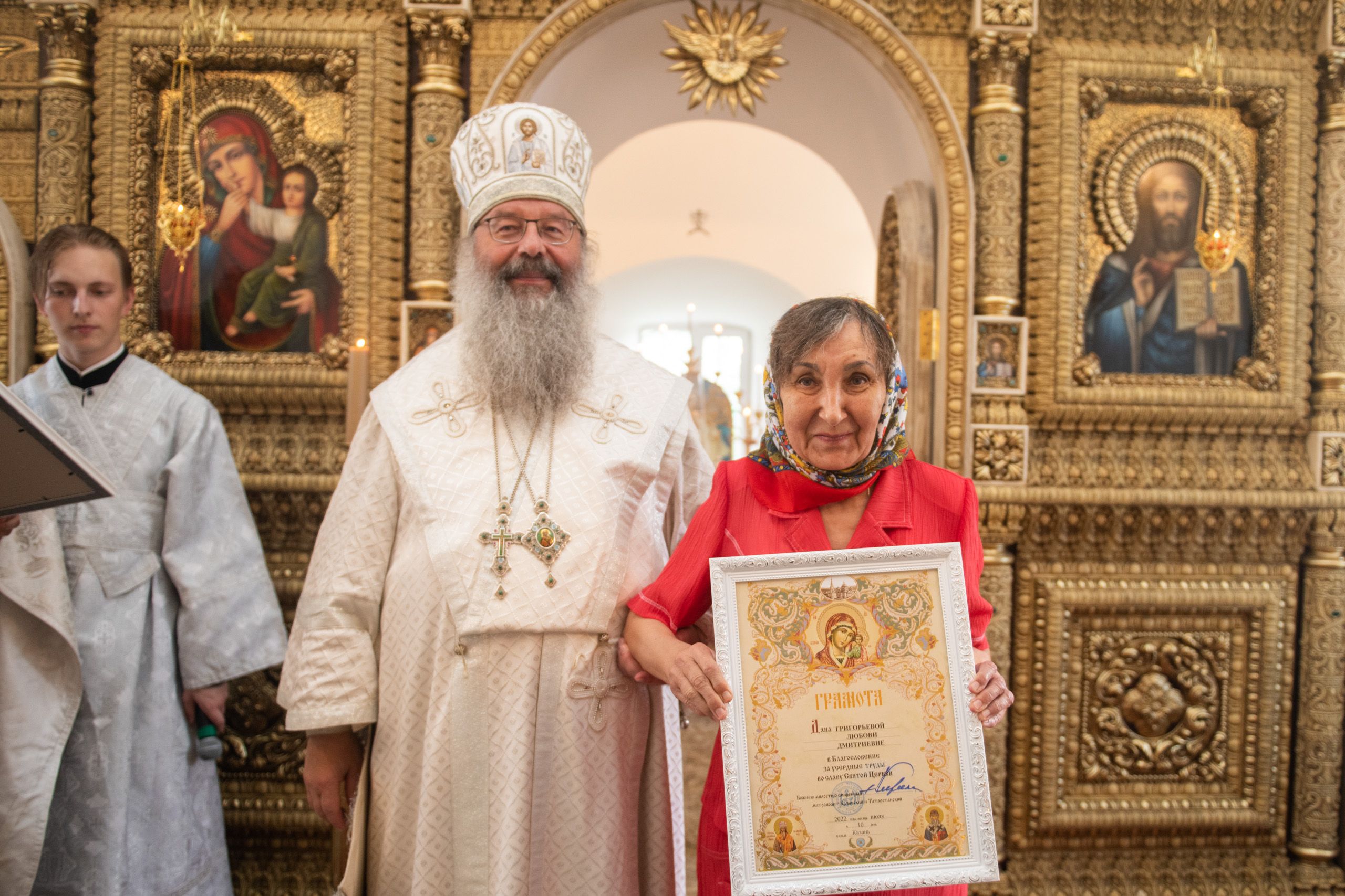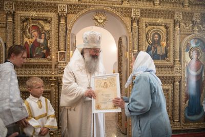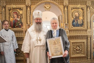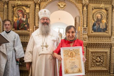 Затем митрополит Кирилл вручил церковные награды мирянам, которые усердно трудились над возрождением и благоустройством старинного храма. Олег Данилов и Юрий Пасыев были удостоены медалей святителя Гурия, первого архиепископа Казанского, I степени; Зоя Петрова награждена медалью Казанской иконы Божией Матери II степени; Любови Григорьевой, Валентине Владимировой, Наталье Давлетшиной архипастырь вручил благословенные архиерейские грамоты.