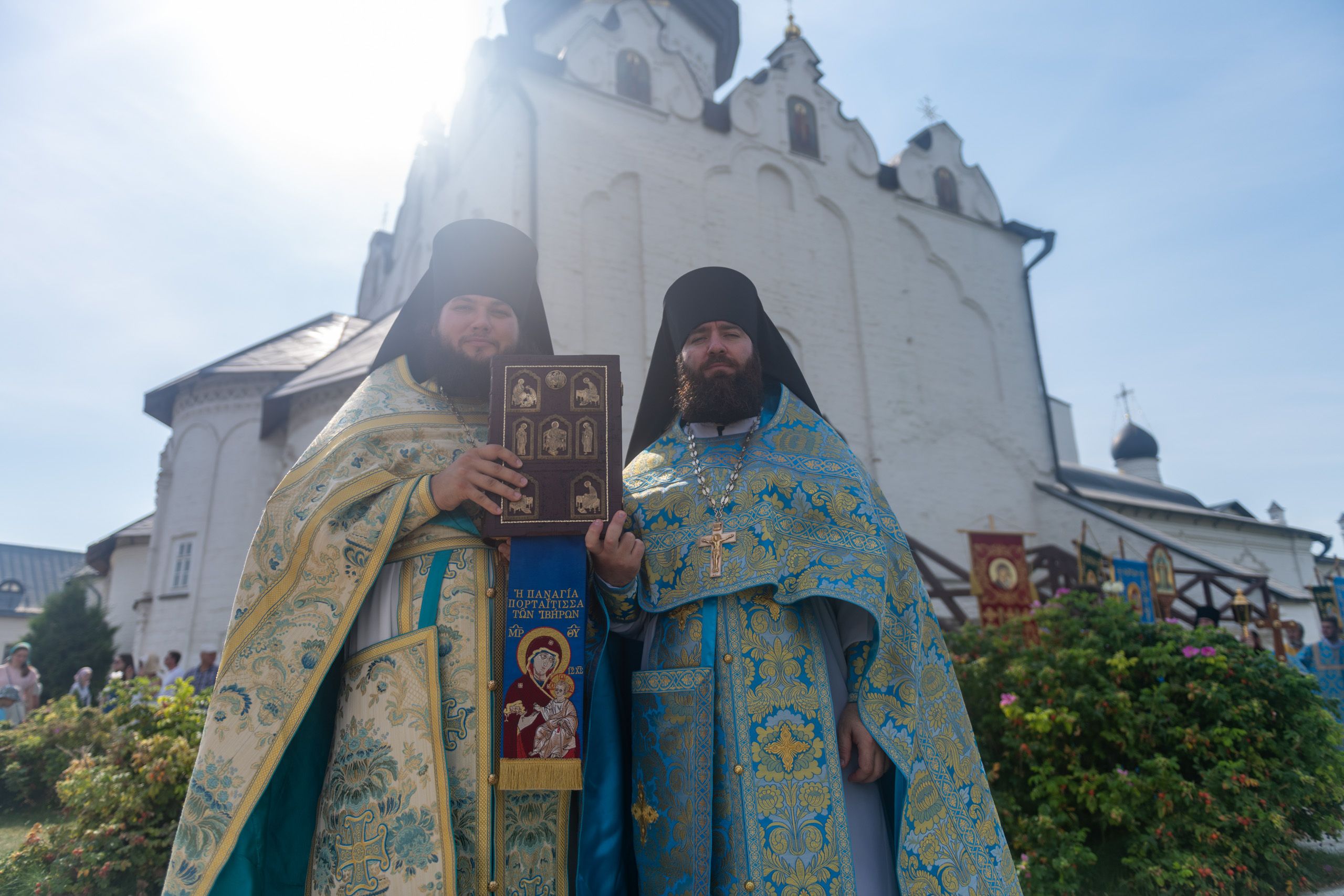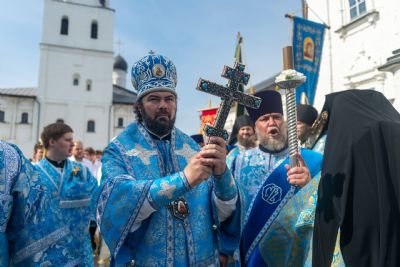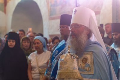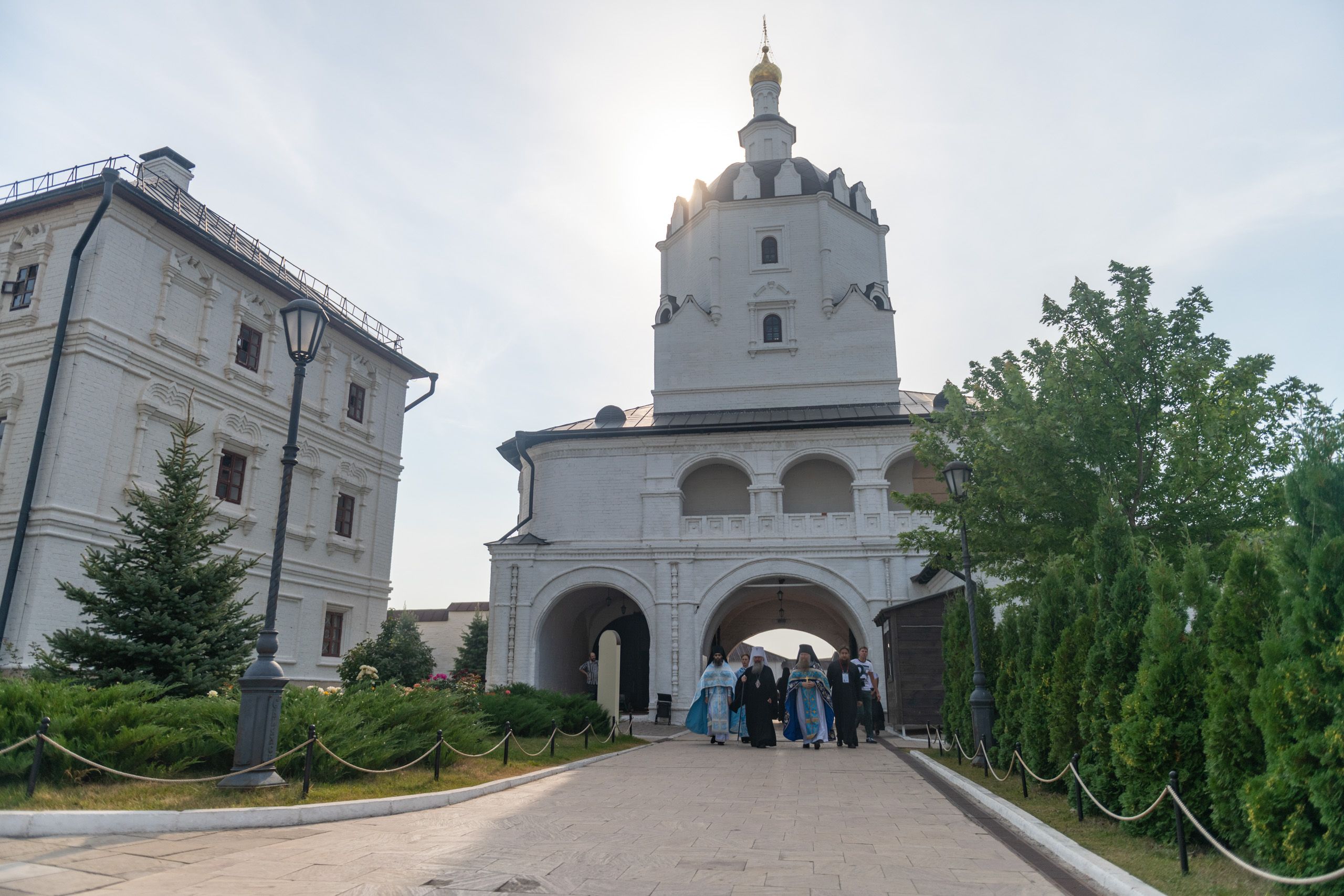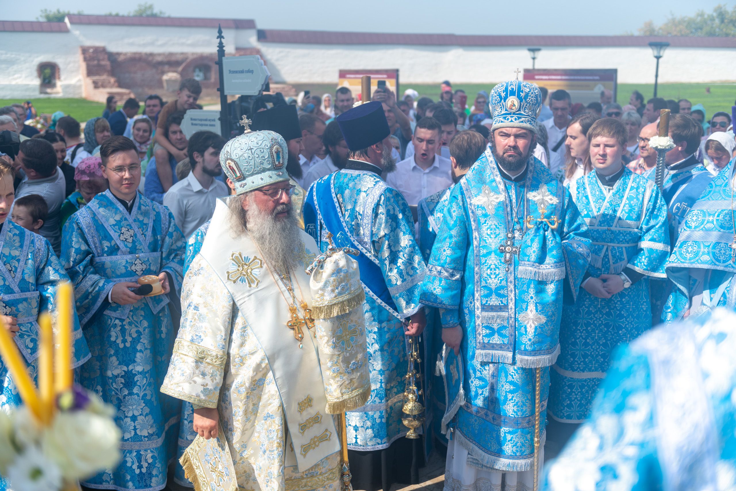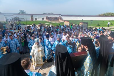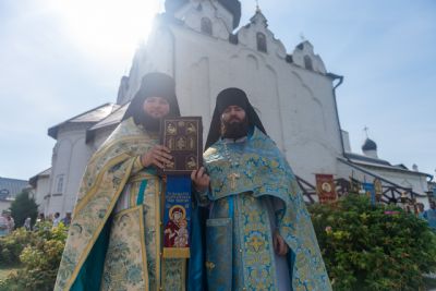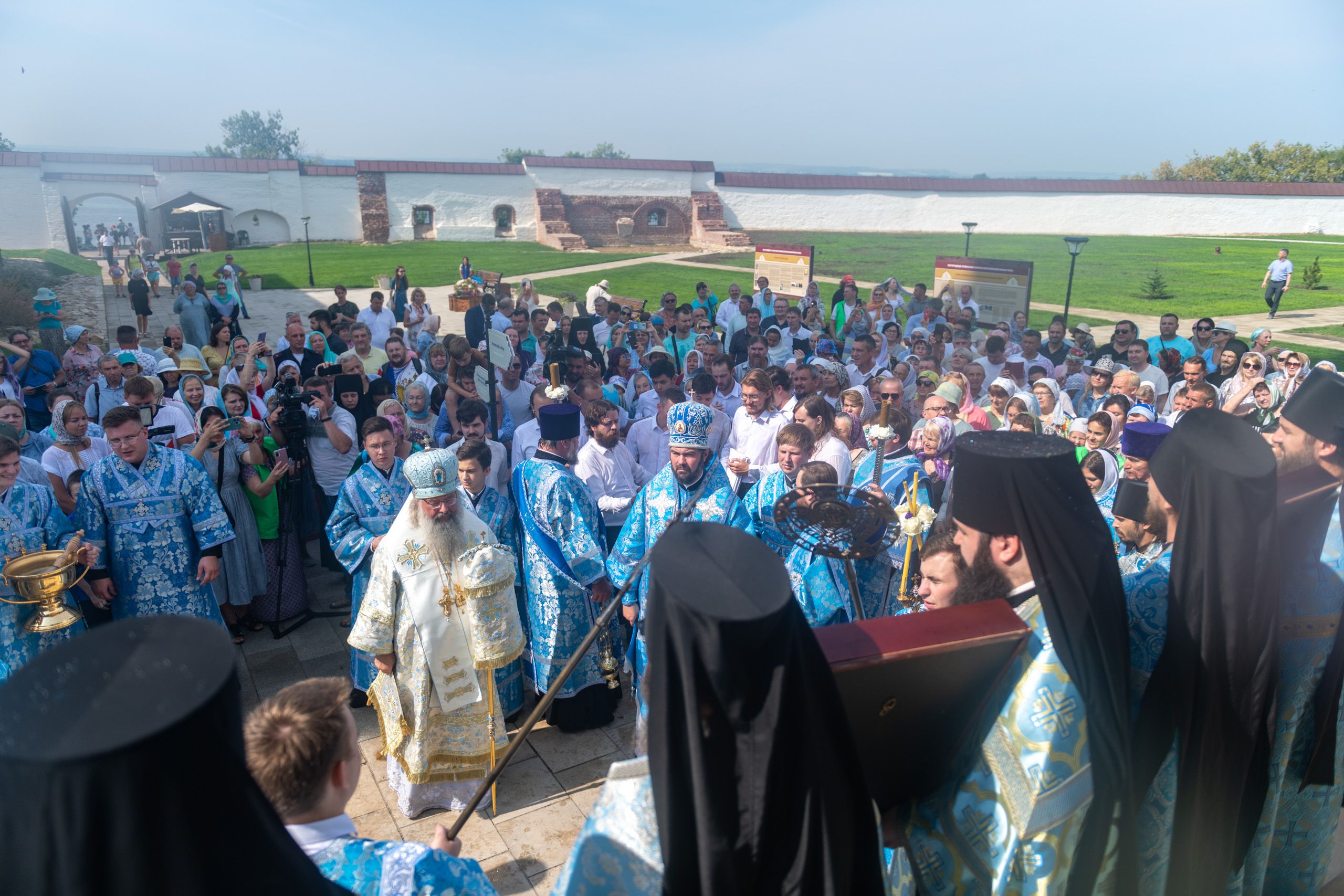 Всех вас поздравляю с удивительным материнским праздником любви Богородицы ко всем нам. Наши благочестивые предки поместили праздник Успения в центр своей духовной жизни и главные храмы старинных русских городов были освящены либо в честь Успения Богородицы, либо в честь Софии Премудрости Божией. Так и после основания Свияжска монахи Троице-Сергиевой лавры построили здесь первым храм в честь Живоначальной Троицы, а следом — Успенский. Почти 300 лет монахи совершали здесь своё служение — возносили молитвы, старались жить правильно, благочестиво. Но настало время, когда всё здесь залили кровью. Сегодня же исполнилось 25 лет с момента возрождения в Свияжске духовной жизни.