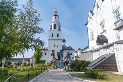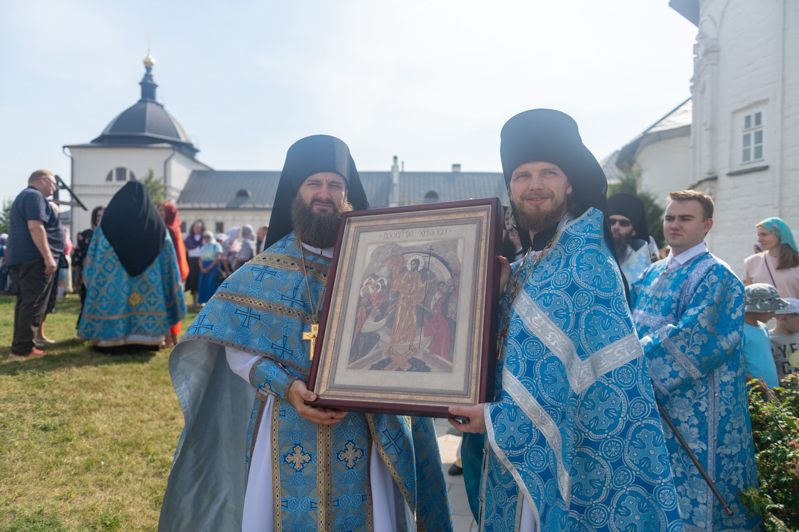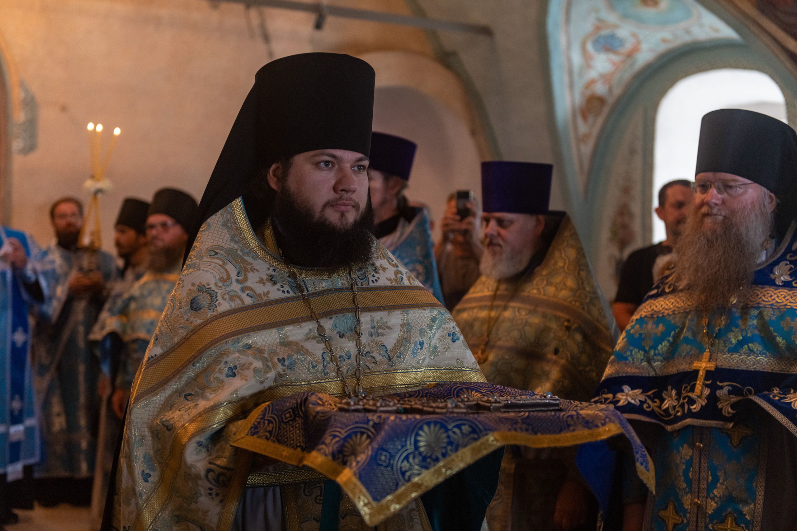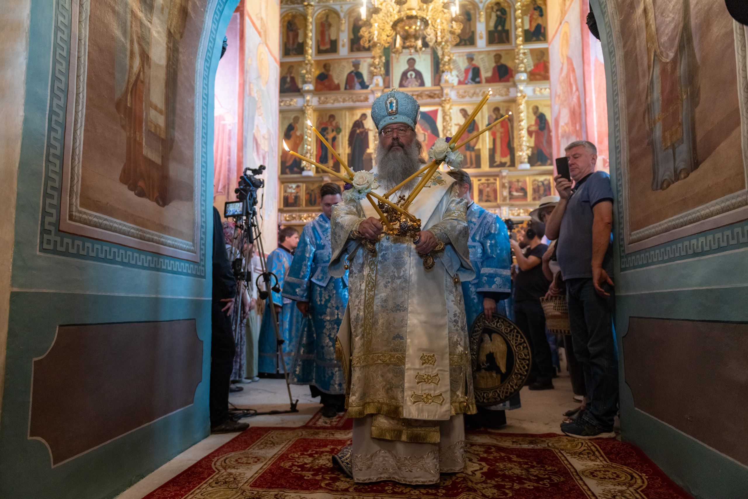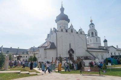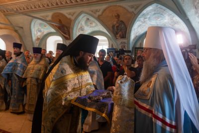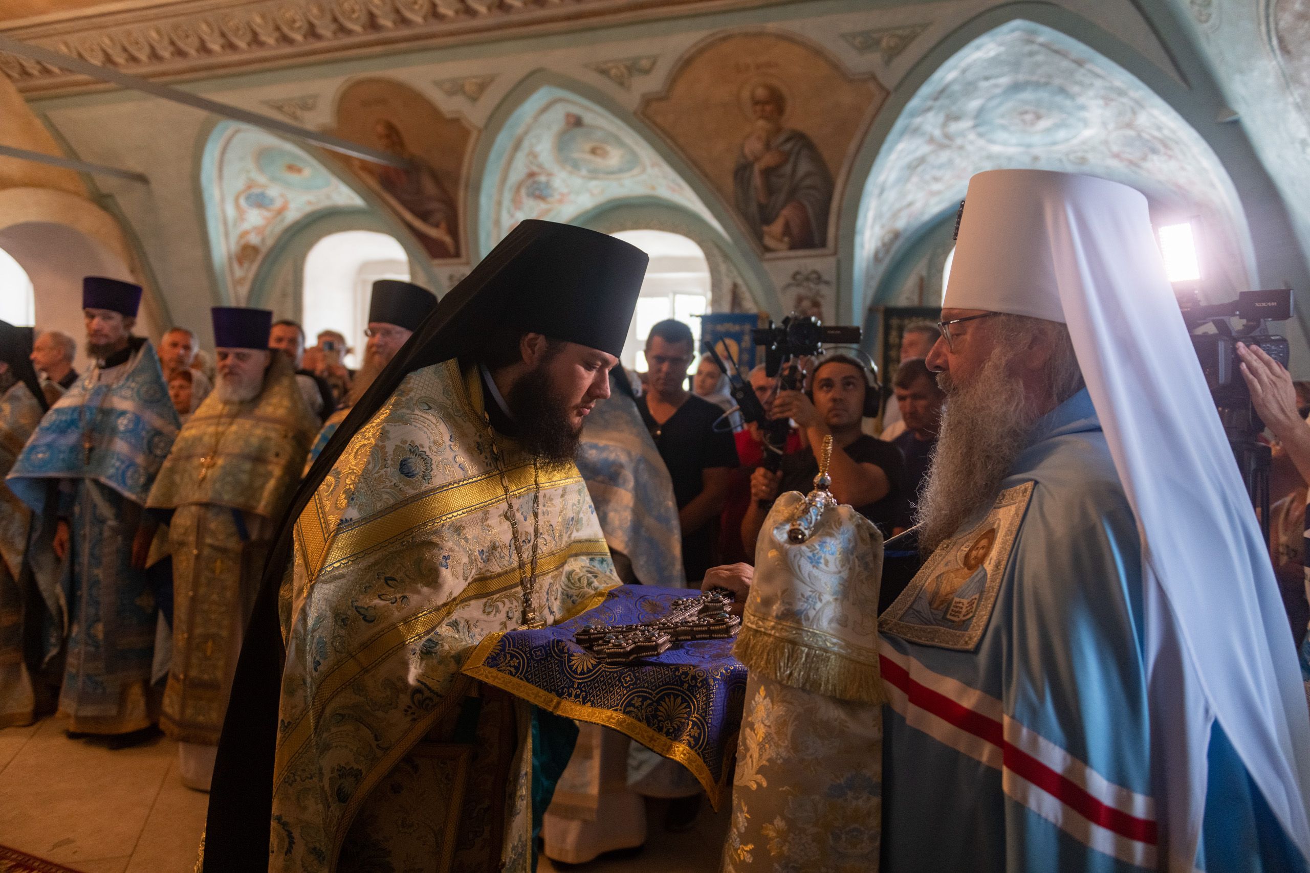 Всех вас поздравляю с удивительным материнским праздником любви Богородицы ко всем нам. Наши благочестивые предки поместили праздник Успения в центр своей духовной жизни и главные храмы старинных русских городов были освящены либо в честь Успения Богородицы, либо в честь Софии Премудрости Божией. Так и после основания Свияжска монахи Троице-Сергиевой лавры построили здесь первым храм в честь Живоначальной Троицы, а следом — Успенский. Почти 300 лет монахи совершали здесь своё служение — возносили молитвы, старались жить правильно, благочестиво. Но настало время, когда всё здесь залили кровью. Сегодня же исполнилось 25 лет с момента возрождения в Свияжске духовной жизни.
