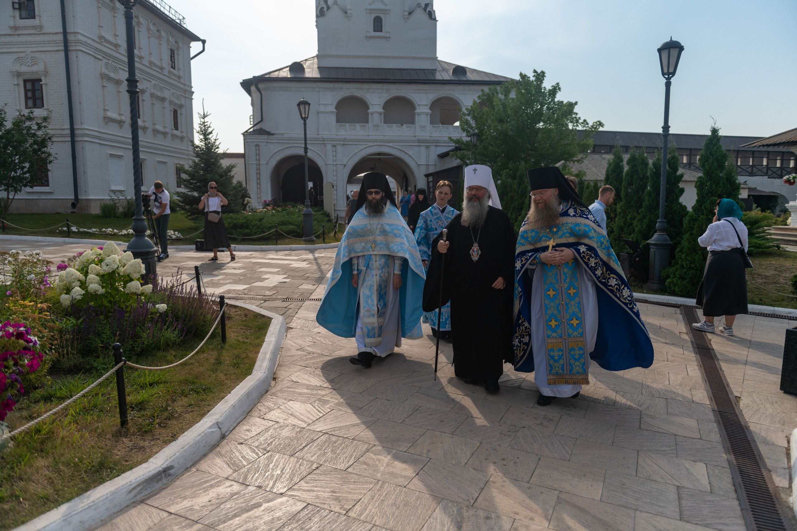 Архипастырям сослужили: бывший наместник Успенской обители игумен Силуан (Хохиашвили), наместник Свияжского Успенского монастыря игумен Симеон (Кулагин), наместник Казанского Богородицкого монастыря игумен Марк (Виленский), наместник Раифского Богородицкого монастыря игумен Гавриил (Рожнов), настоятель Кизического мужского монастыря города Казани игумен Пимен (Ивентьев); председатель Экспертного совета по церковному искусству, архитектуре и реставрации протоиерей Леонид Калинин, ректор Казанской духовной семинарии протоиерей Владимир Самойленко, благочинный Зеленодольского округа протоиерей Святослав Мирганиев; секретарь Татарстанской митрополии иеромонах Кирилл (Корытко), секретарь митрополита иеромонах Алексий (Яцейко), и.о. настоятеля Иоанновского монастыря города Казани иеромонах Гурий (Ананьев), настоятель Вознесенского Макарьевского монастыря иеромонах Амвросий (Горновский), насельник Казанского Богородицкого монастыря иеромонах Филипп (Киселёв), иеромонах Иустин (Денисов); иерей Максим Аширматов и братия Успенской обители в священном сане.