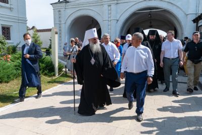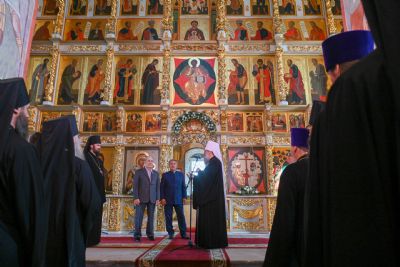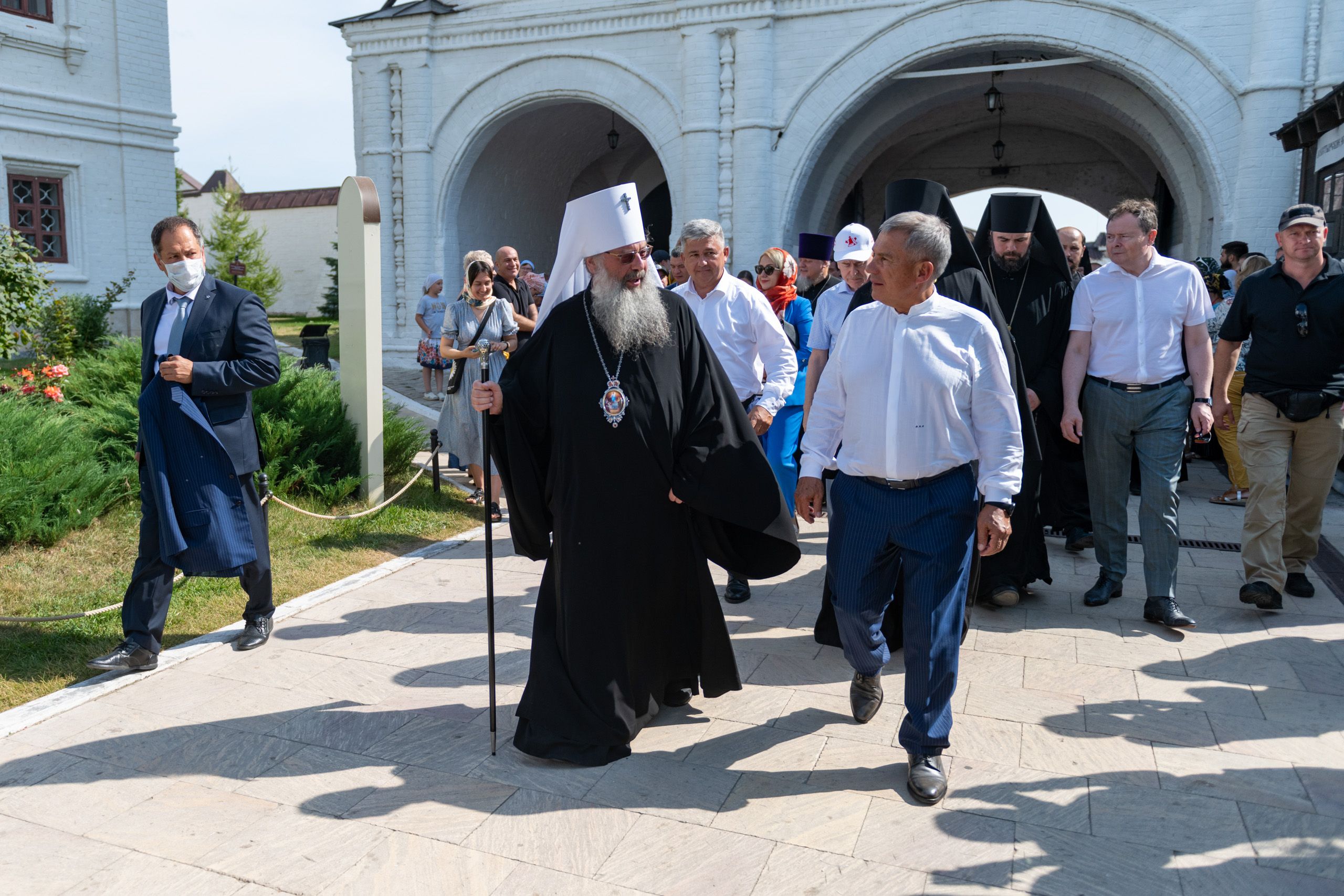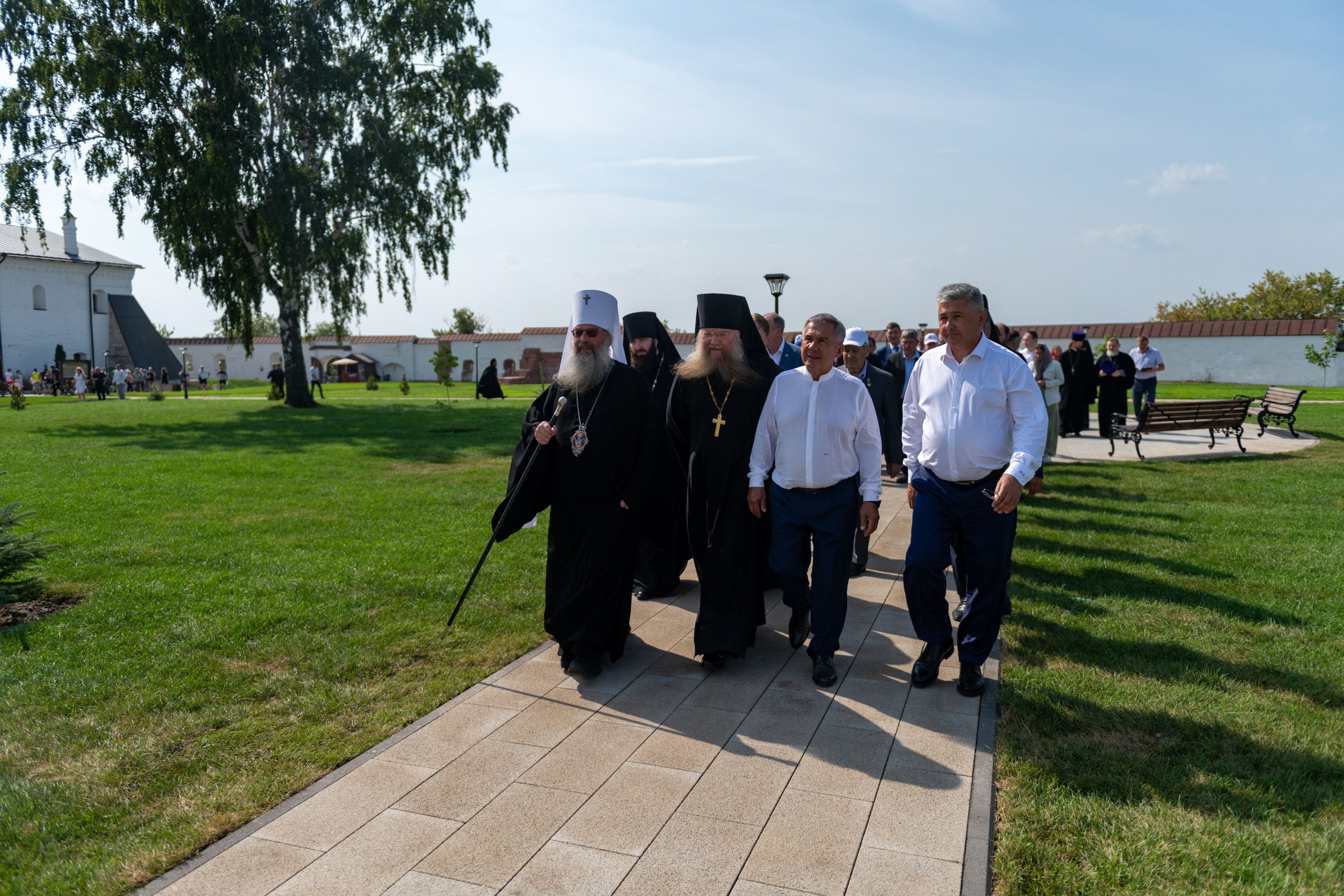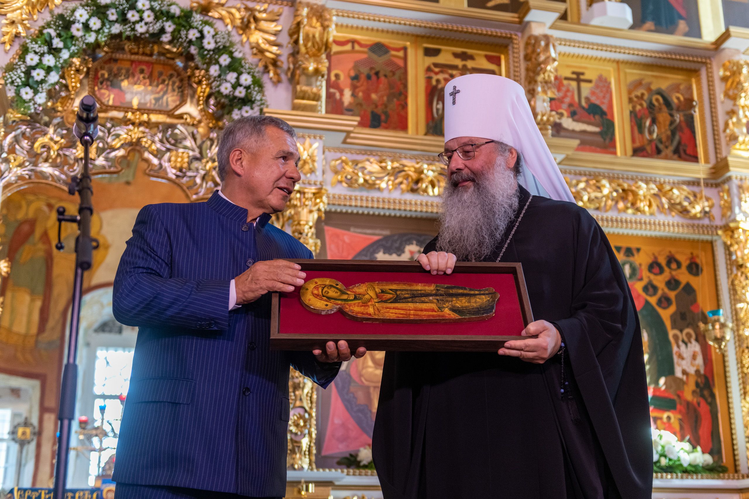 Рустам Минниханов преподнес в дар Богородице-Успенскому монастырю образ Божией Матери, написанный в Иерусалиме. Митрополит Кирилл и наместник Свияжского Успенского монастыря игумен Симеон (Кулагин) поблагодарили Президента РТ за подарок и добрые слова.