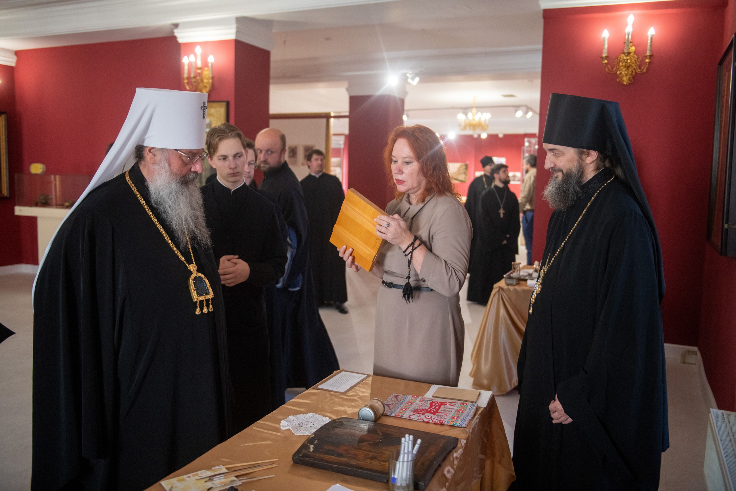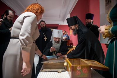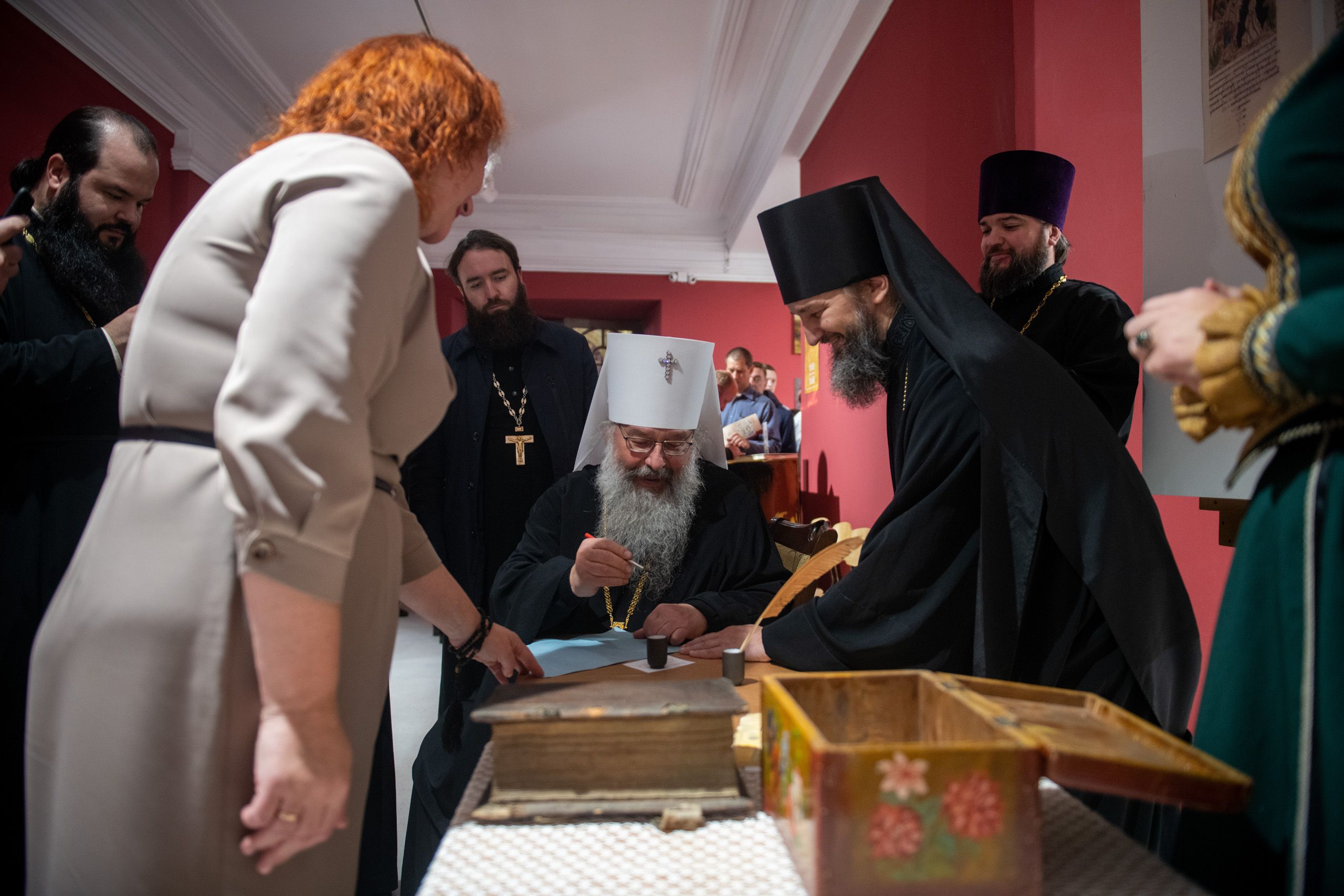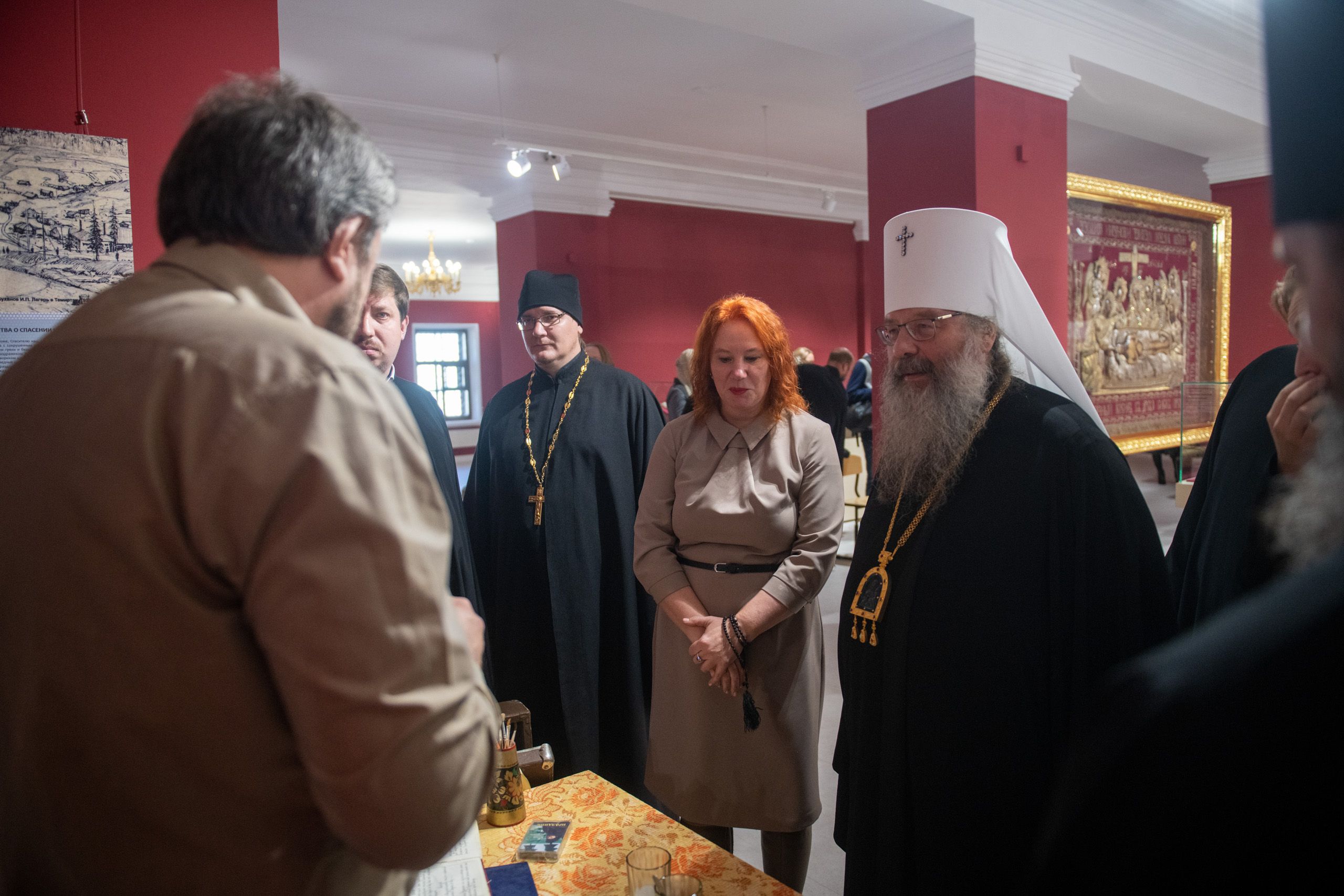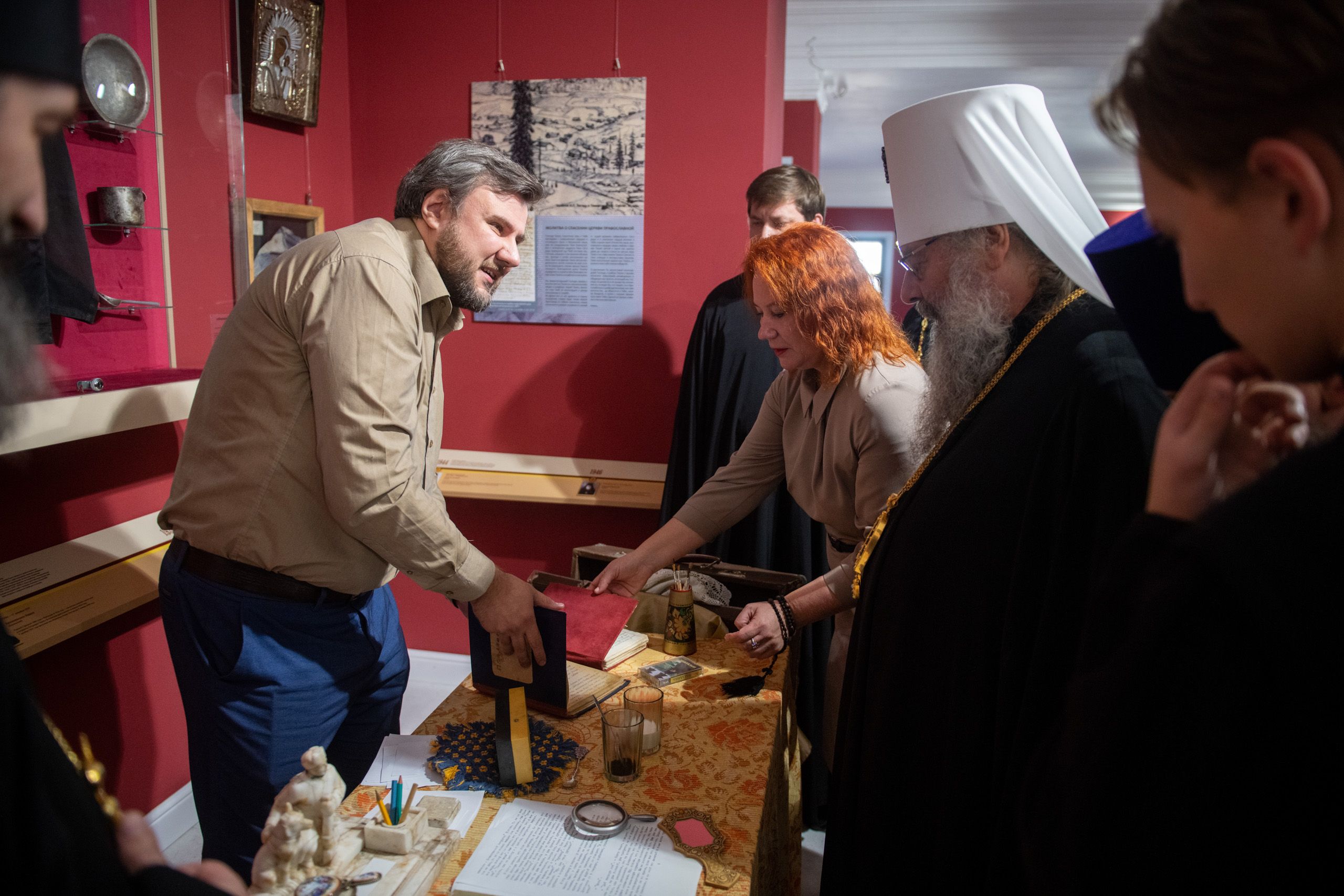 Затем правящий архиерей осмотрел музейные площадки. Здесь представлены предметы, рассказывающие об иконописи, церковной каллиграфии и рукодельном творчестве. На одной из площадок архиерей пером и чернилами оставил запись с благопожеланием.
