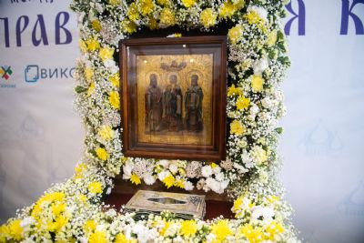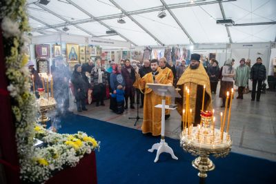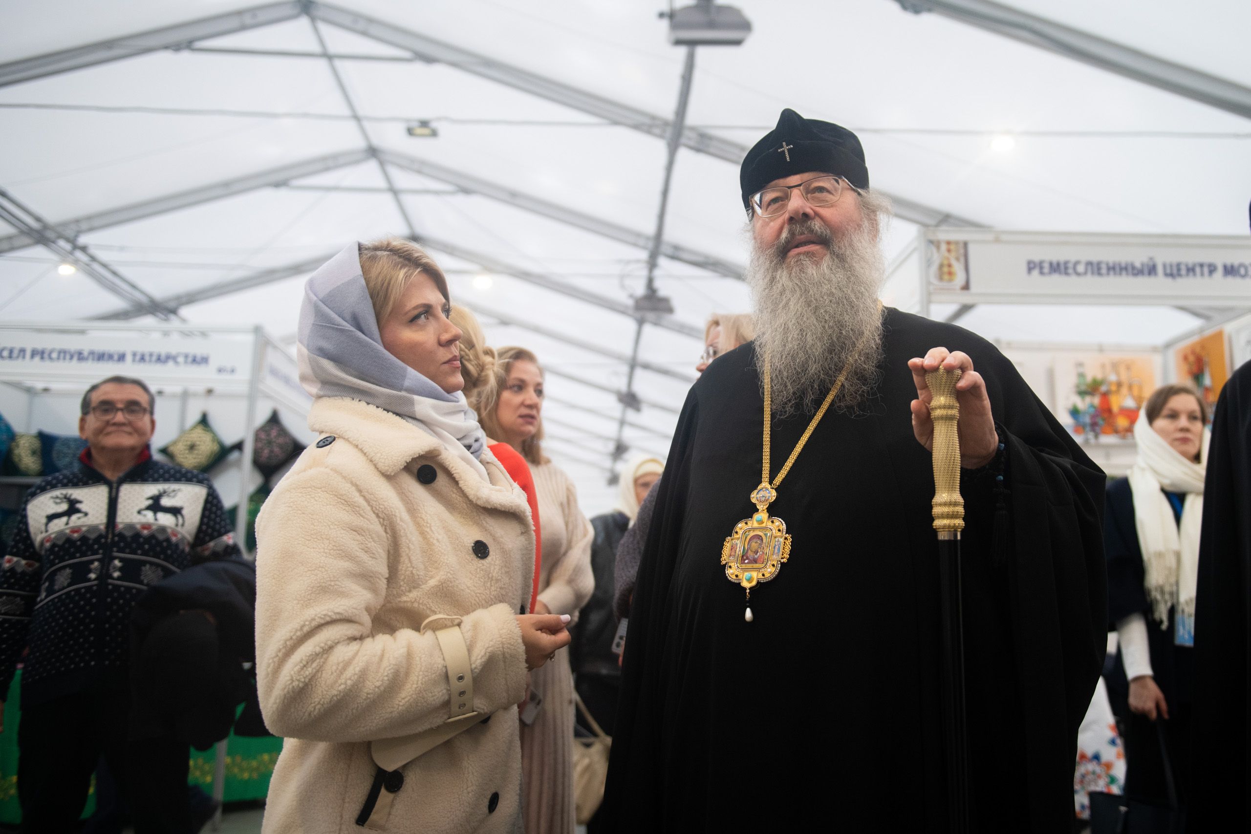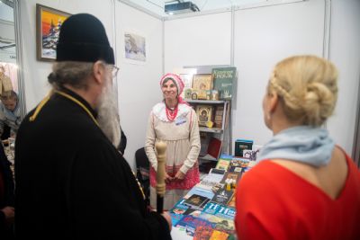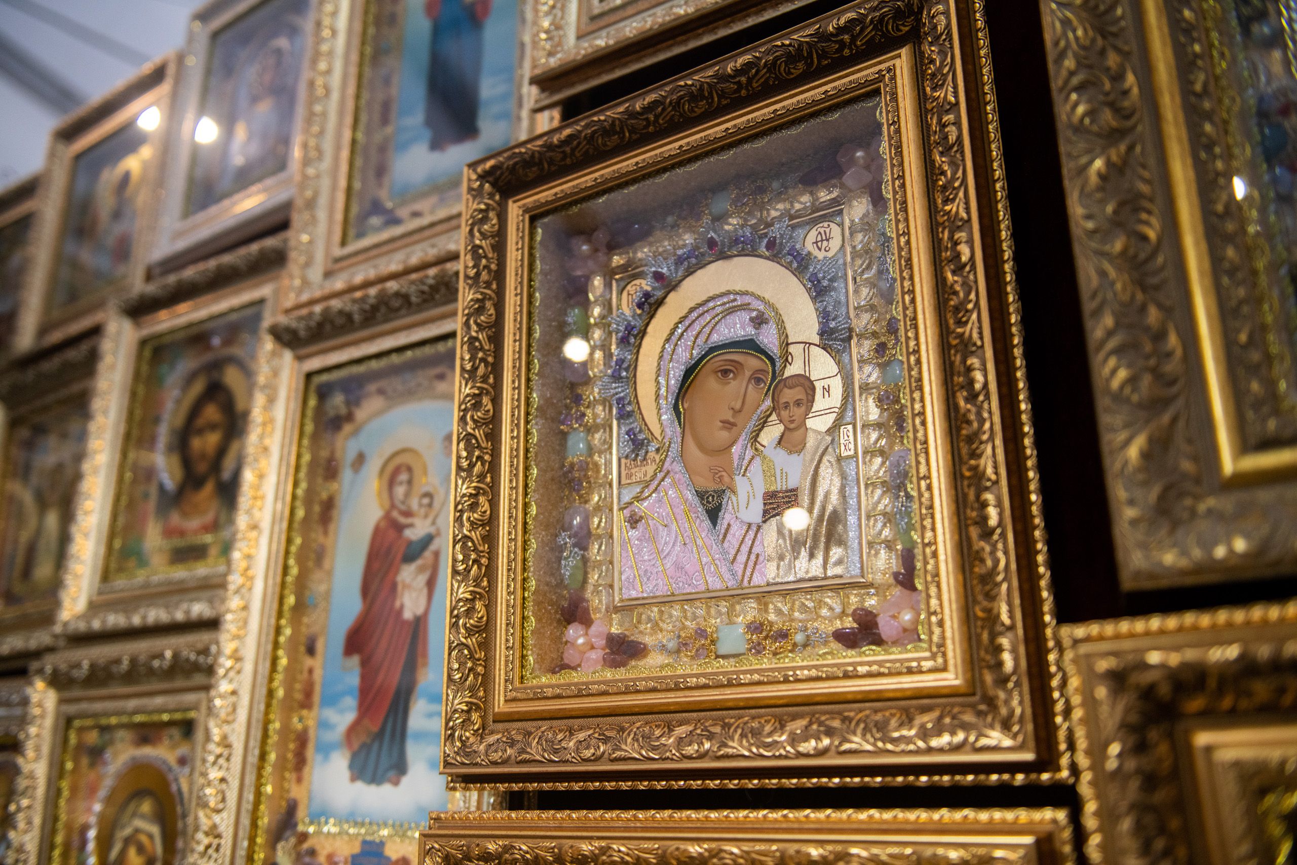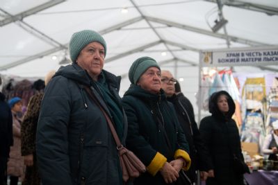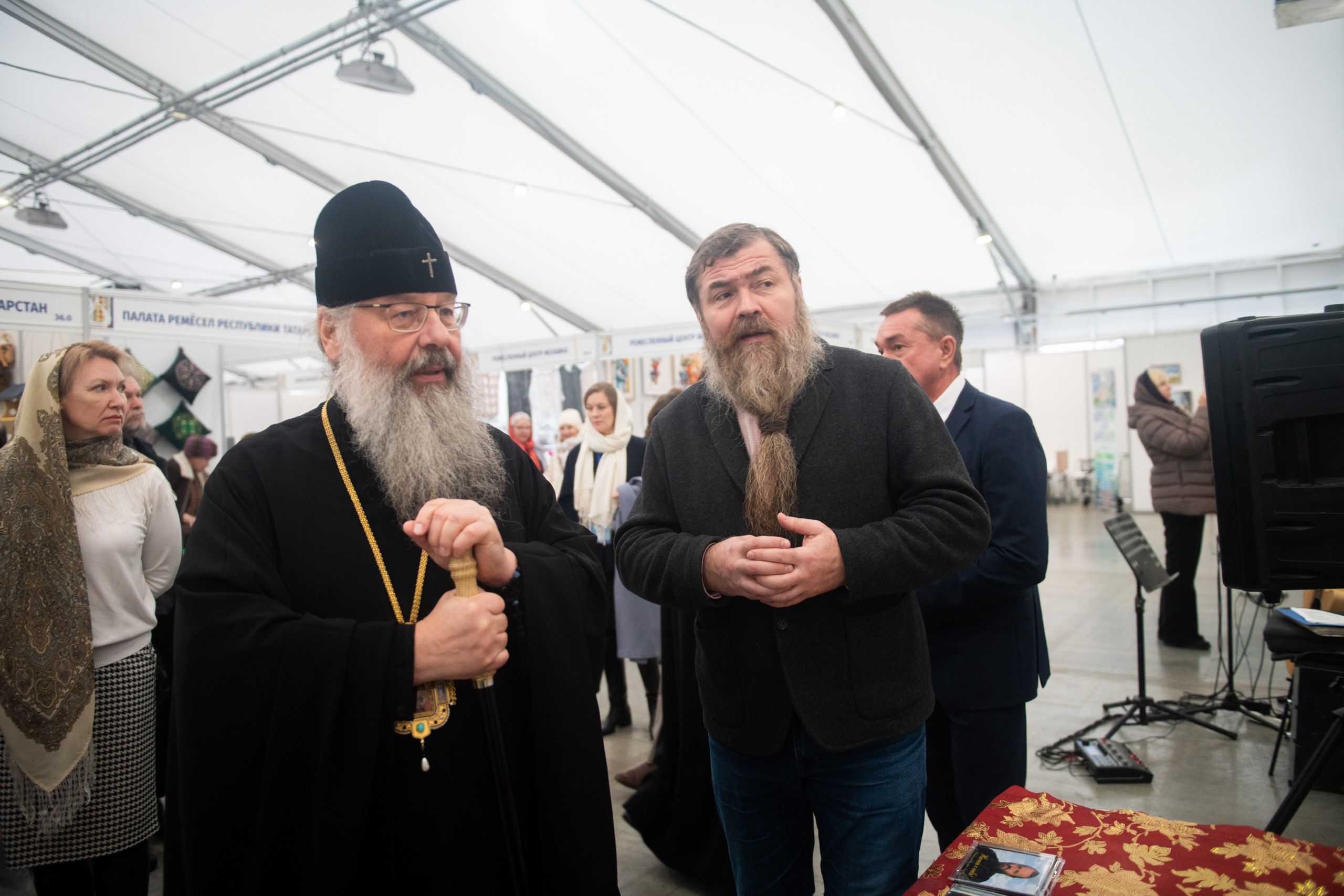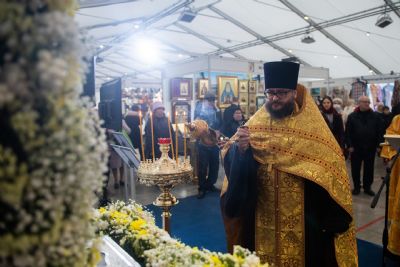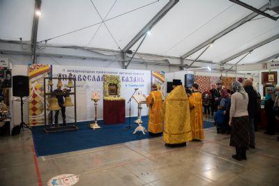 Для молитвенного поклонения верующих в павильоне ярмарки выставлены ковчег с частицами мощей святителей Гурия, Германа и Варсонофия и чтимый образ архипастырей Казанских.