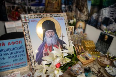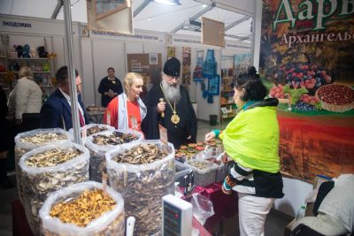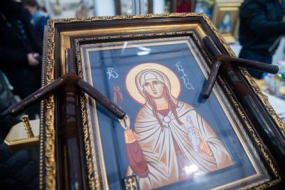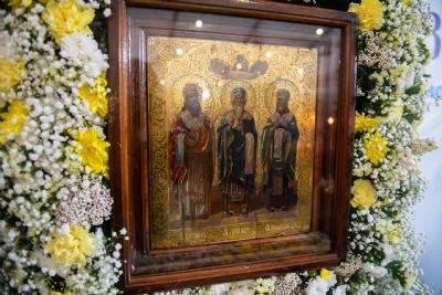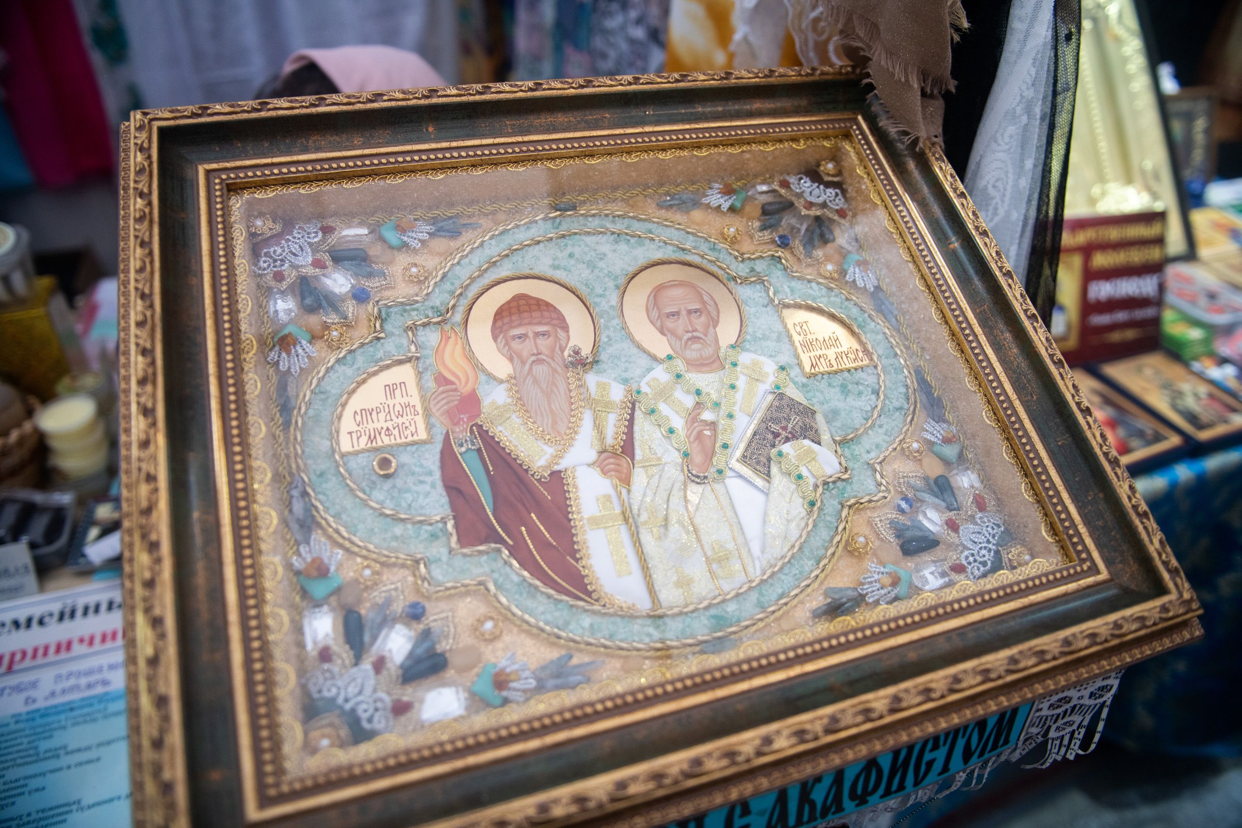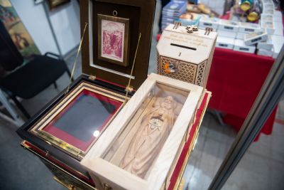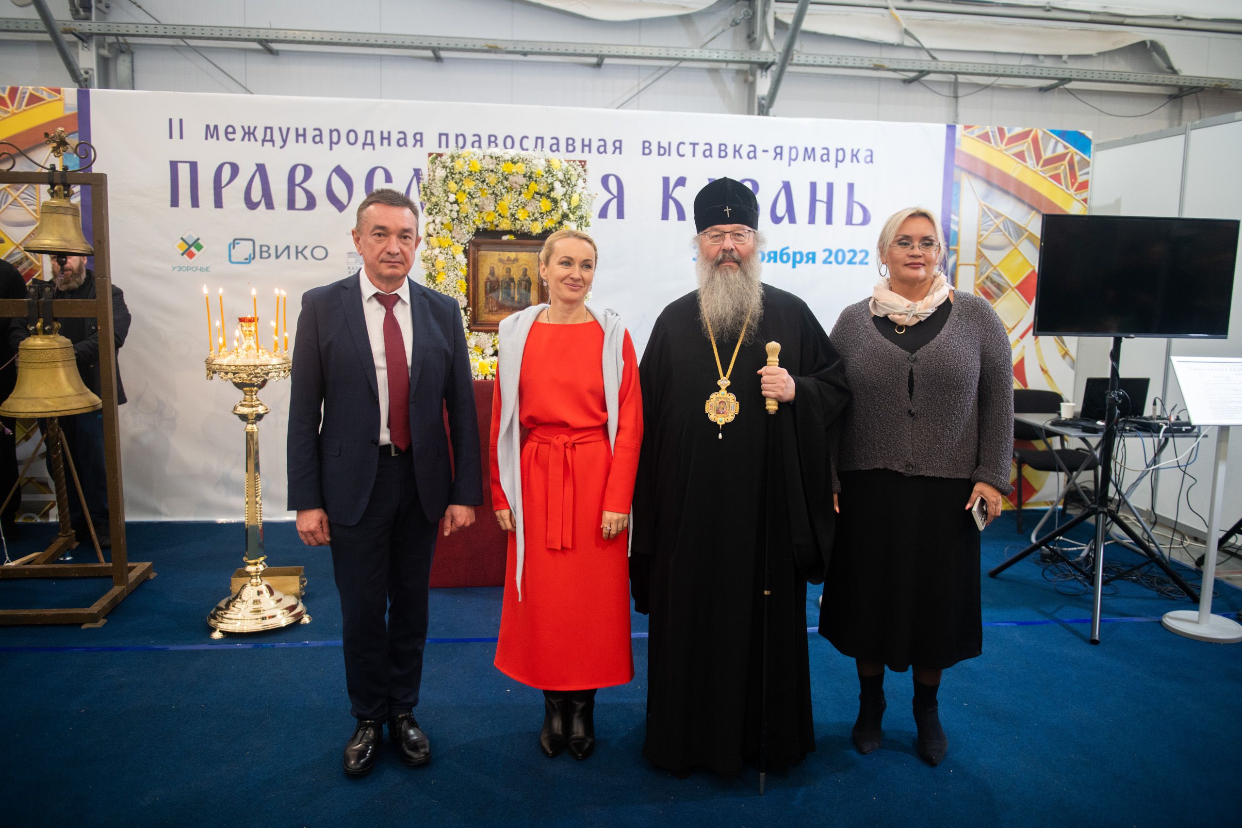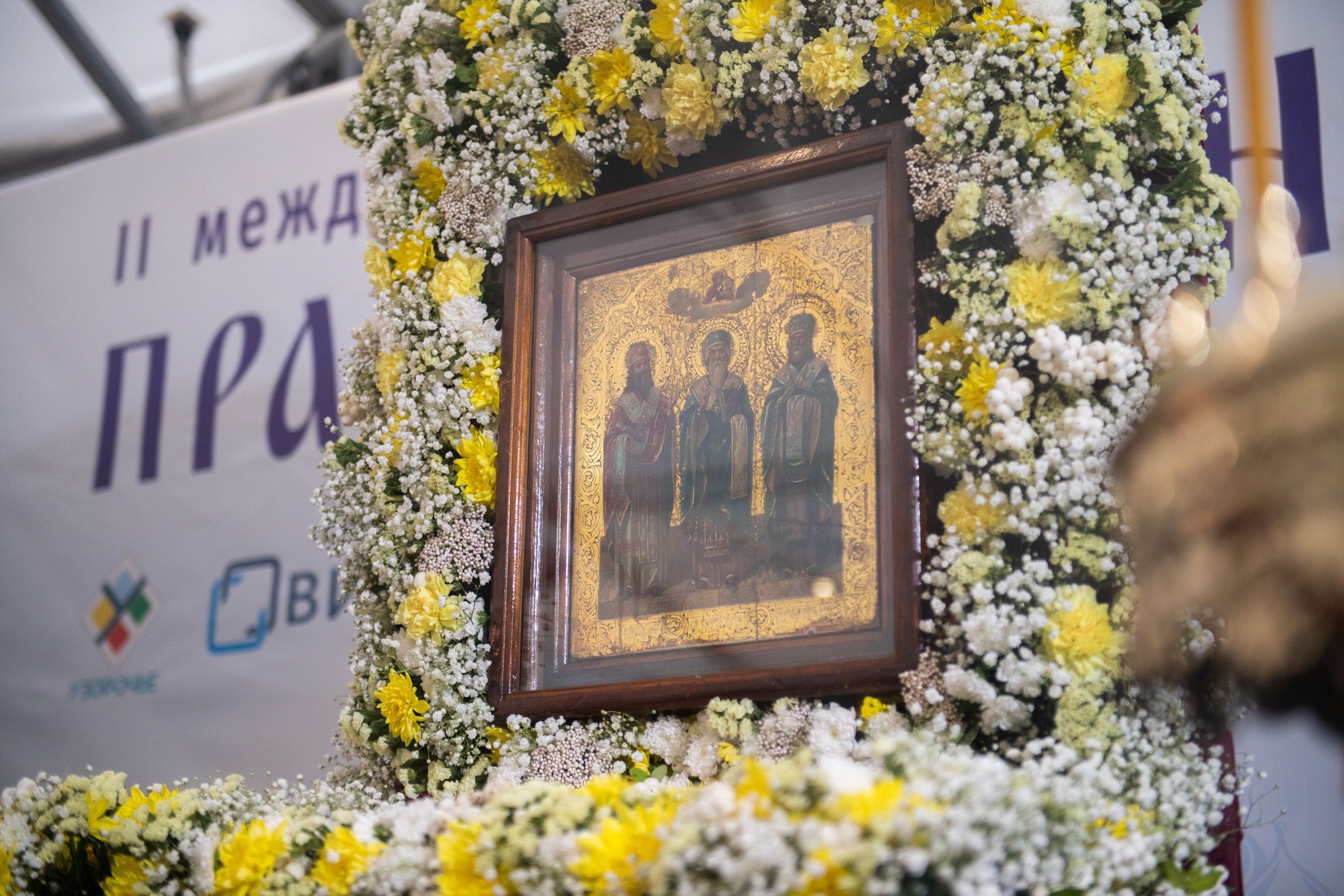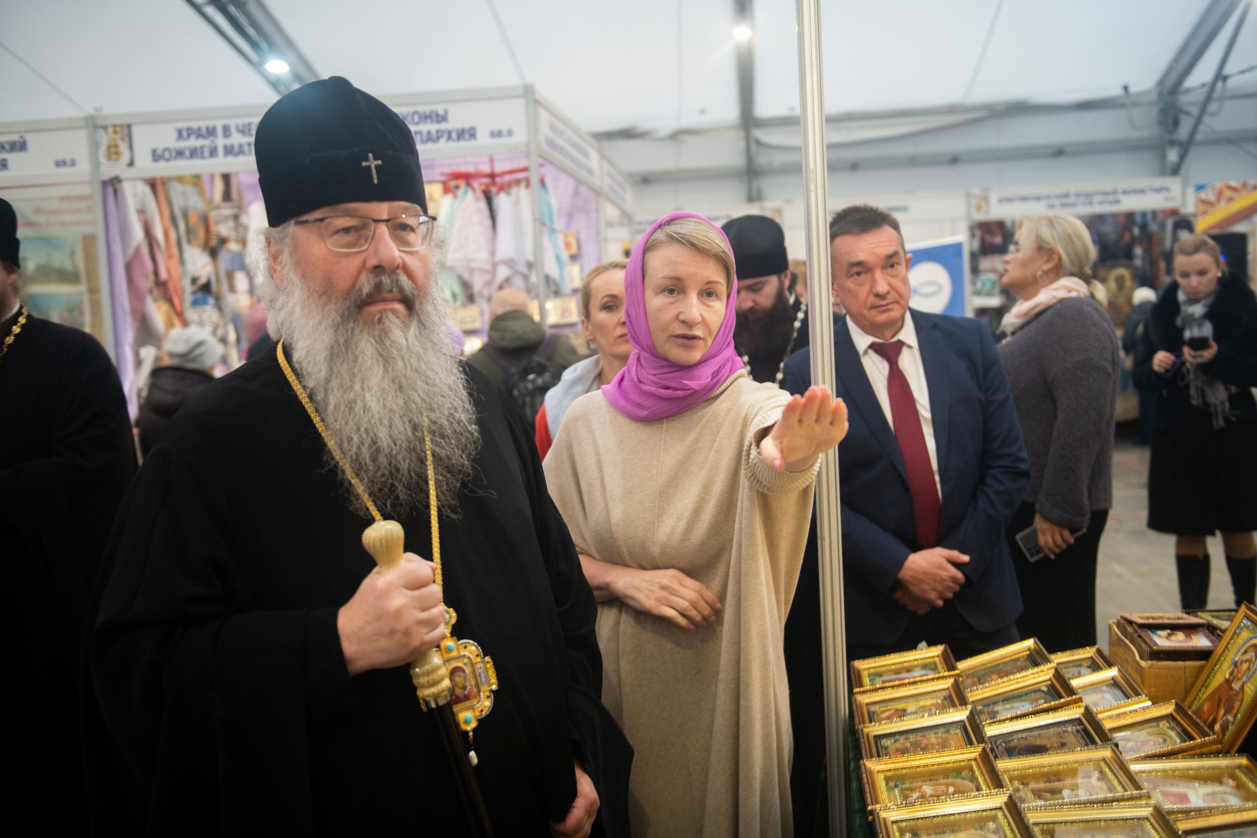 Для молитвенного поклонения верующих в павильоне ярмарки выставлены ковчег с частицами мощей святителей Гурия, Германа и Варсонофия и чтимый образ архипастырей Казанских.