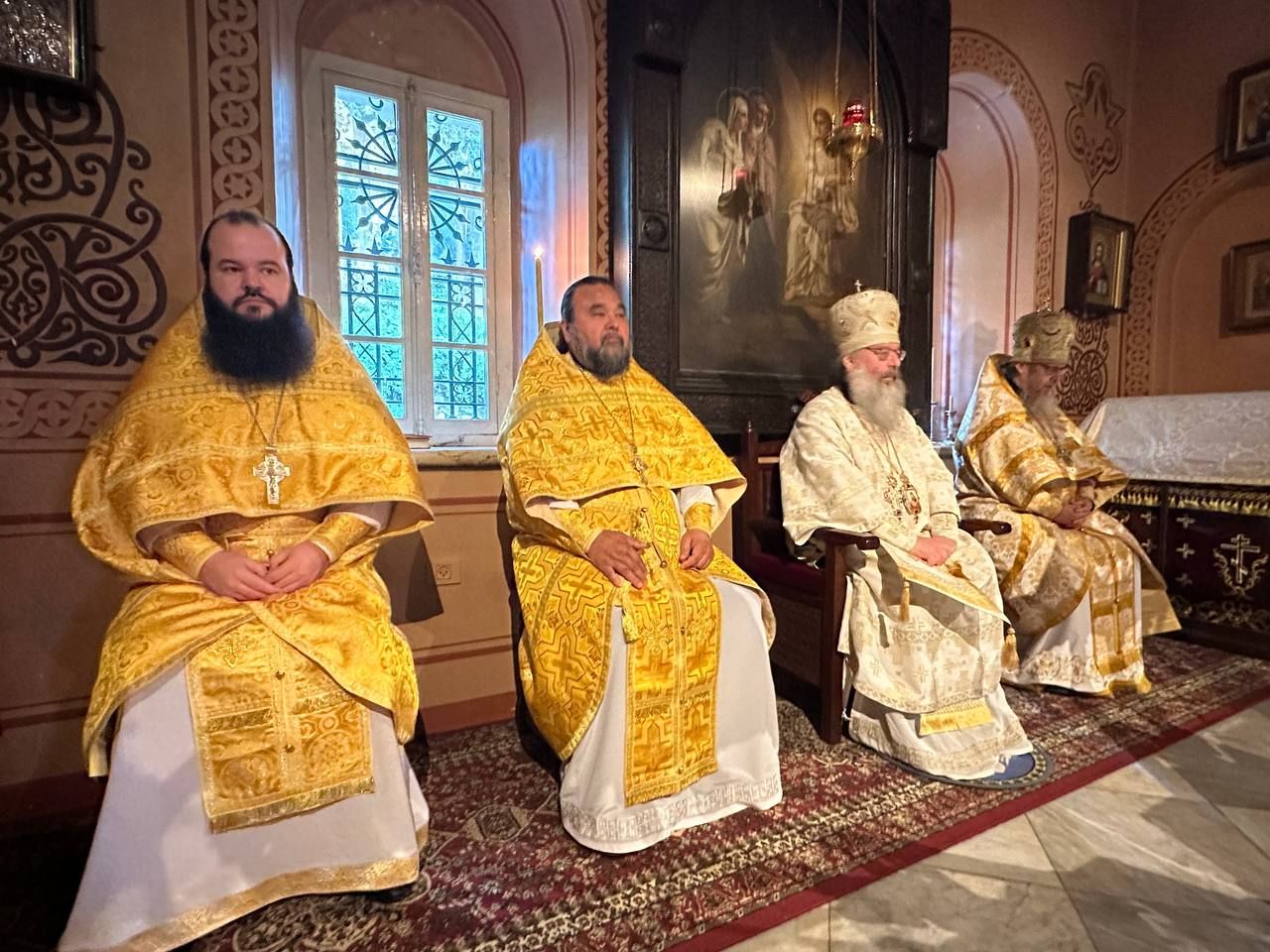 Его Высокопреосвященству сослужили начальник Русской духовной миссии на Святой Земле (Русская Православная Церковь Заграницей) архимандрит Роман (Красовский), благочинный русских храмов Новой Зеландии протоиерей Владимир Бойков, секретарь Татарстанской митрополии иеромонах Кирилл (Корытко), наместник Казанского Богородицкого мужского монастыря игумен Марк (Виленский), секретарь митрополита иеромонах Алексий (Яцейко).