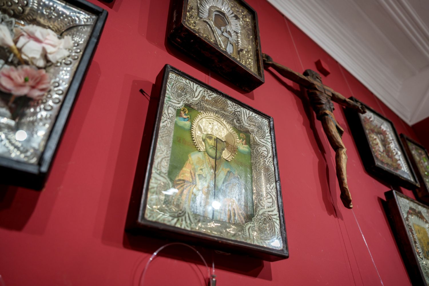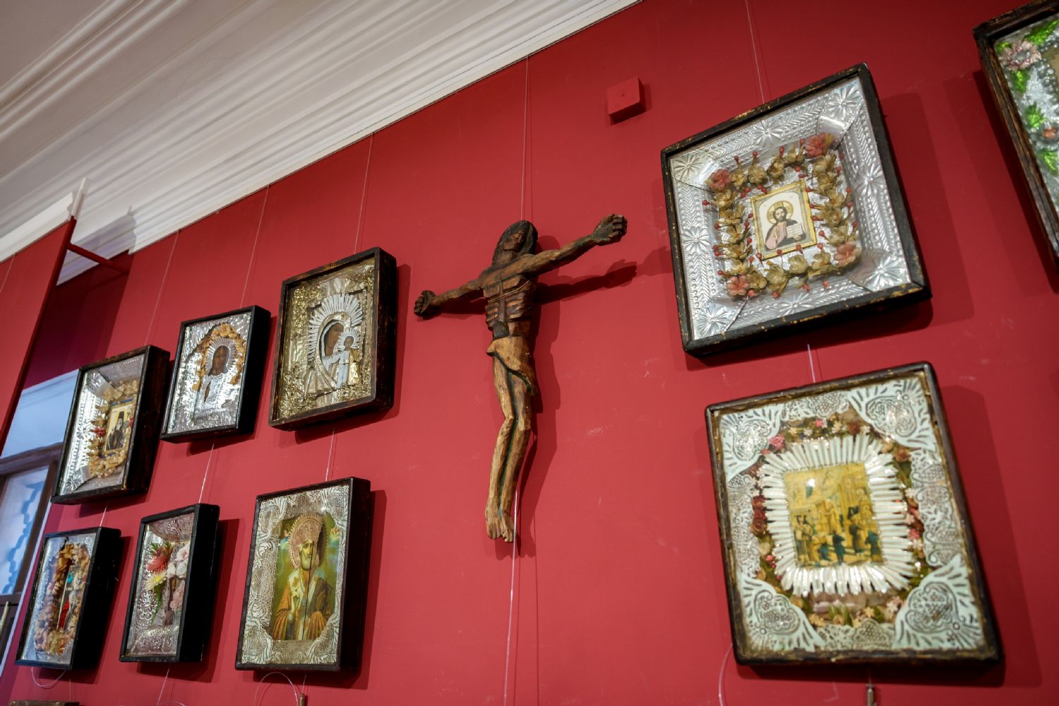 Иконы, которые здесь выставлены, напоминают о времени, когда в свободном доступе не было ни образов, ни Библии, ни молитвословов, ни псалтырей. Но люди старались сохранить веру — переписывали тексты из рукописных книг, создавали иконы, украшали их, хоть и очень скромно.