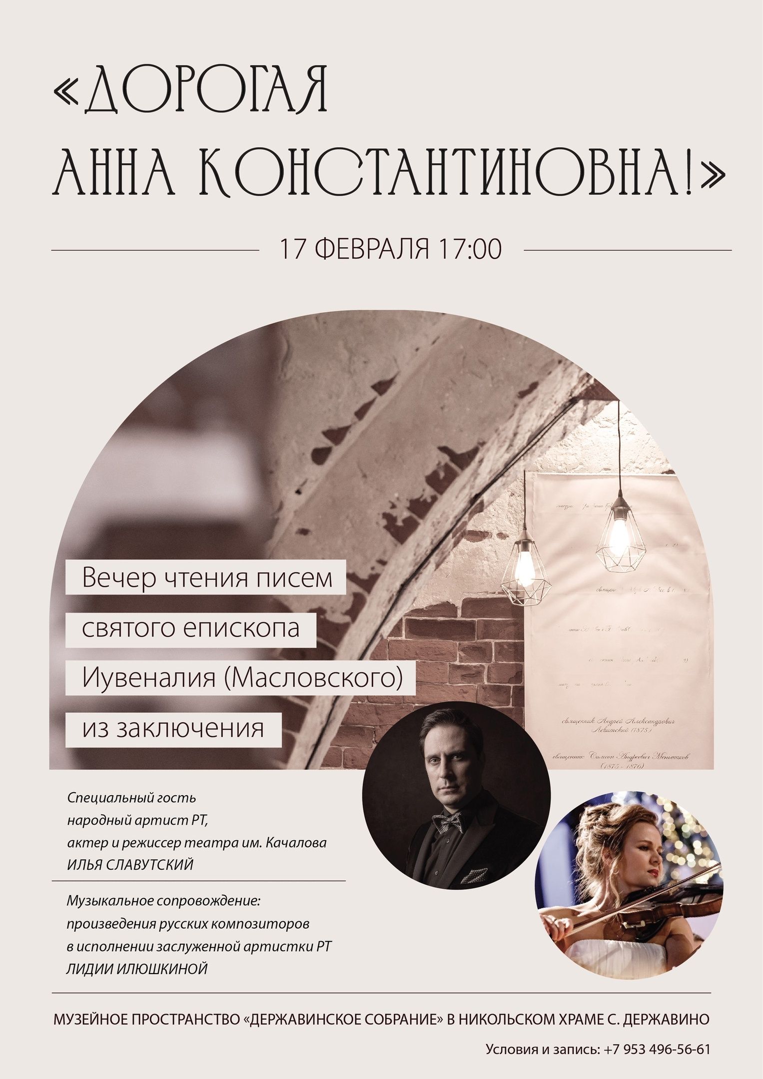 17 февраля в Музее «Державинское собрание», расположенном на территории старинного Никольского храма в селе Державино (Лаишевский район РТ), пройдёт творческая встреча, посвящённая подвигам новомучеников и исповедников Церкви Русской. На встрече будут прочитаны письма священномученика Иувеналия (Масловского), епископа Рязанского и Шацкого, которые владыка писал, находясь в заключении.
