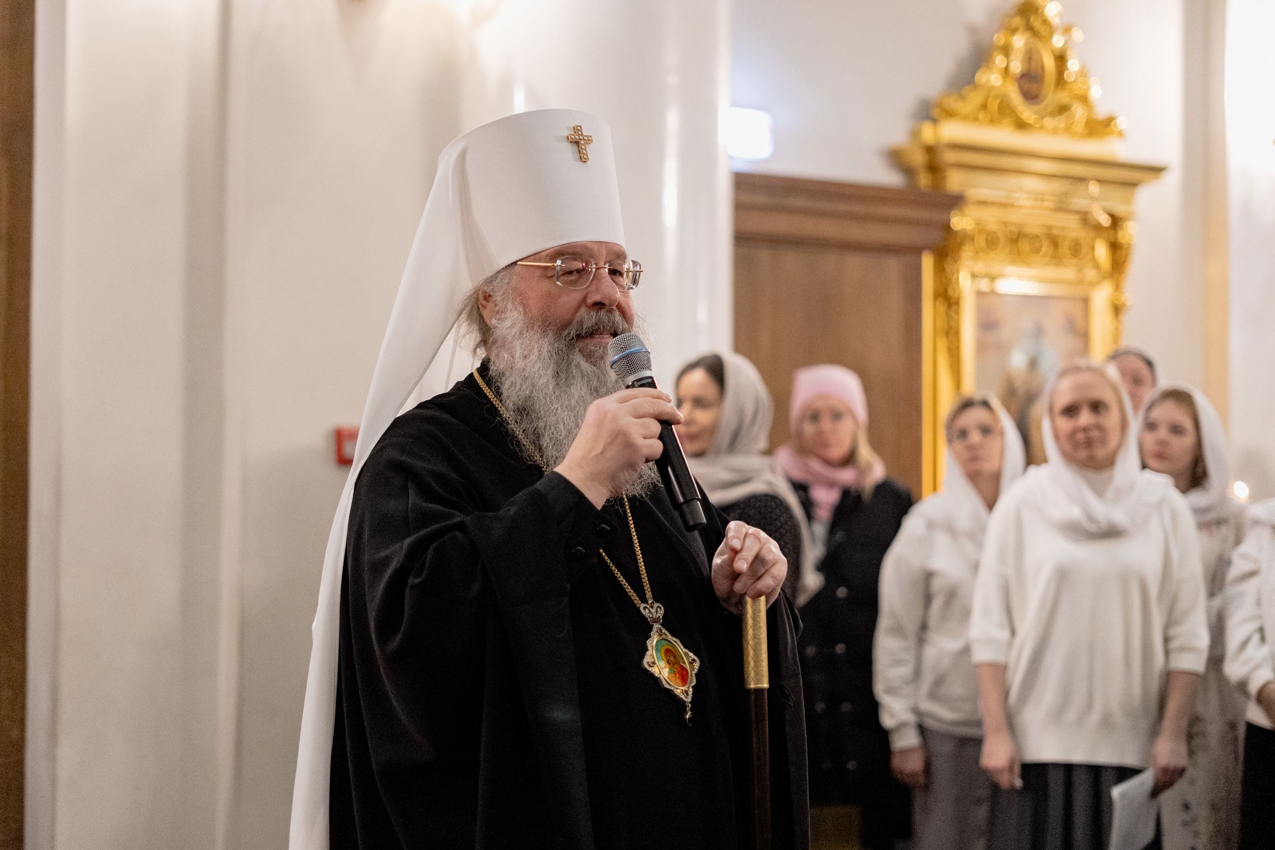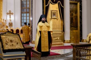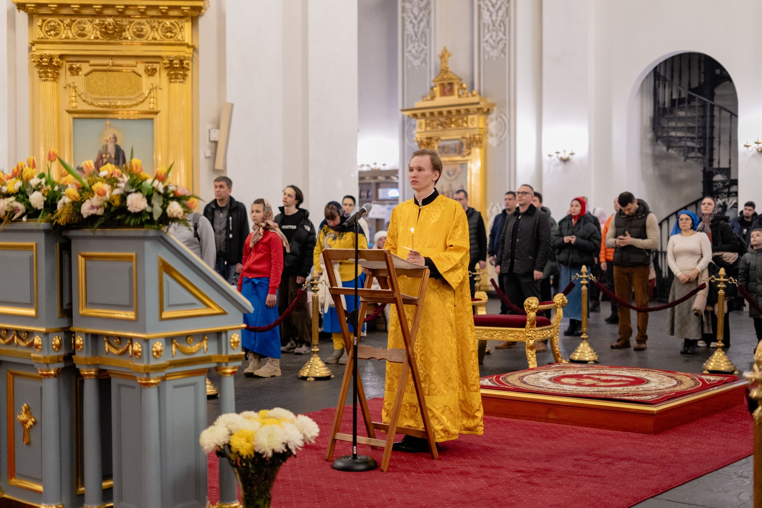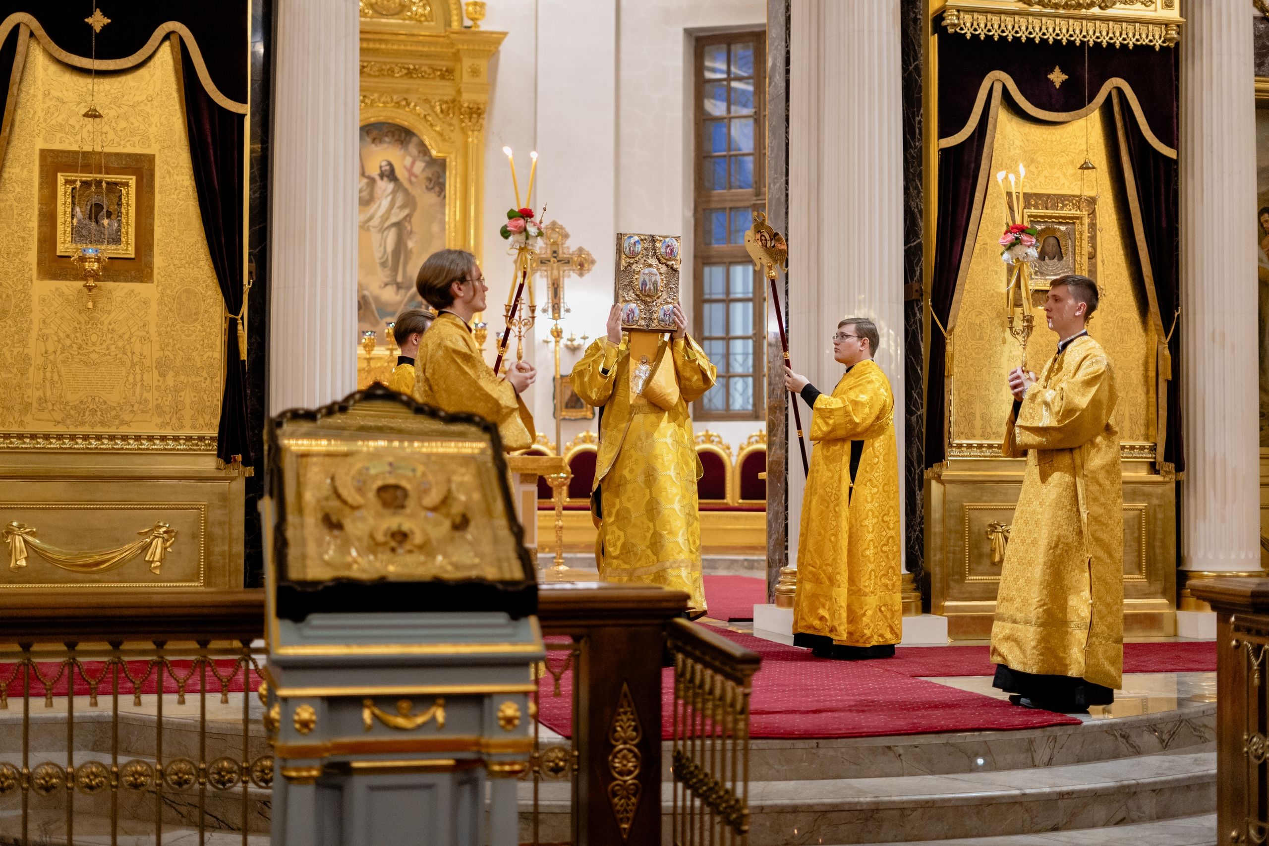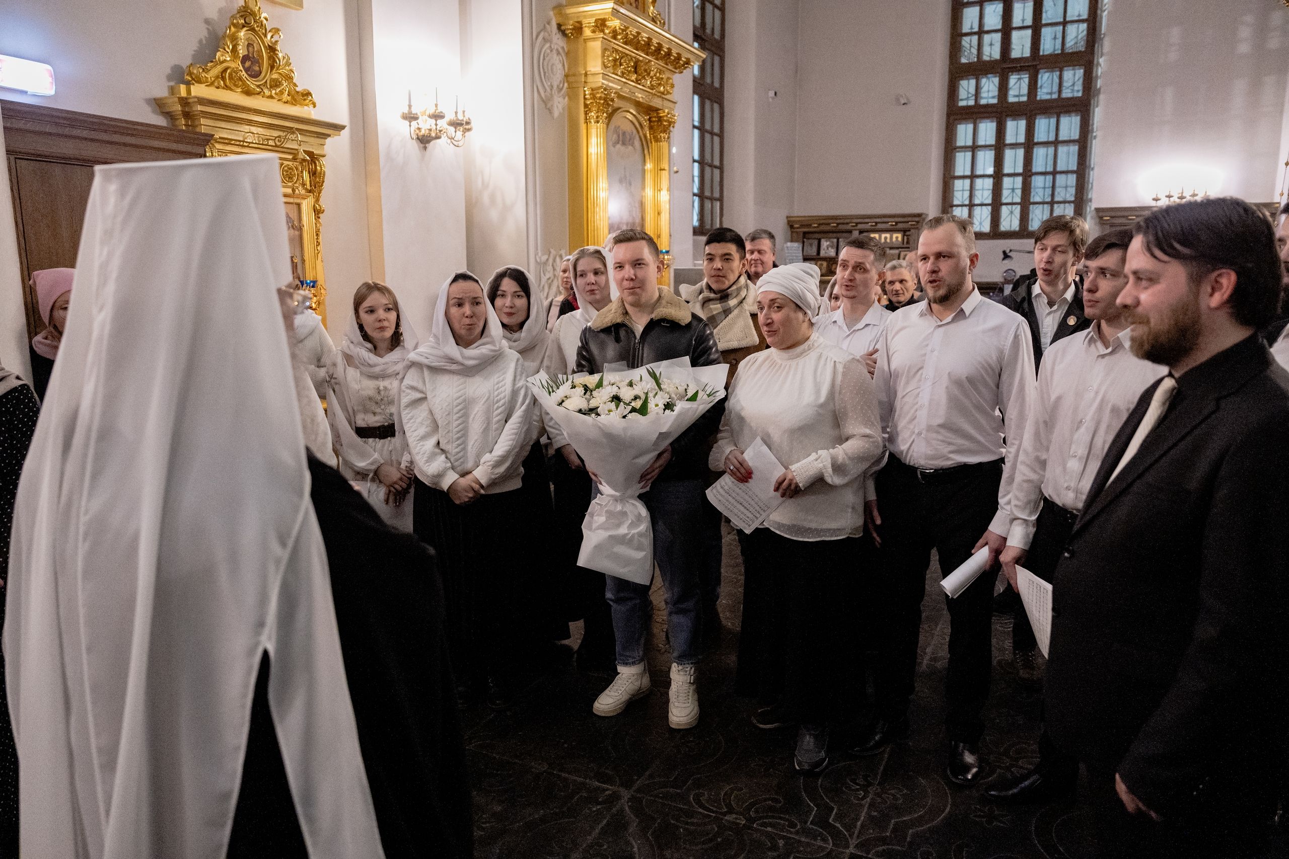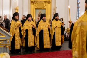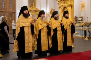 Богослужебные песнопения исполнили два архиерейских хора: мужской под управлением Дениса Рогова и смешанный под управлением Марины Литвиненко.