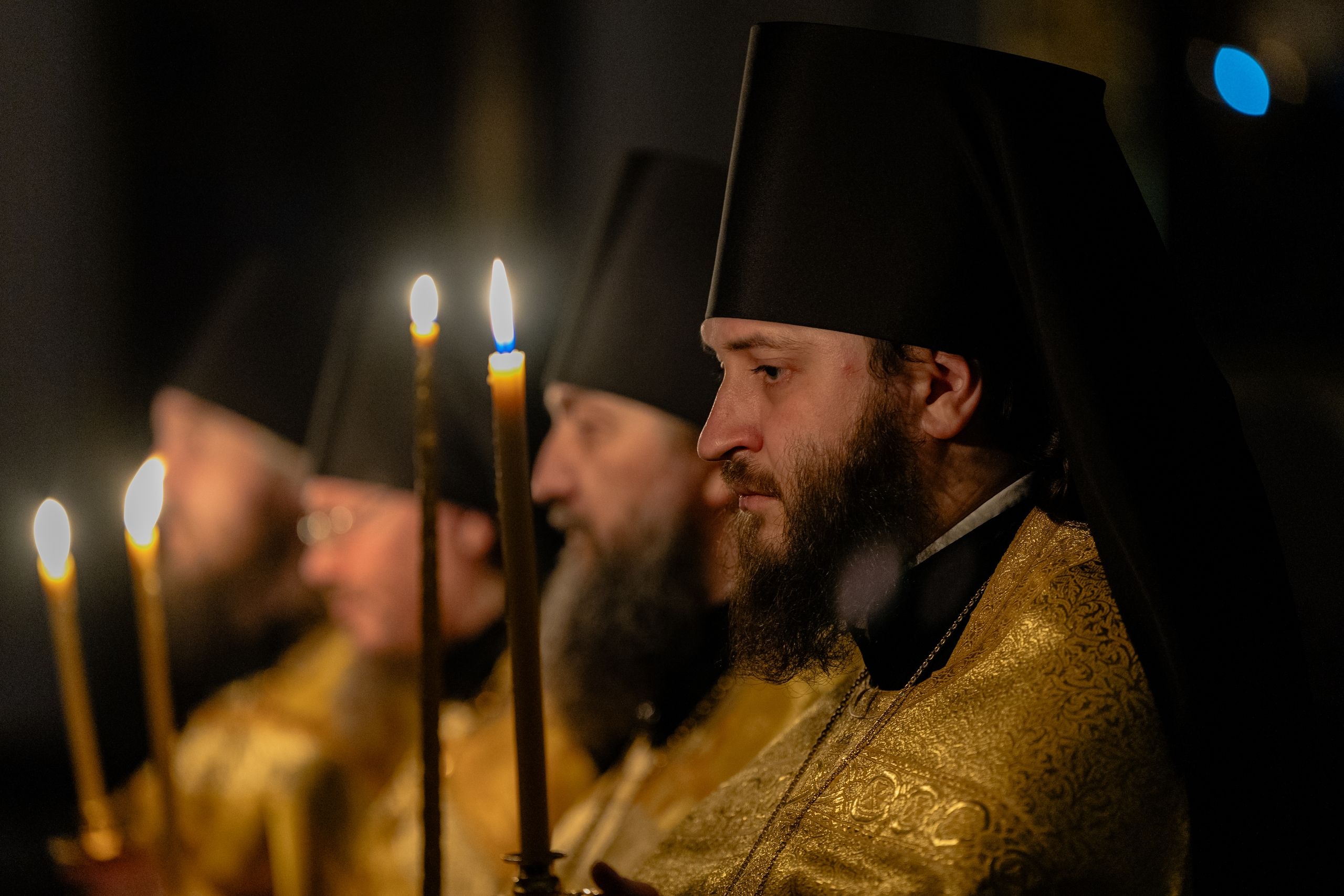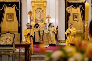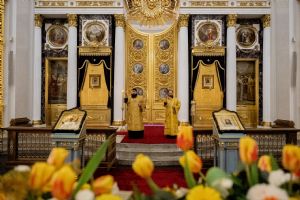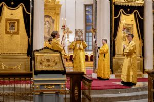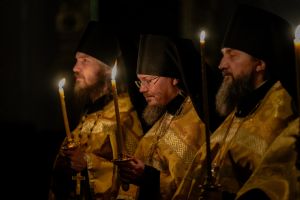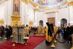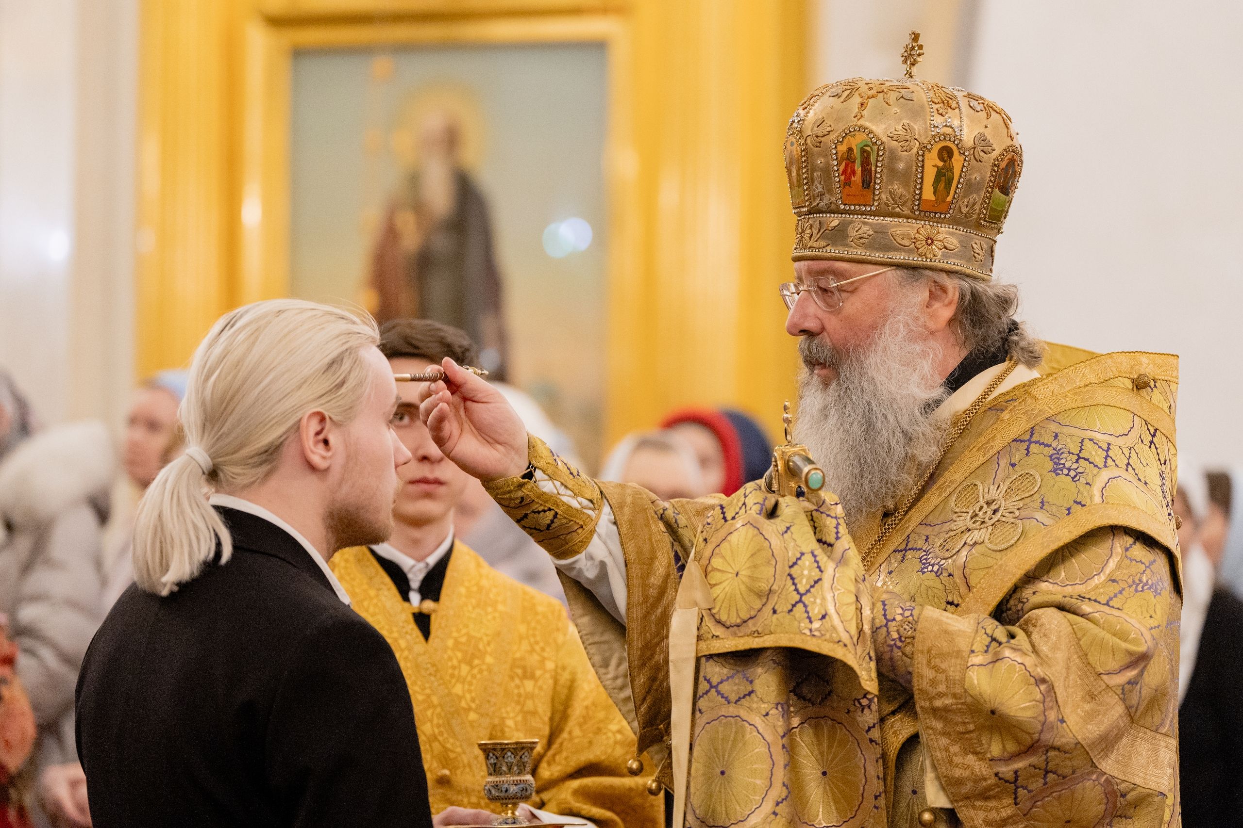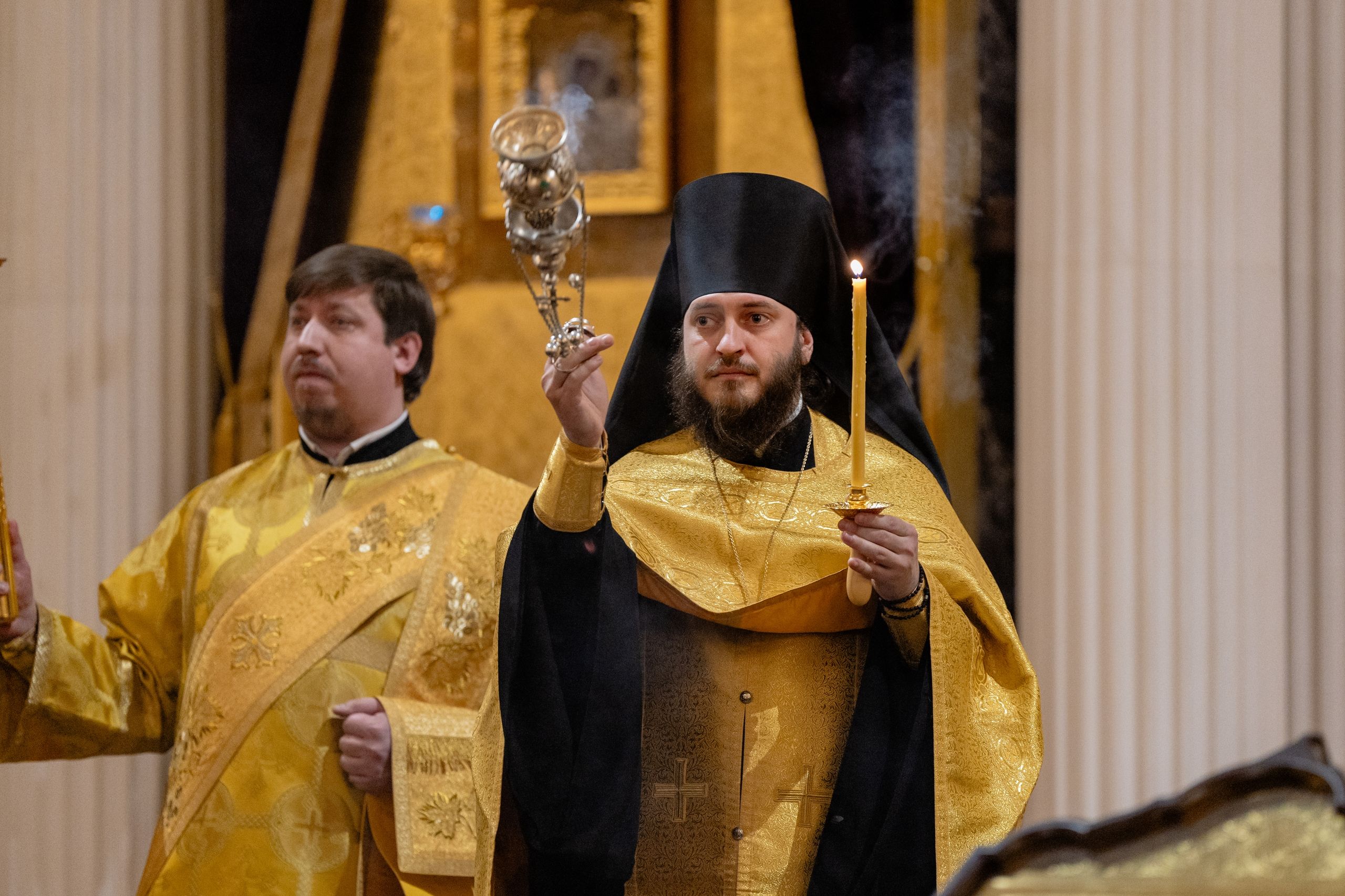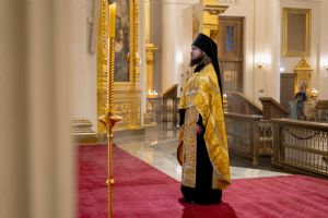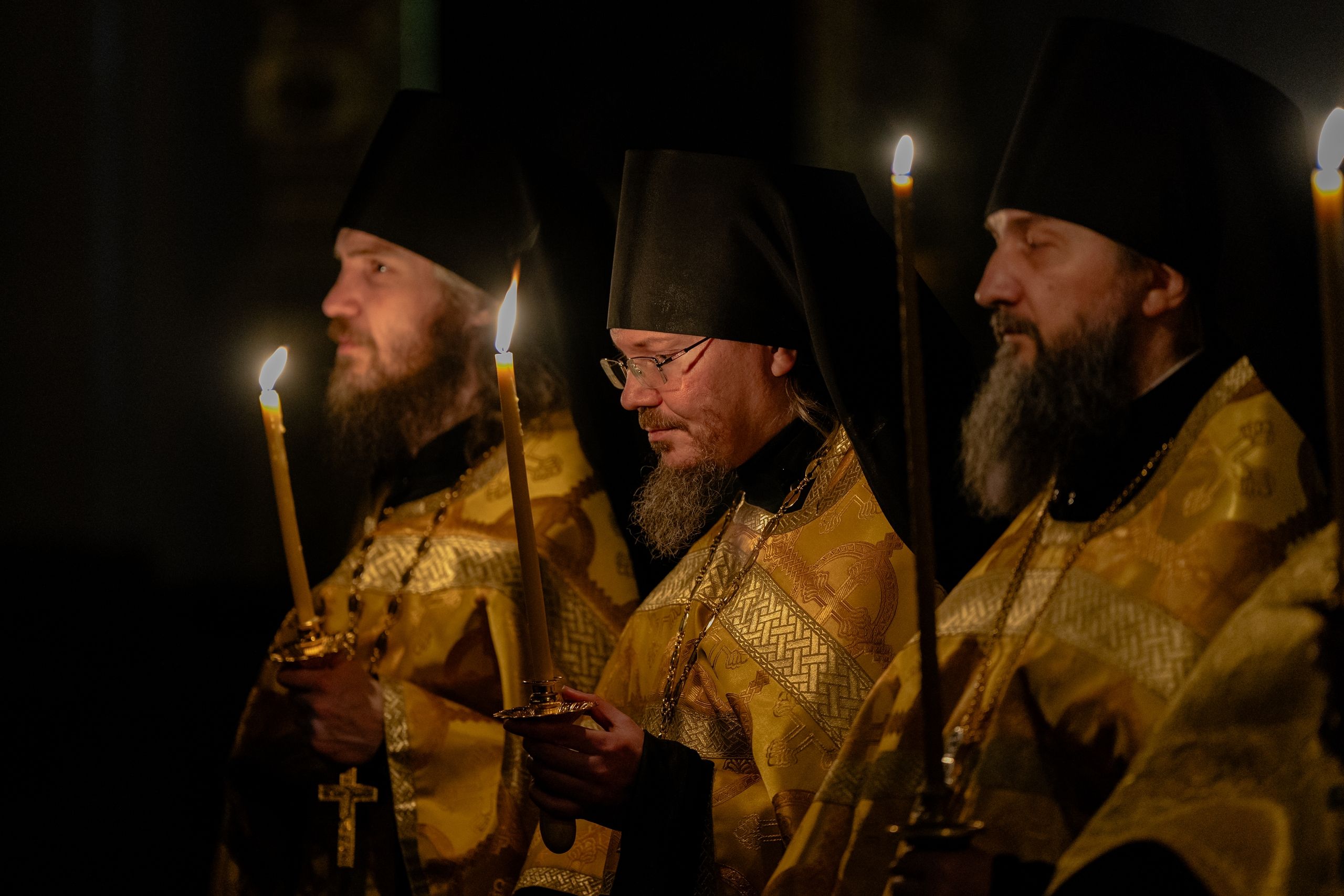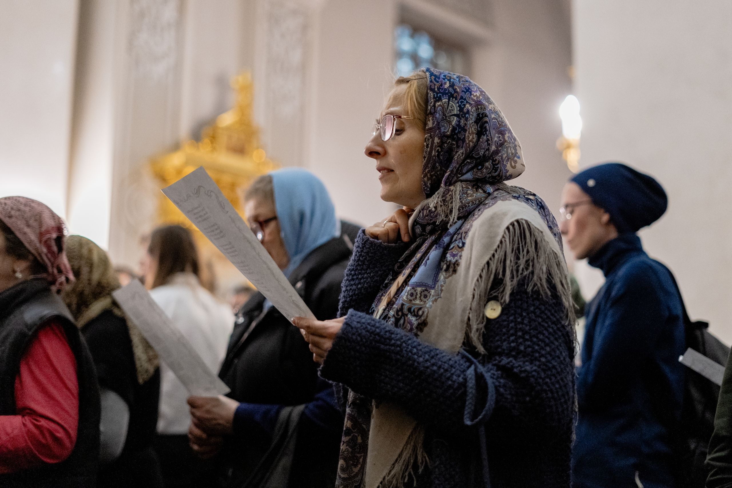 Богослужебные песнопения исполнили два архиерейских хора: мужской под управлением Дениса Рогова и смешанный под управлением Марины Литвиненко.
