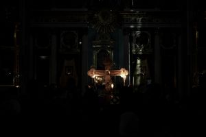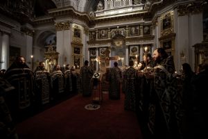 Во время пения стихиры «Тебе, одеющагося светом, яко ризою» духовенство изнесло Евангелие на середину храма. Перед Распятием был прочитан акафист спасительным Страстям Христовым.