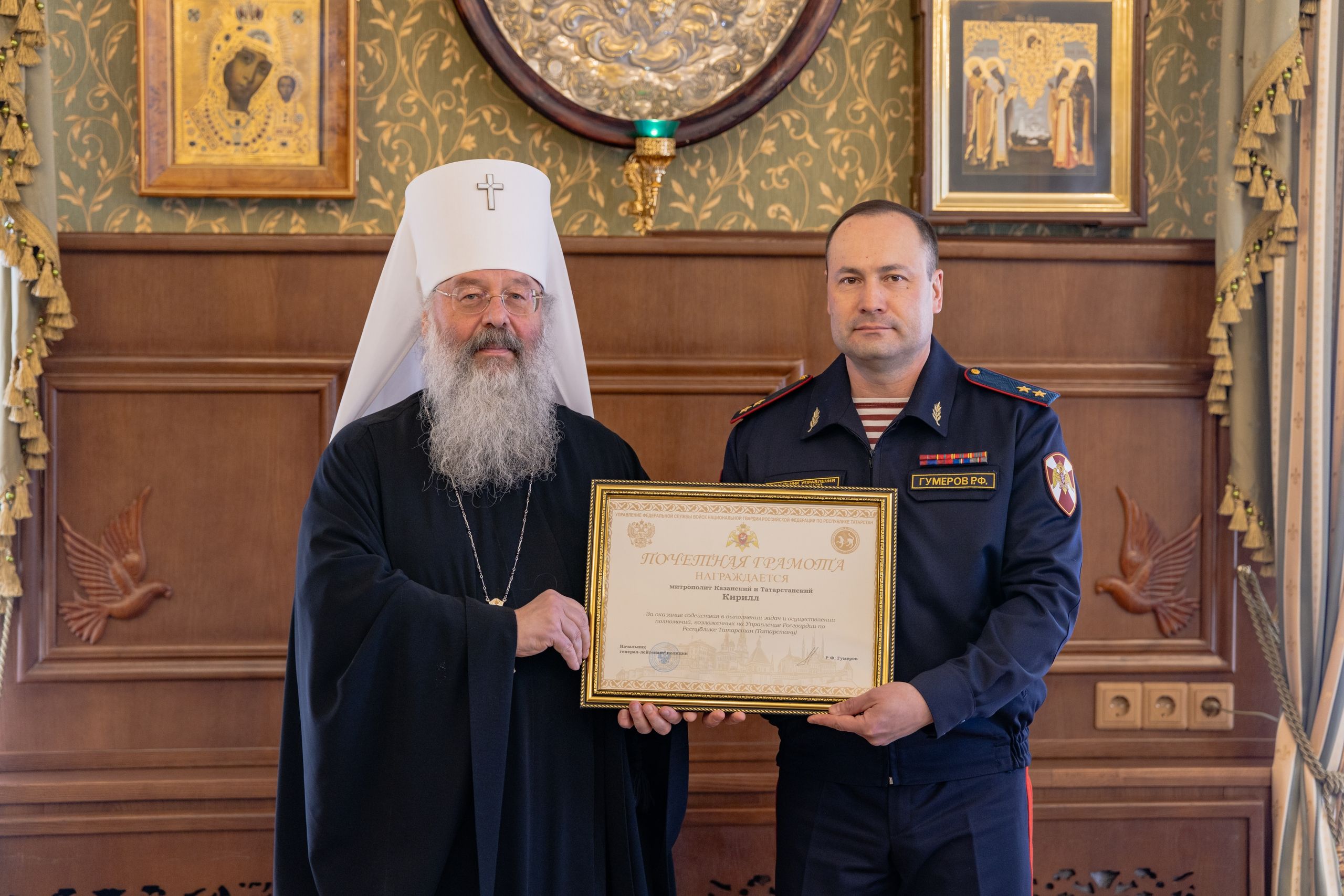 Начальник Управления Росгвардии по РТ вручил главе Татарстанской митрополии почётную грамоту за оказание содействия в выполнении задач и осуществлении полномочий, возложенных на сотрудников силовой структуры.