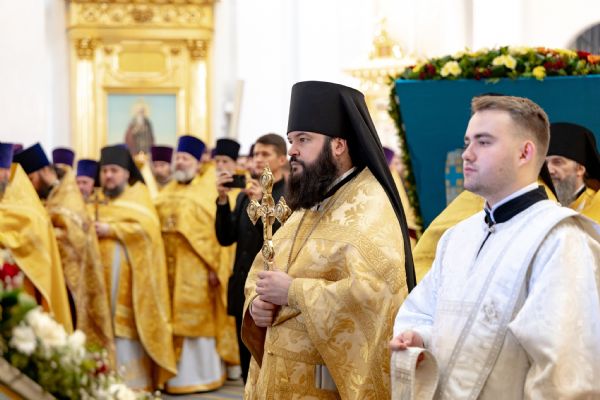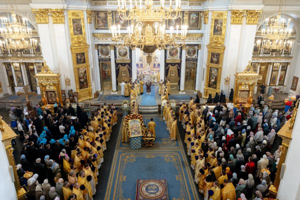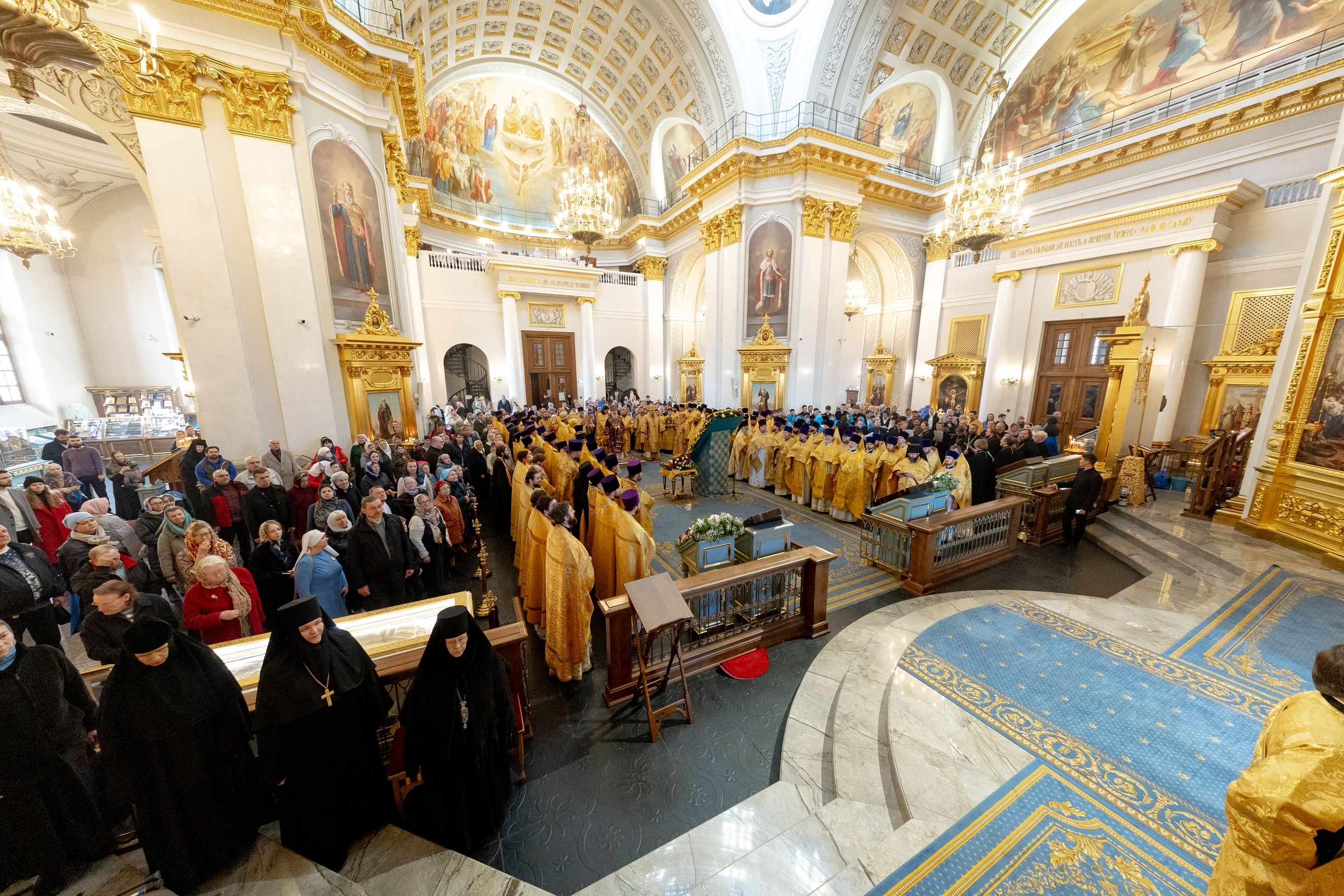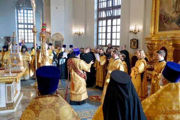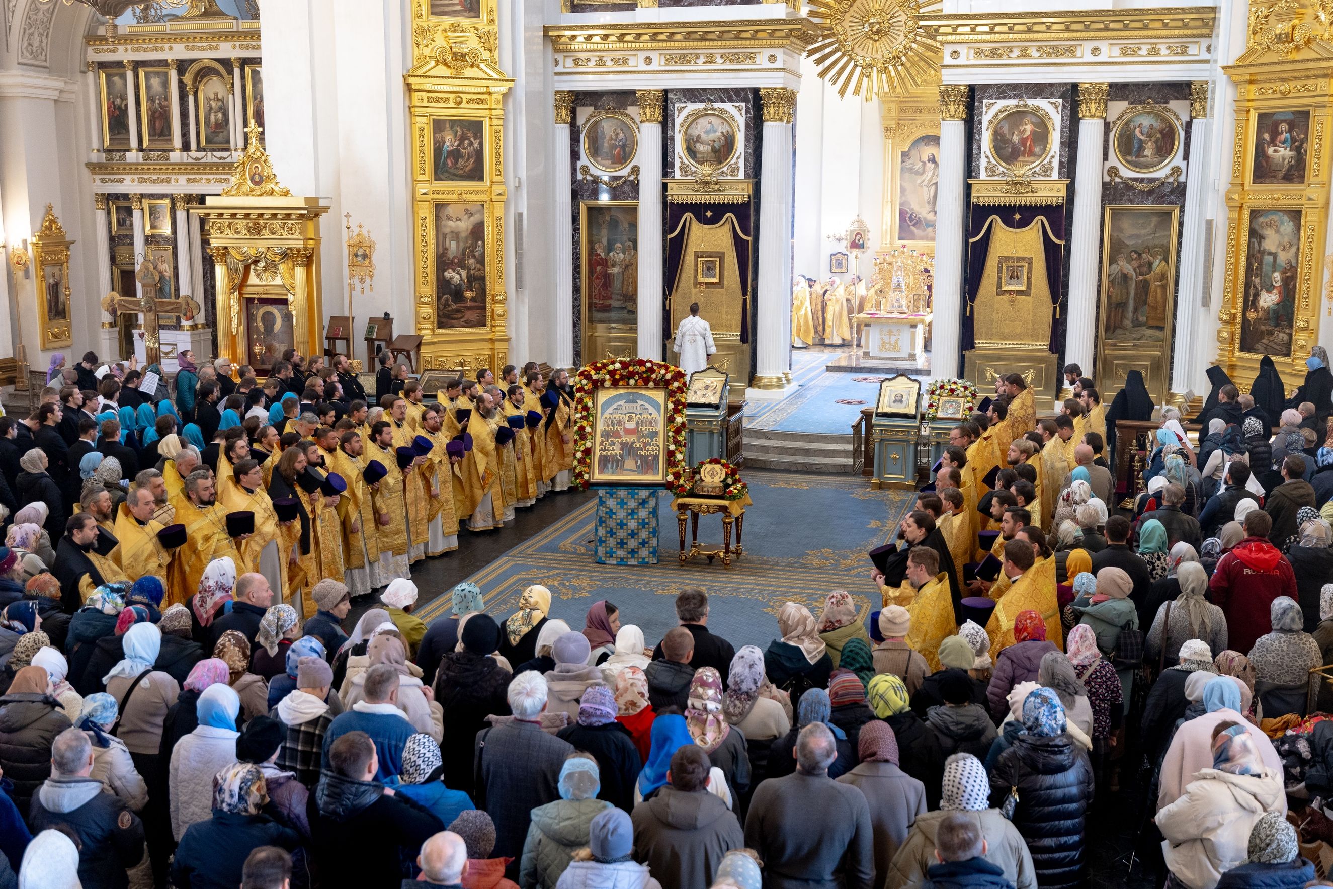 На середине храма для молитвенного поклонения верующих был установлен ковчег с частицей мощей святителя Луки Крымского, принесённый накануне в Казанский собор.