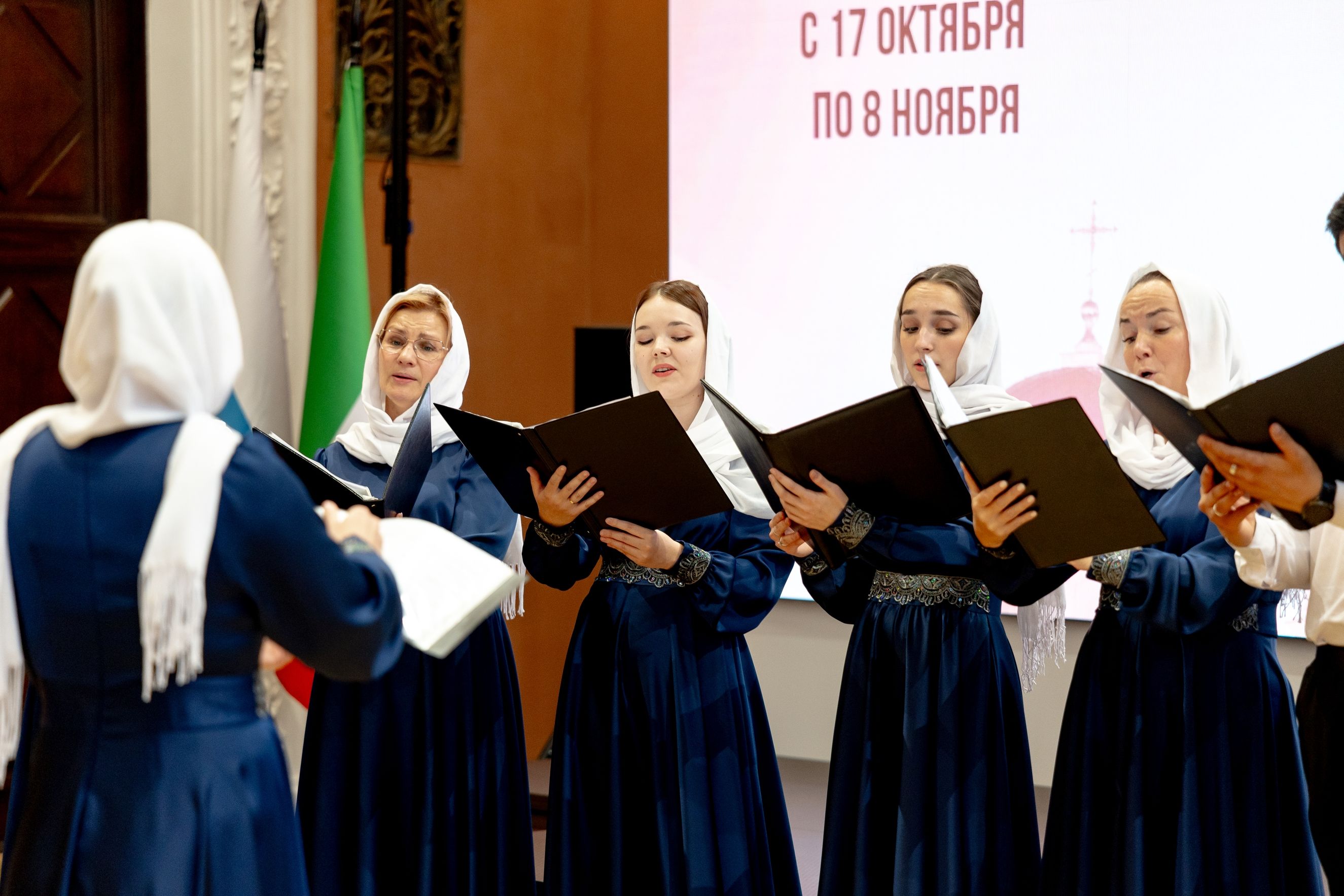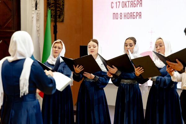 Архиерейский смешанный хор Казанской епархии под управлением Марины Литвиненко исполнил тропарь и кондак Собору Казанским святым.