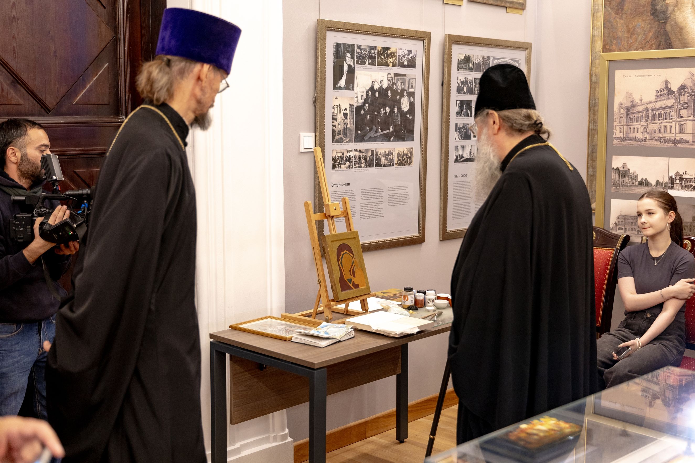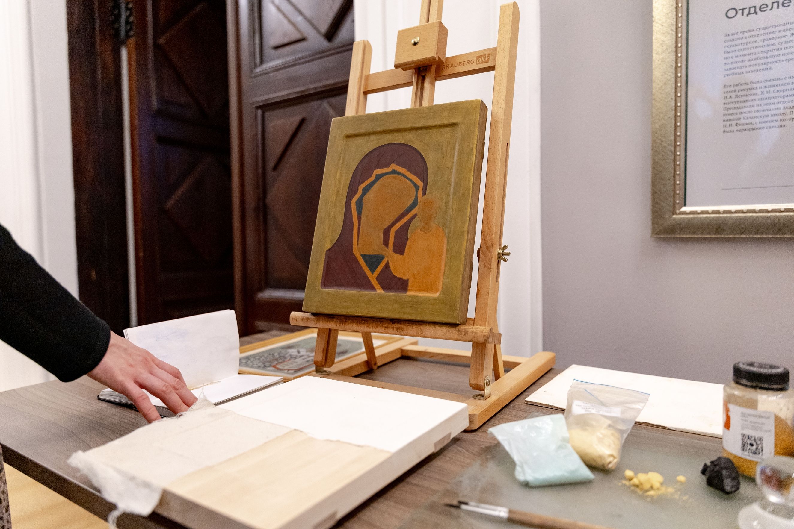 Когда мы составляли выставку, у меня было ощущение, будто бы эти иконы здесь всегда и были, будто бы этот зал специально создан для того, чтобы они здесь находились. Интересно, что новейшая история училища тесно связана с иконописью. Вместе с отцом Святославом (Мирганиевым — Ред.) в нашем училище училась Гуля Шакирова, по эскизам которой расписан Владимирский собор в Новом Херсонесе. Несколько наших выпускниц отправились за профессиональными знаниями и навыками на иконописные факультеты Московской духовной семинарии в другие духовные школы нашей страны.
