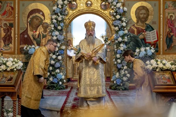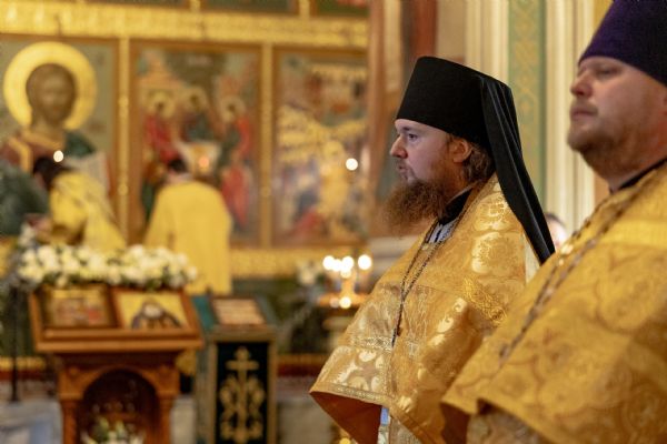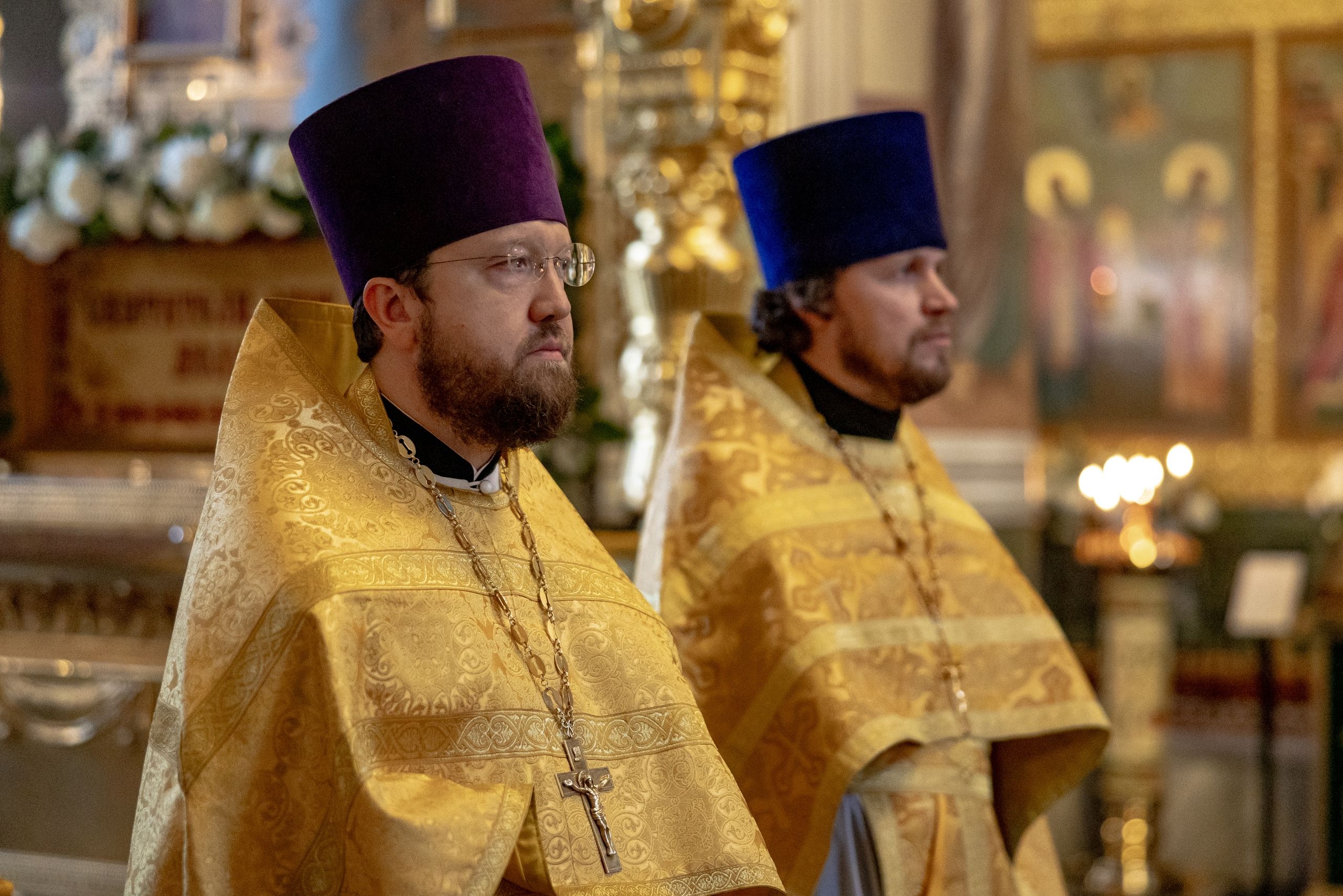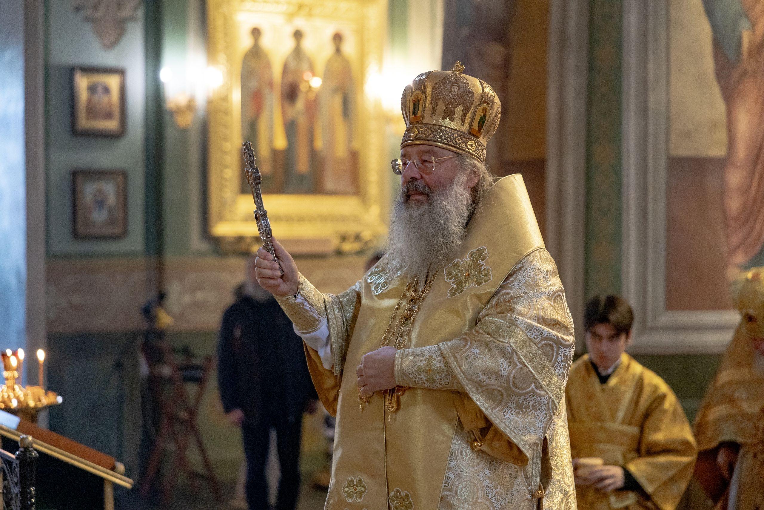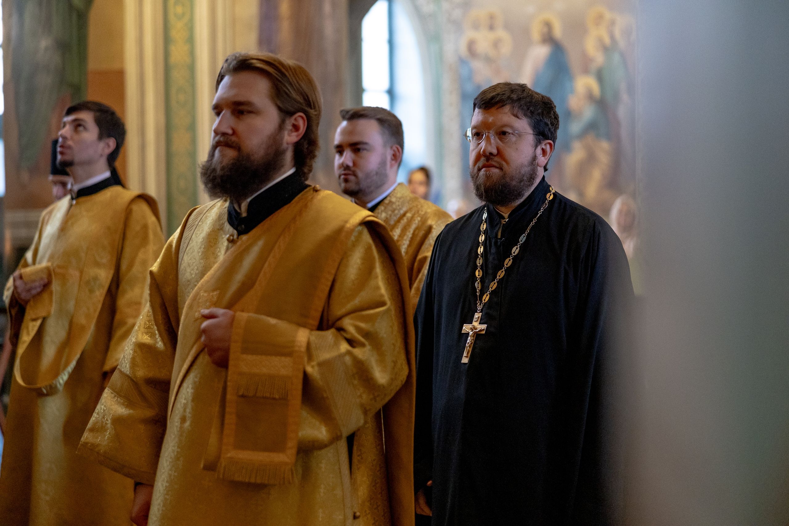 Его Высокопреосвященству сослужили благочинный I округа города Казани протоиерей Владимир Самойленко, ключарь Благовещенского собора иерей Виктор Бельских, клирик храма благоверного князя Александра Невского города Казани протоиерей Александр Хохлов, насельник Казанского Богородицкого монастыря иеромонах Иларион (Шпаков), клирик Иоанно-Предтеченского собора города Екатеринбурга иерей Петр Муратов.