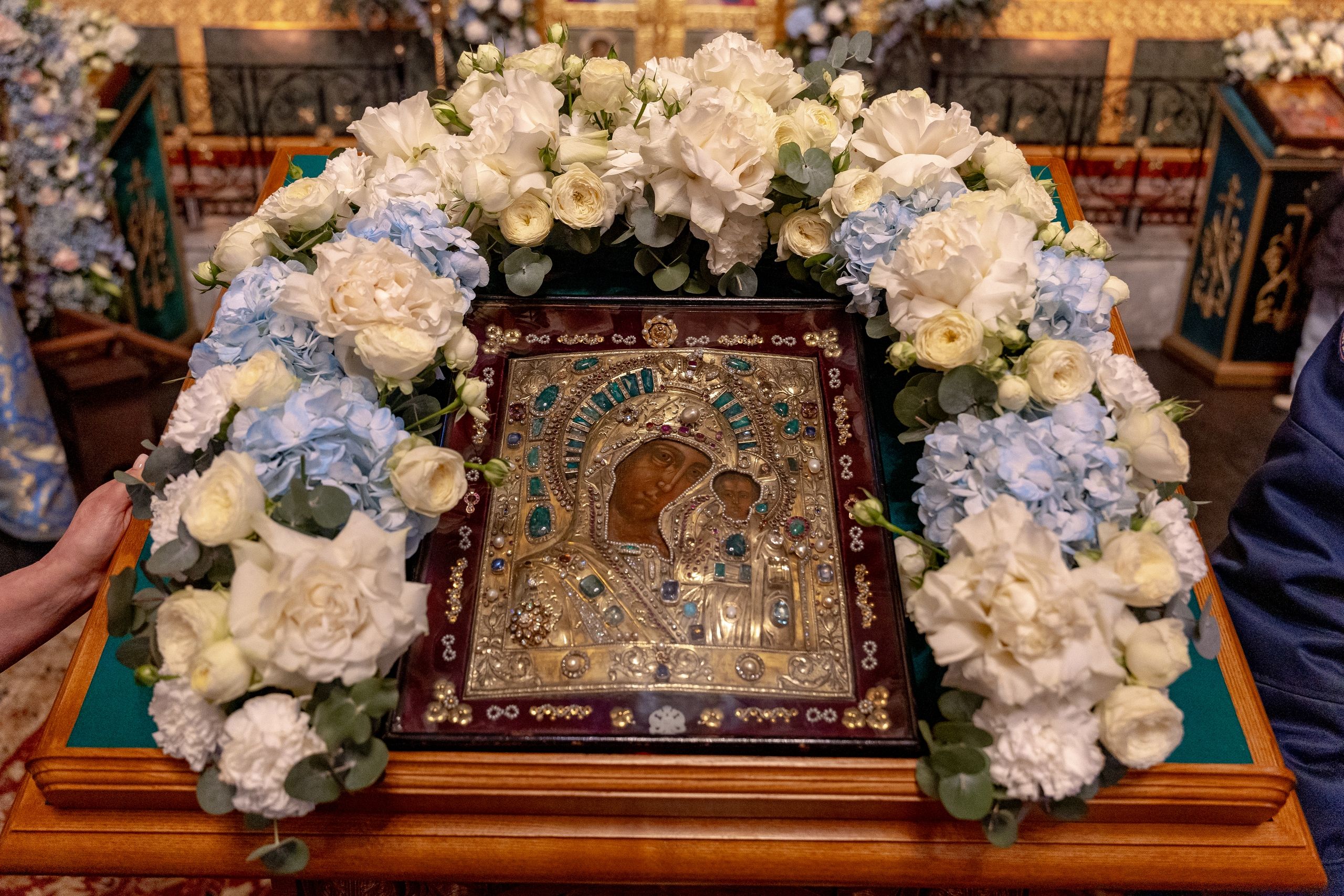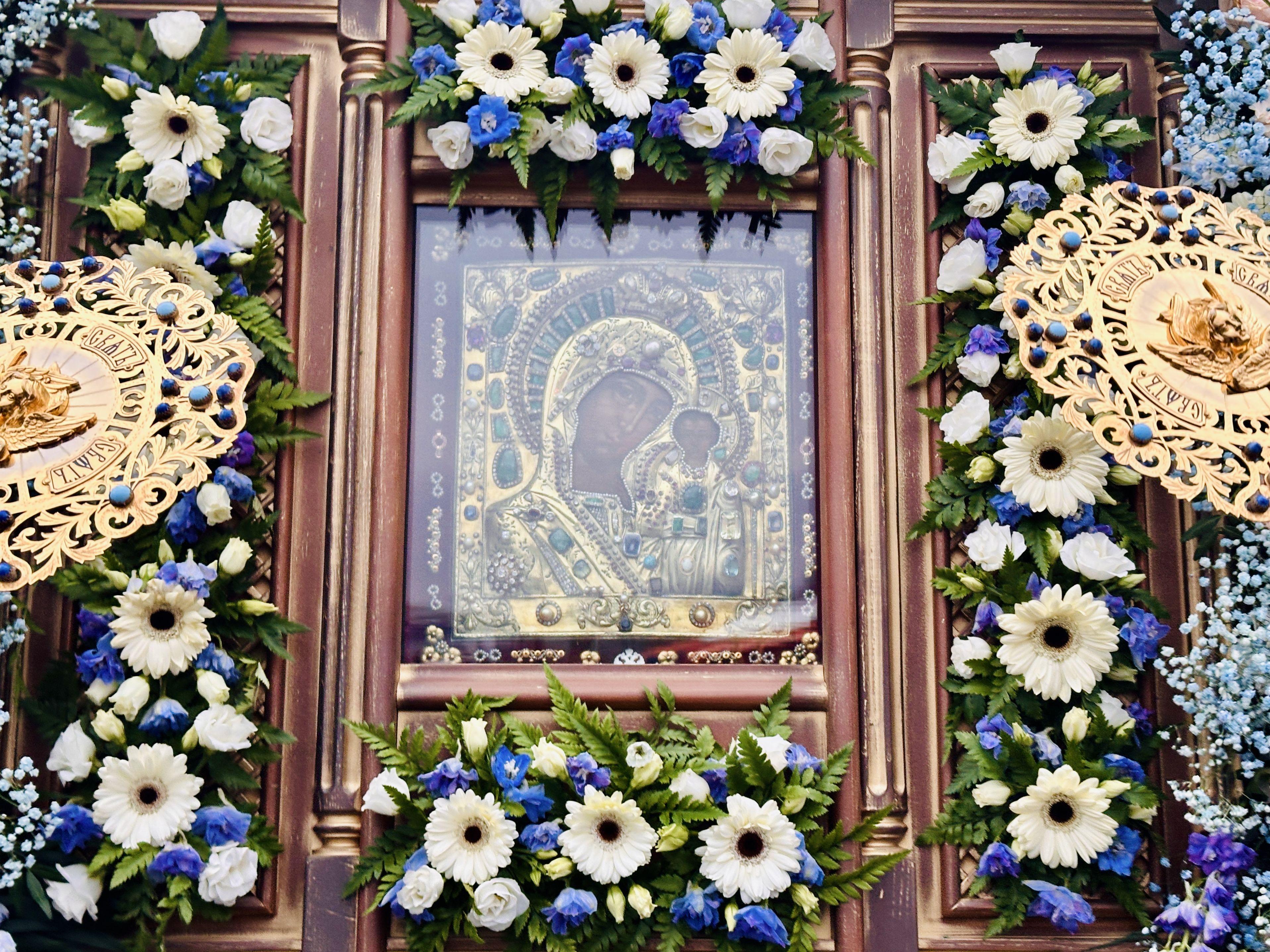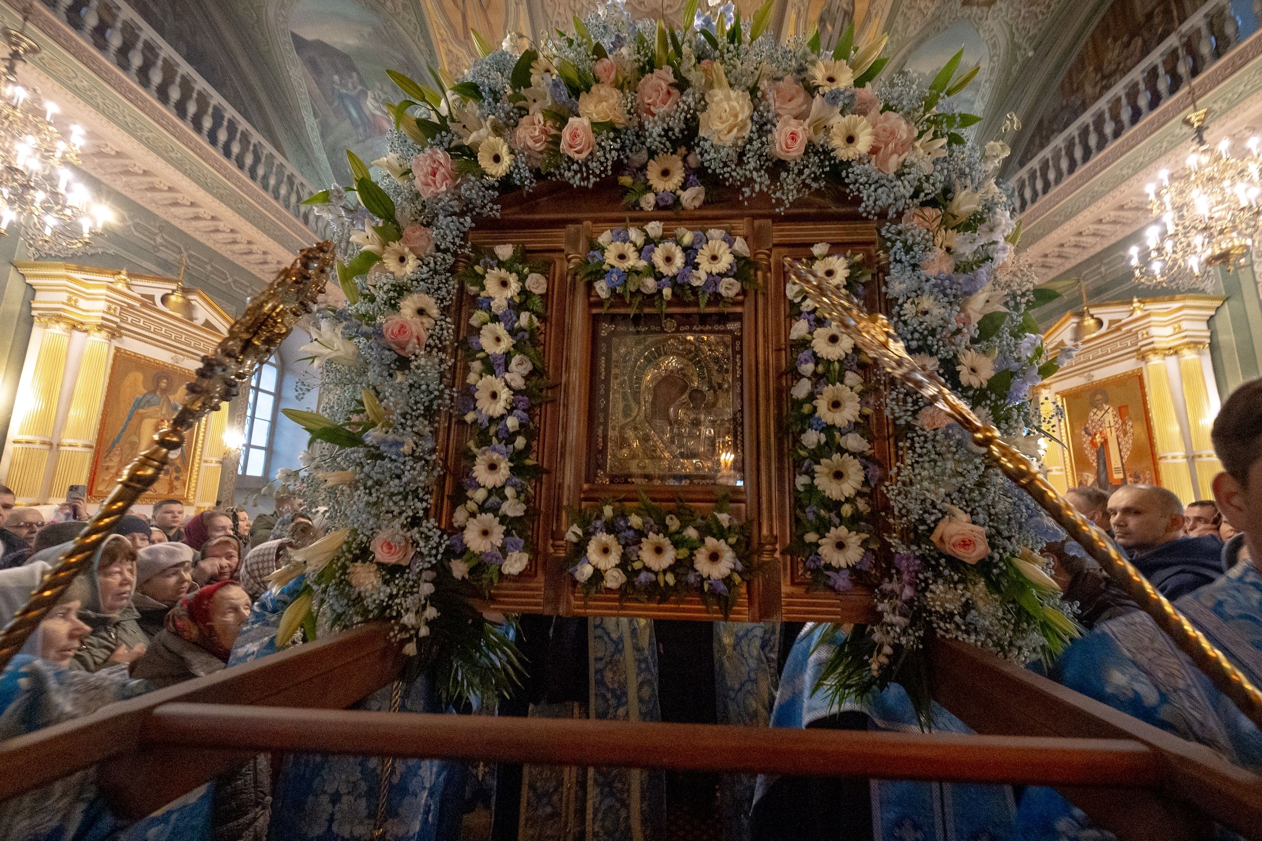 Казанская икона Божией Матери была внесена в воссозданный Казанский кафедральный собор. После принесения святыни на место её обретения в Казанском соборе началось служение Божественной литургии.