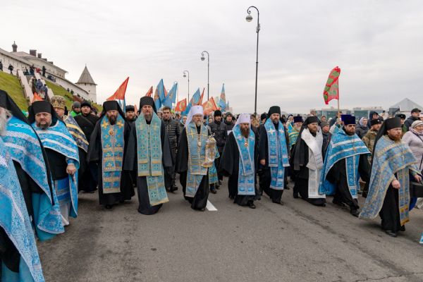 Молитвенное шествие по традиции началось у стен древнего Благовещенского собора Казанского кремля и завершилось в Казанском Богородицком монастыре, на месте обретения в 1579 году главной святыни Казанского края. Перед началом крестного хода в соборе Благовещения Пресвятой Богородицы был совершён молебен Царице Небесной. Богослужение совершил сонм архиереев, прибывших в Казань для участия в церковных торжествах по случаю праздника Казанской иконы Божией Матери.